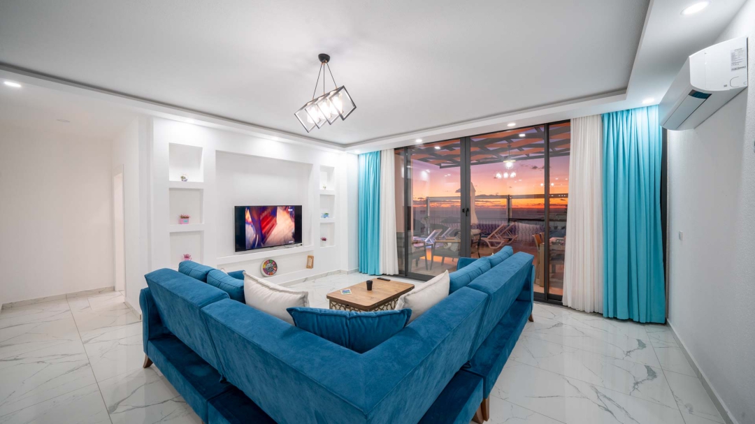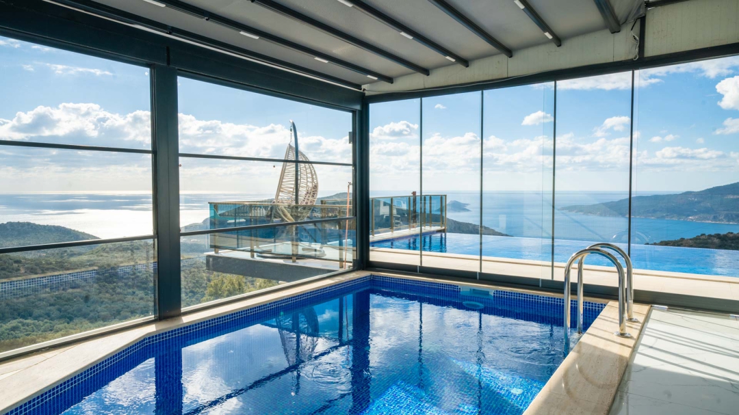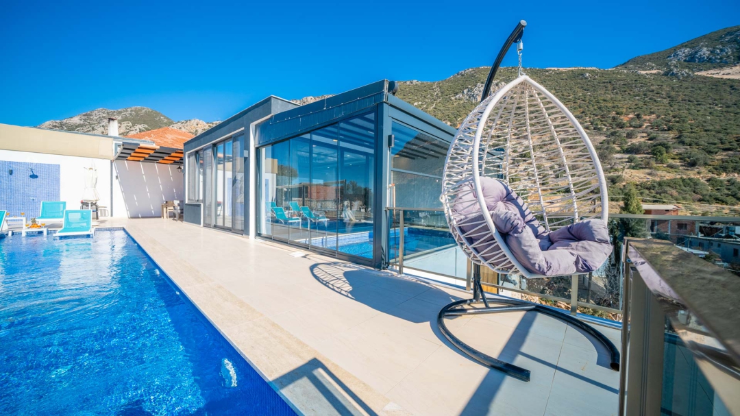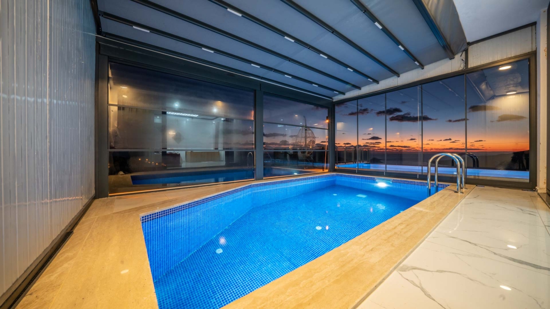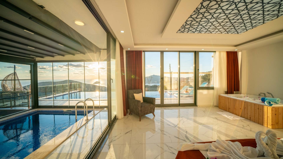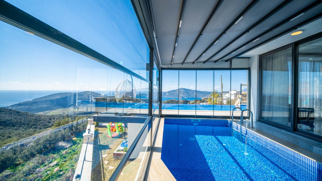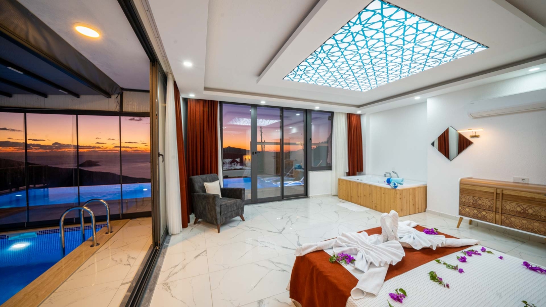 Kördere bölgesinde yer alan daire, özel havuz ve kapalı havuza sahiptir. Misafirlerine muhteşem bir deniz manzarası sunabilecek lokasyondadır. Misafirlerinin güzel vakit geçirmesi adına masa tenisi, langırt gibi donanımlarla zenginleştirilmiştir.