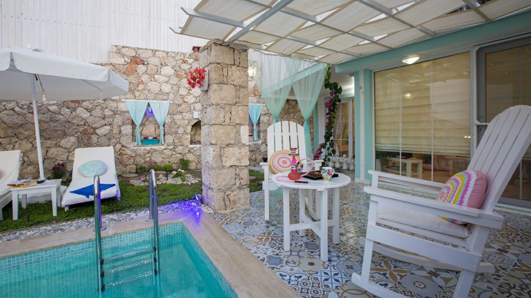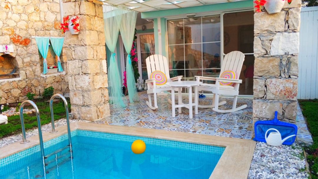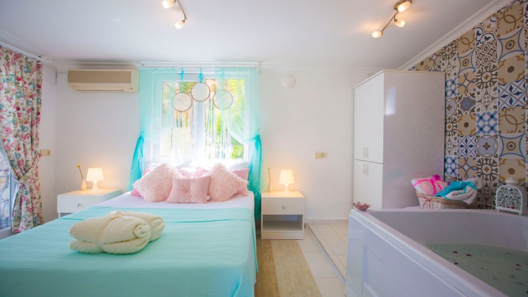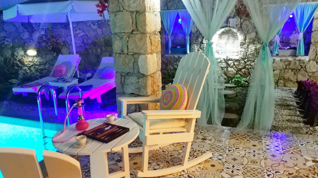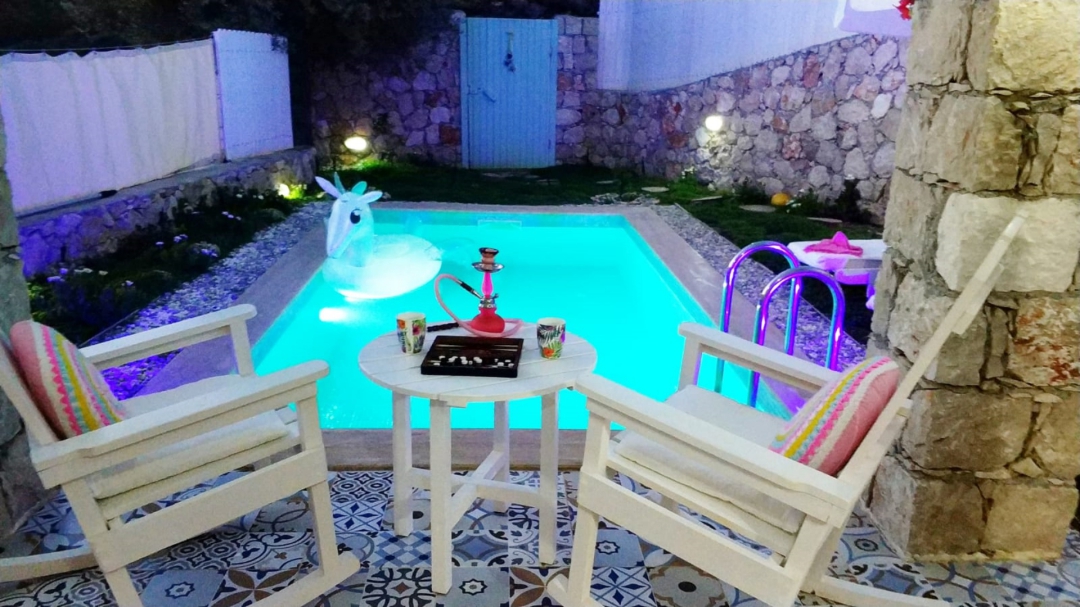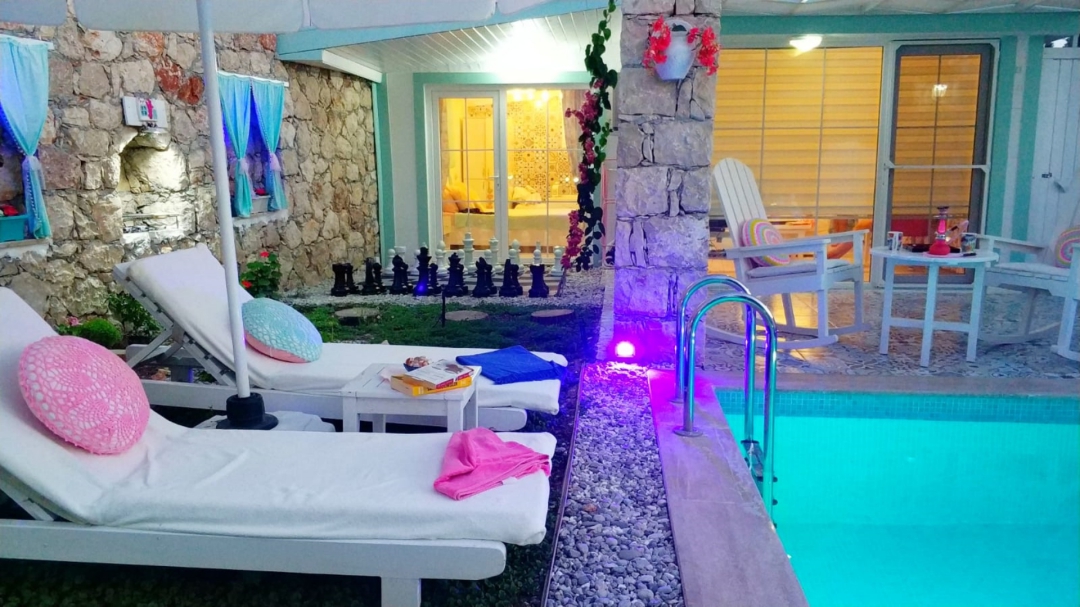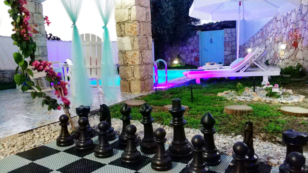 Balayı konseptindeki yapı, Akbel bölgesinde konumlanır. Havuz alanı korunaklıdır. Dış havuzu ısıtmalıdır. Kendine has çizgiler taşıyan yapı jakuzilidir.