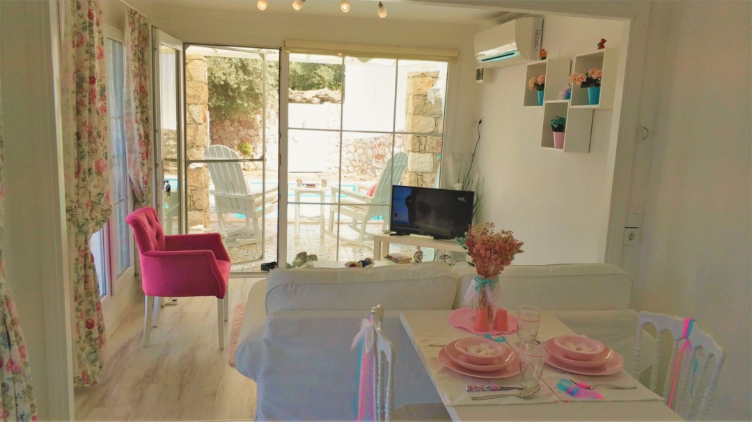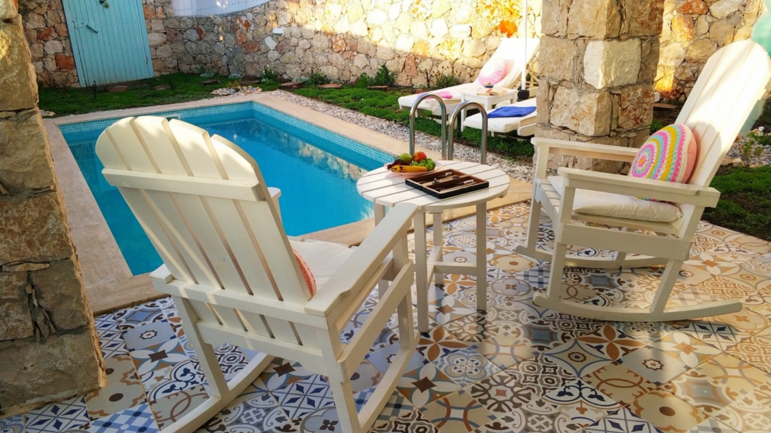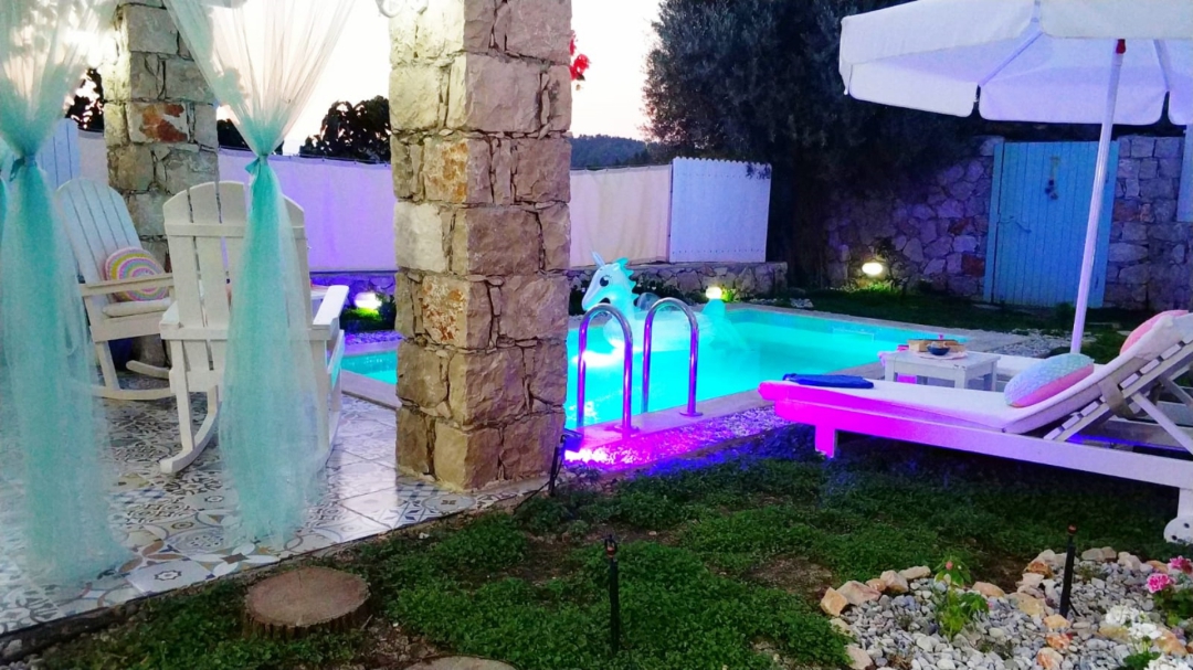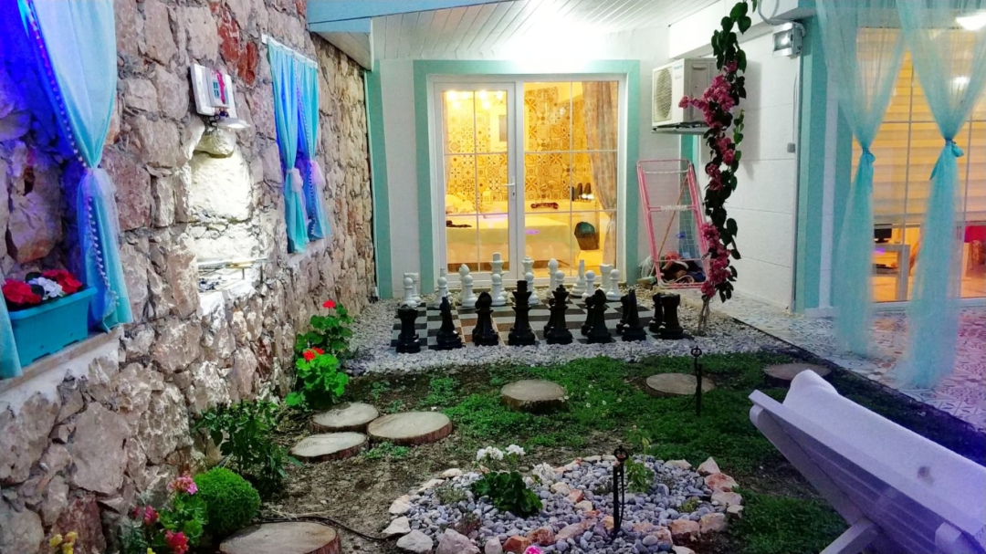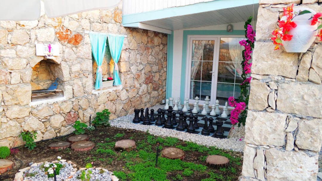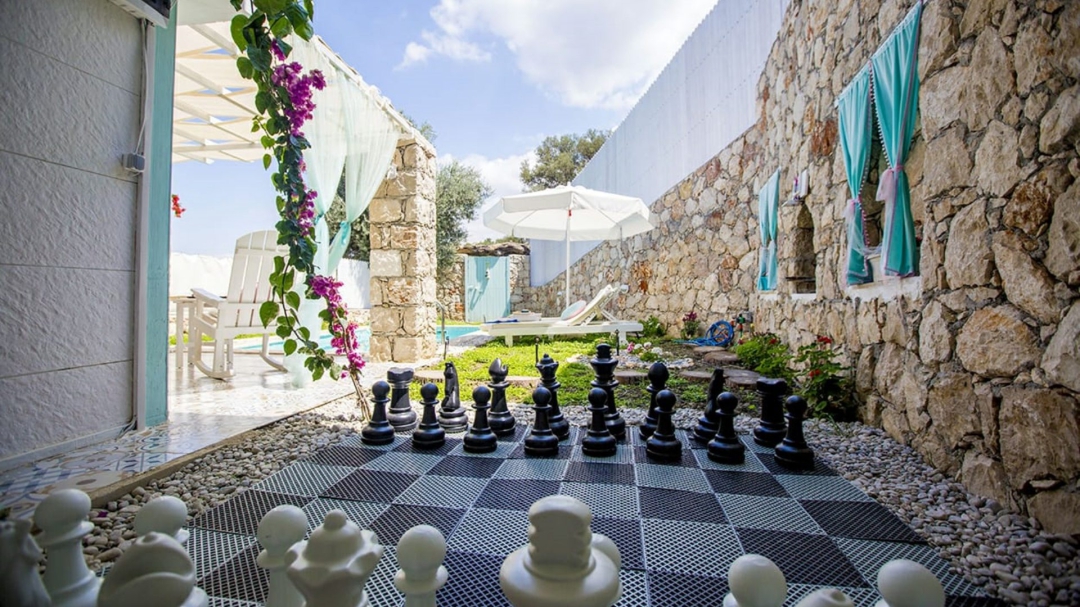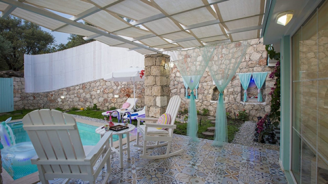Balayı konseptindeki yapı, Akbel bölgesinde konumlanır. Havuz alanı korunaklıdır. Dış havuzu ısıtmalıdır. Kendine has çizgiler taşıyan yapı jakuzilidir.