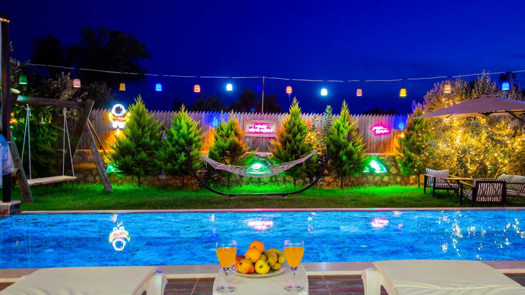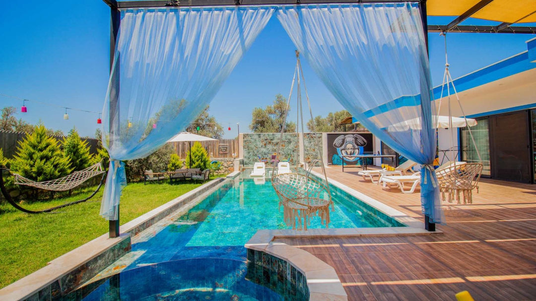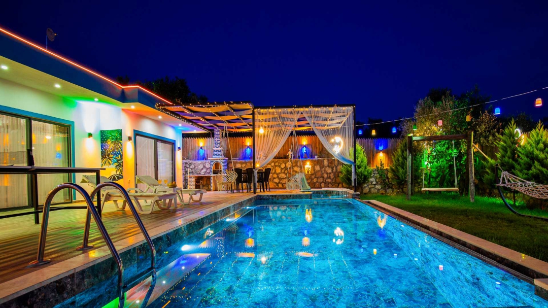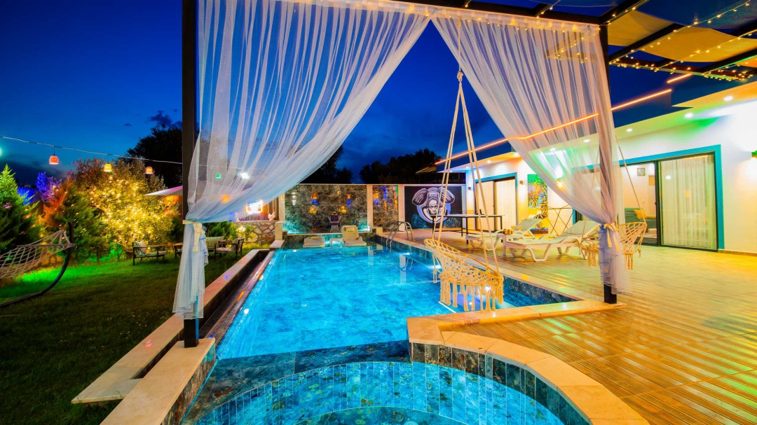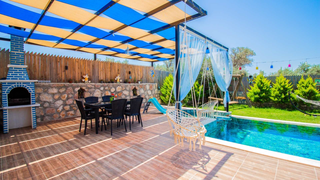 Kalkan Çayköy mevkiinde yer alan özel havuzu tam korunaklı villamızdır. Canlı renkler ile şık bir şekilde dizayn edilen villamızda misafirlerimizin konforu açısından her detay düşünülmüştür. Görsel bir şölen sunan geniş havuz terası, yemyeşil bahçesi ve eğlence imkanlarıyla birlikte villamızda, keyifli bir tatilin kapısı sizler için açılacaktır.Çayköy mevkiinde yer alan villamız Kalkan merkeze yaklaşık 15-20 dakika mesafededir. Doğa içerisinde konumu sayesinde şehir hayatından uzak sessiz, sakin bir tatil geçirmek isteyen misafirlerimiz için oldukça uygun bir seçenektir. Saklıkent Milli Parkına, yaygın adıyla da Saklıkent Kanyon'una araçla maksimum yarım saatlik mesafede yer almaktadır.Villamızdaki masa tenisi, mini kaydırak ve iki adet salıncak sayesinde eğlenceli anlar sizleri beklemektedir.