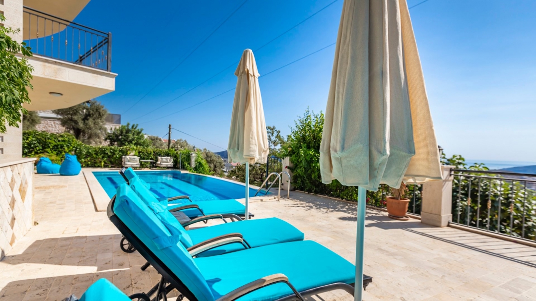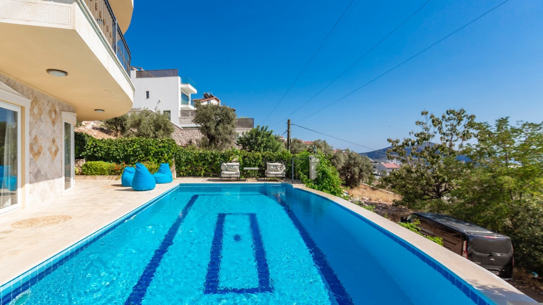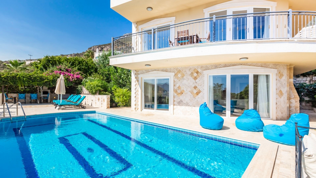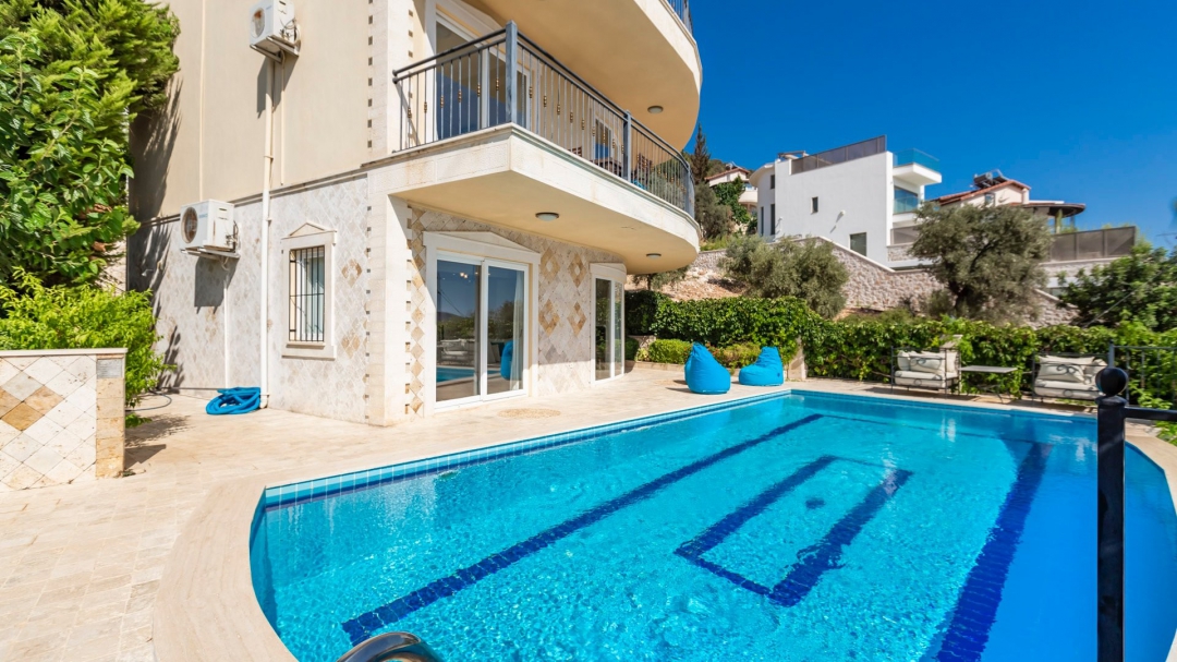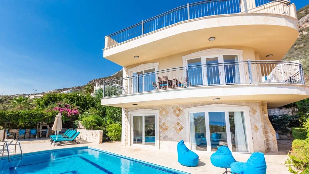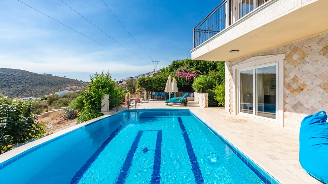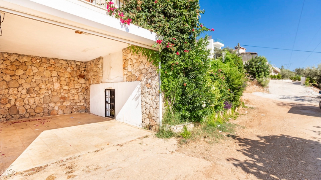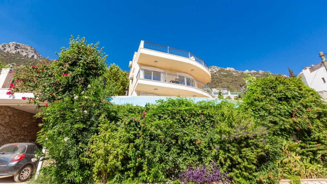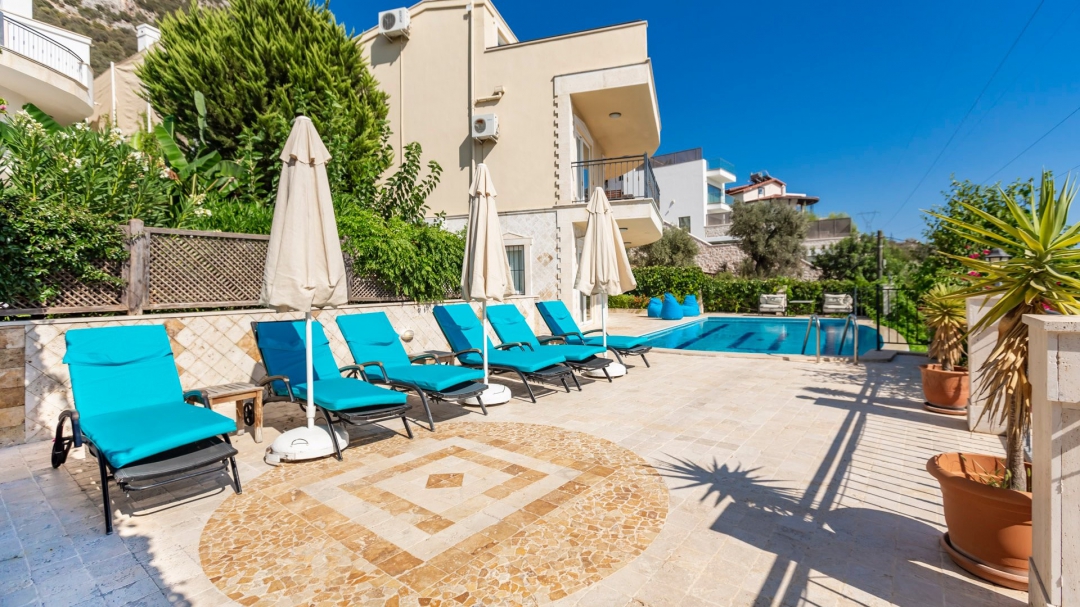 Altında tek araçlık kapalı otoparkı bulunan villa, Kalkan'ın güneye bakan Kızıltaş mevkiinde yer almaktadır. Uzun bir alana yayılmış, kullanımı kolay merdivenler sizi girişe yönlendirir. Misafirleri ilk karşılayan uzun dikdörtgen bir havuz alanıdır.