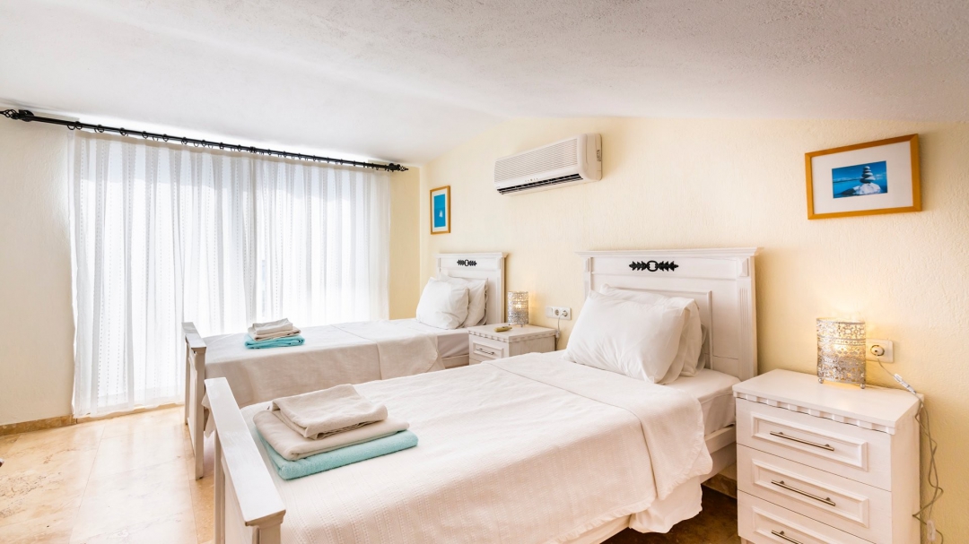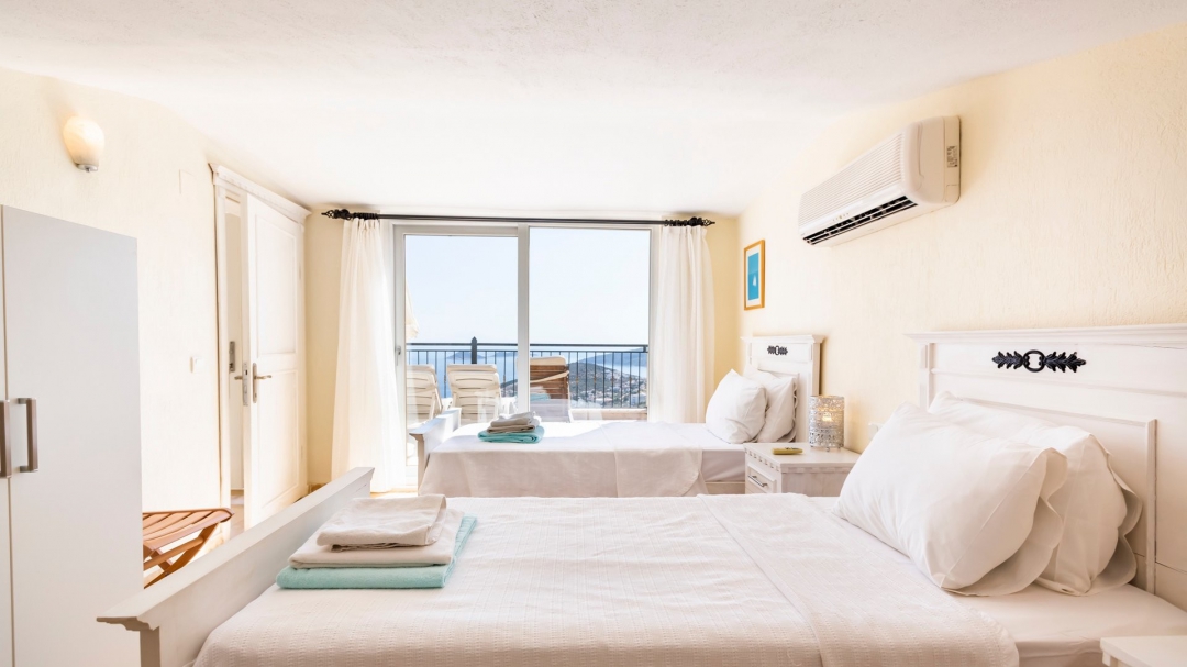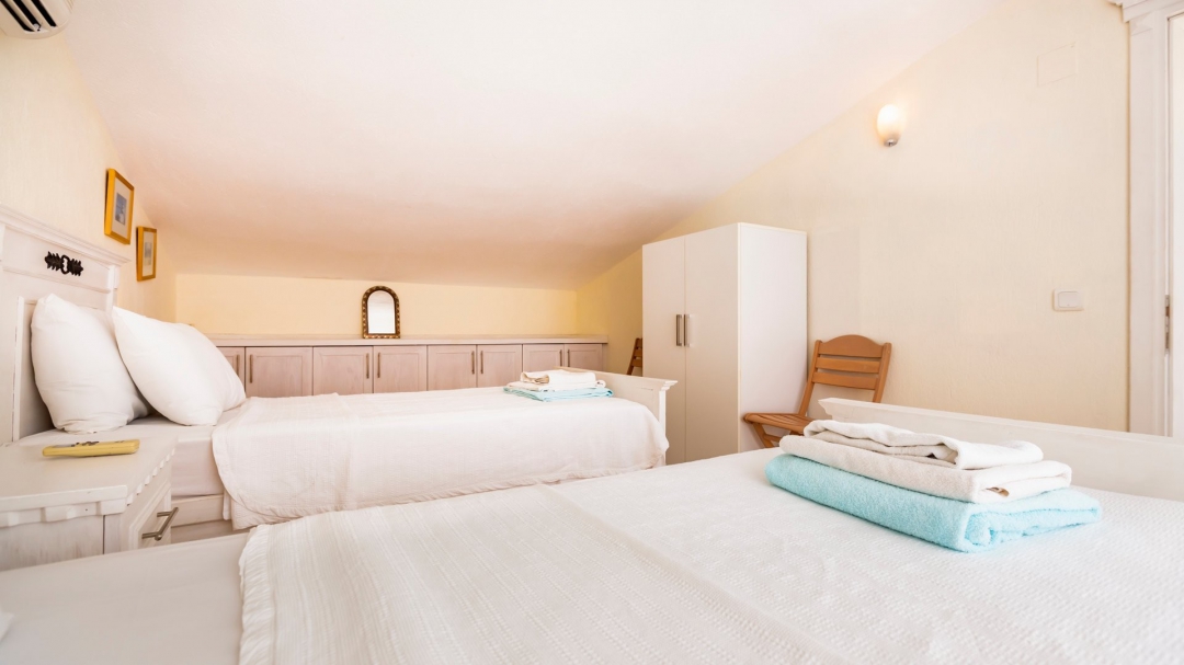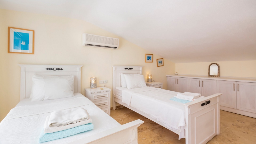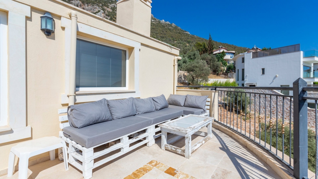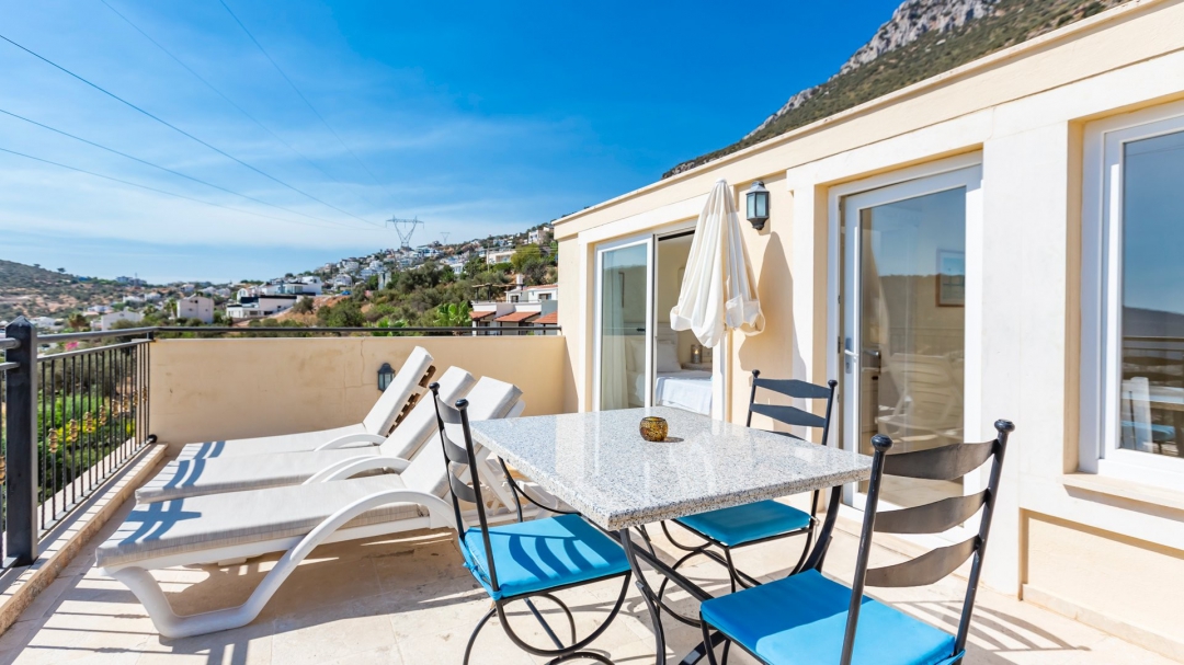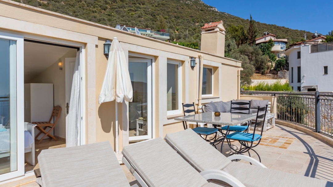 Çatı katında iki adet tek kişilik yataklı bir oda ve şezlong, şemsiye ve yemek masası bulunan bir teras bulunmaktadır. Burada geçirdiğiniz süre boyunca deniz ve Kalkan manzarası size eşlik ediyor. Bu katta banyo ve tuvalet bulunmaktadır.