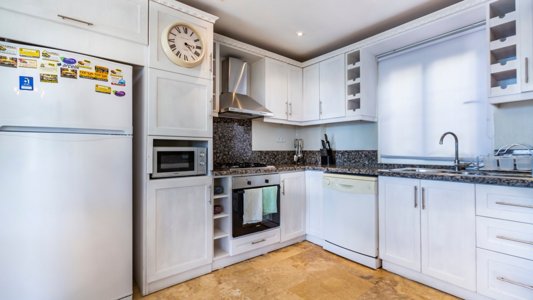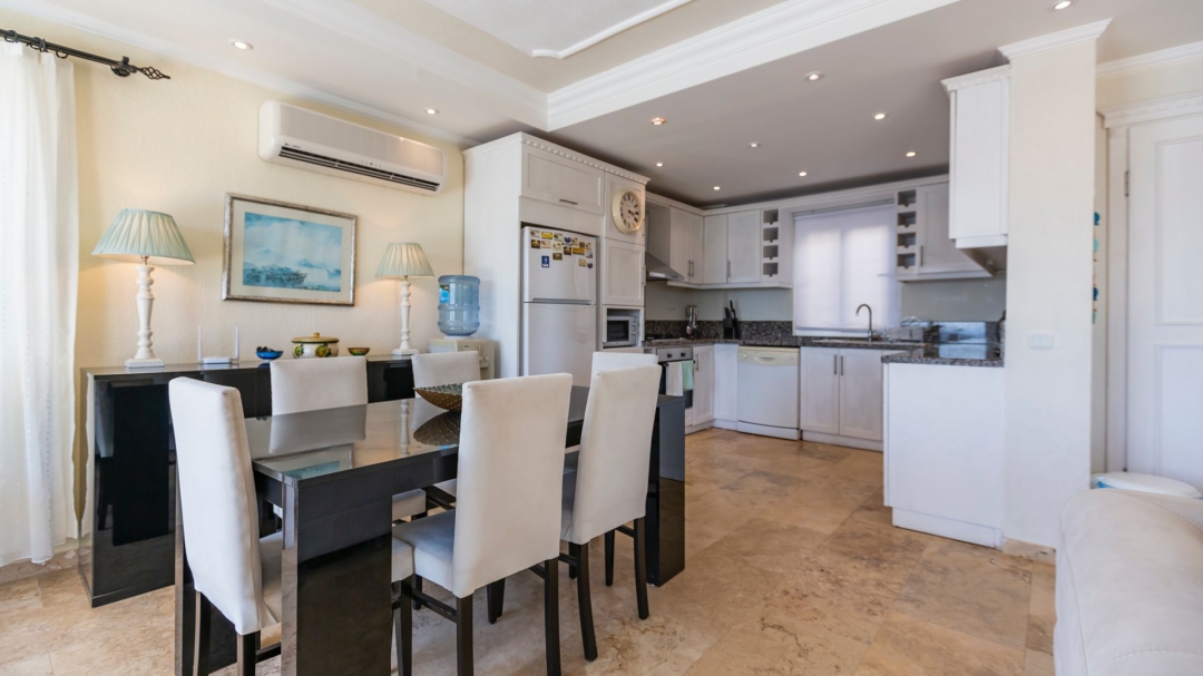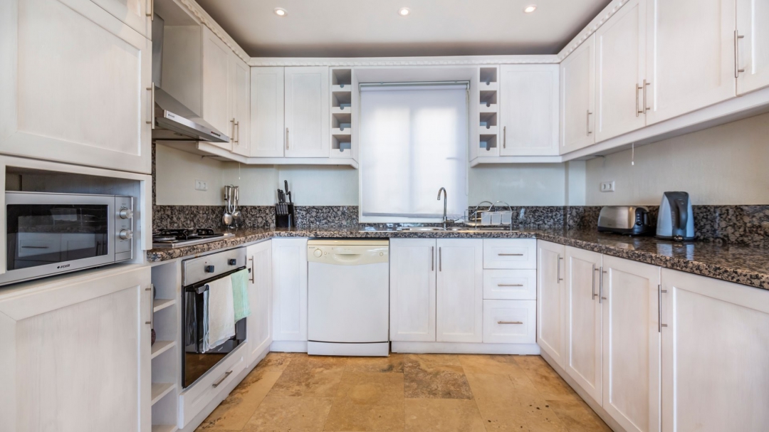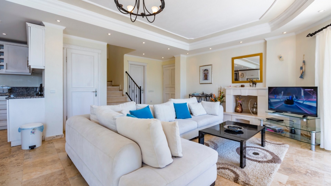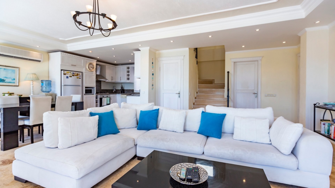 Villaya temiz bir hava vermek için villa genelinde beyaz renk hakimdir. Beyaz tonlarda oturma grubu, TV, su sebili, açık mutfak, altı kişilik yemek masası zemin katı tamamlayan diğer unsurlar. Ayrıca ortak kullanım için bir tuvalet de bu katta yer almaktadır.
