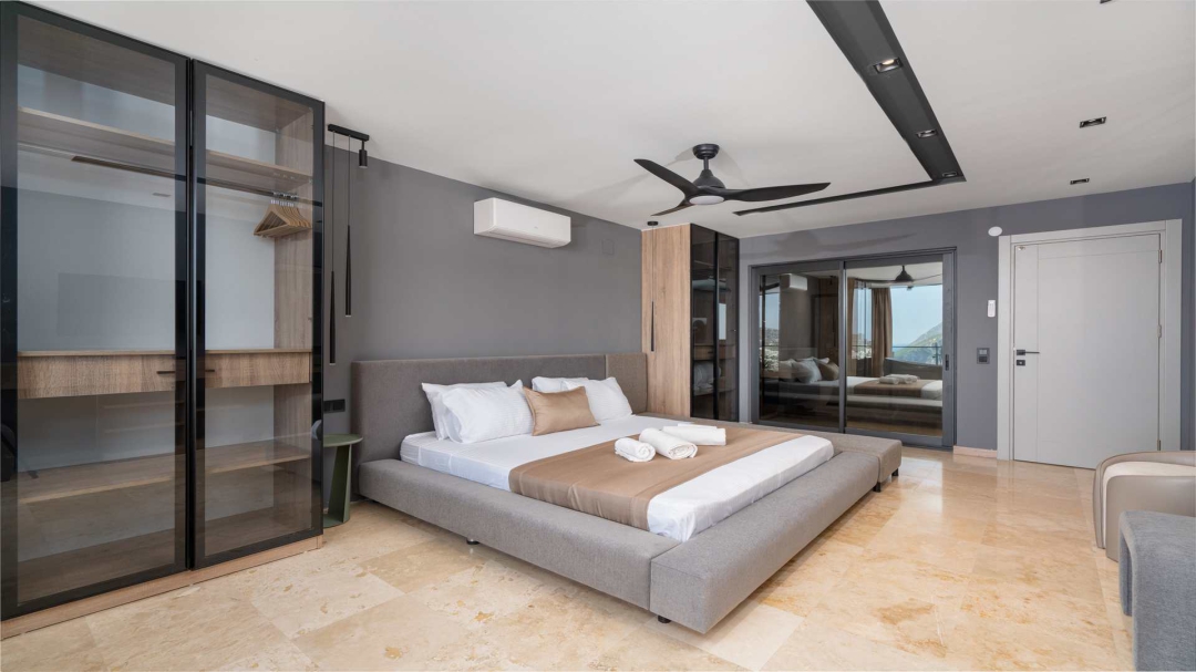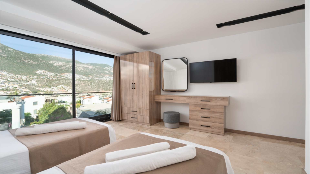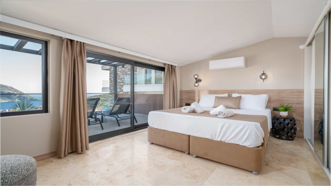 Mevcut beş yatak odasından üçü birinci katta yer almaktadır. Tamamı en suite ve deniz manzaralı olan üç odadan ikisinde çift kişilik yatak, diğerinde iki adet tek kişilik yatak bulunmaktadır. Tüm odalarda balkon mevcuttur. Makyaj masası, gardırop, komidin tüm odalarda bulunan ekipmanlardır. Çift kişilik yatak odalarından birinde ekstra olarak jakuzi ve TV bulunmaktadır.