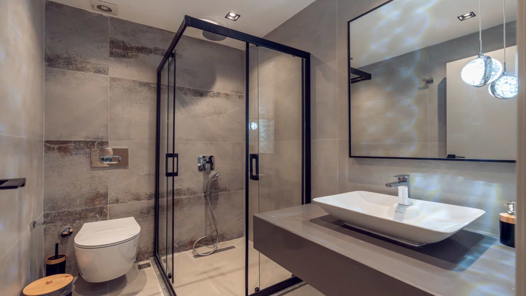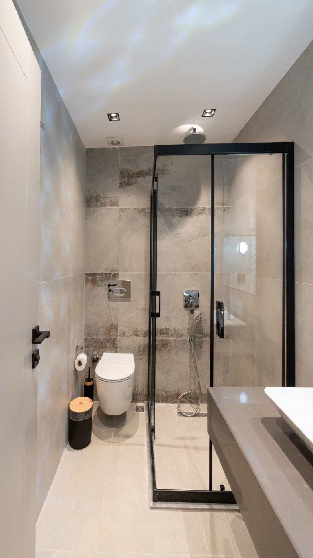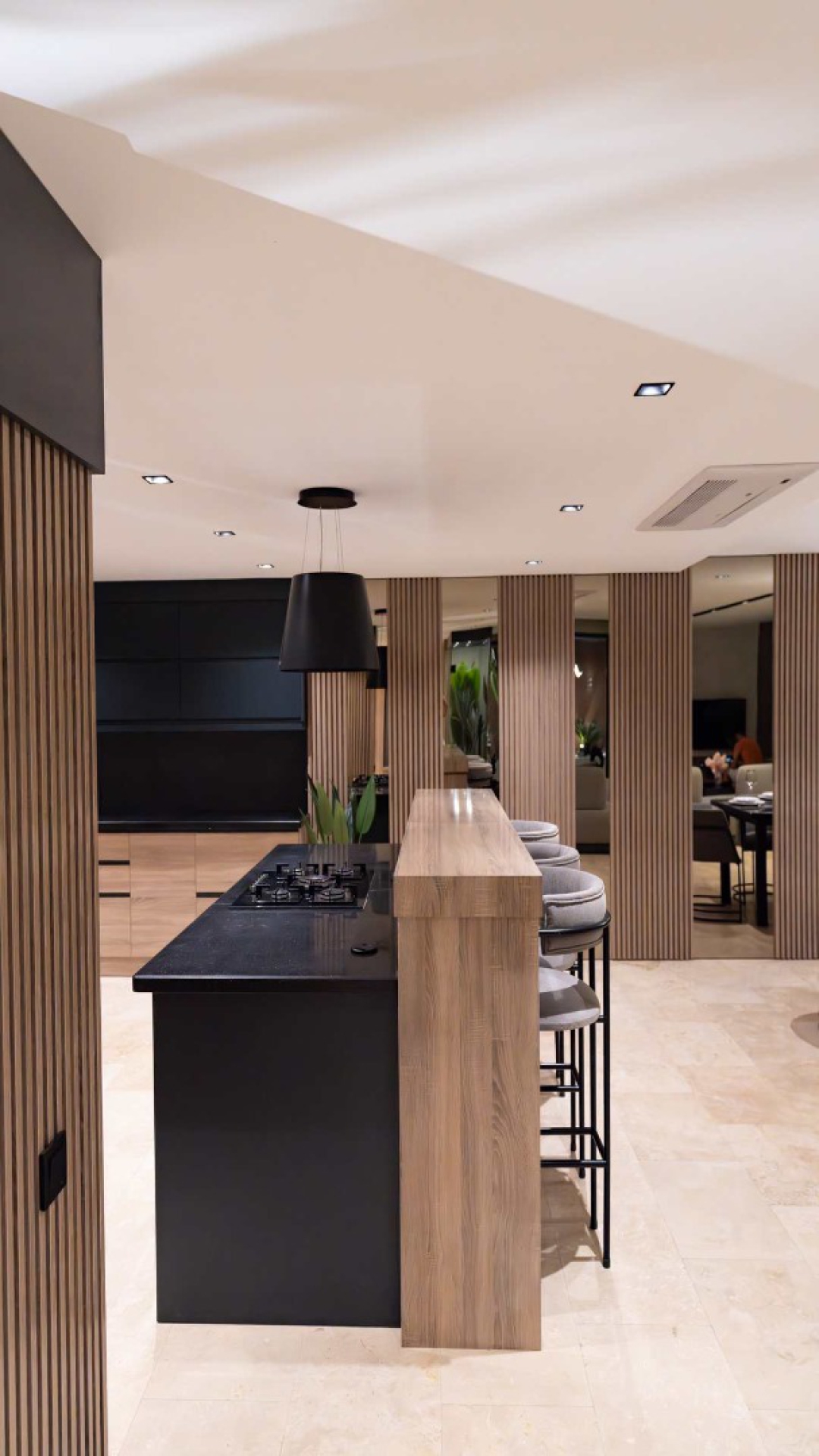 Zemin kattaki kapalı alanı oluşturan diğer unsurlar ise şık mobilyalı oturma odası ve ada mutfak tezgâhlı açık mutfaktır. Bu katta ortak tuvalet de hizmet vermektedir.
