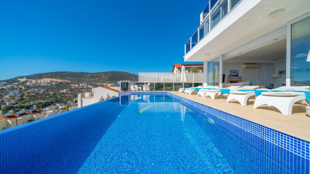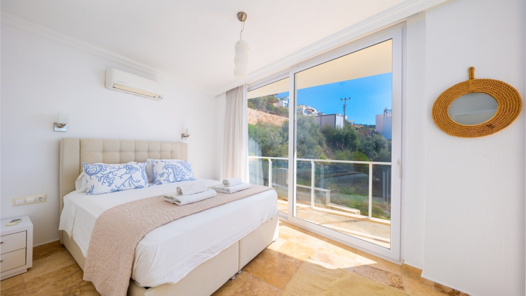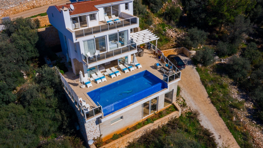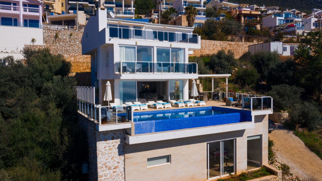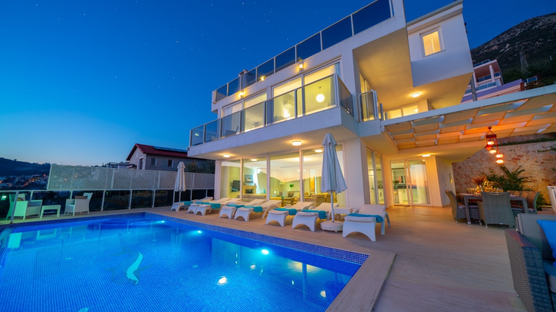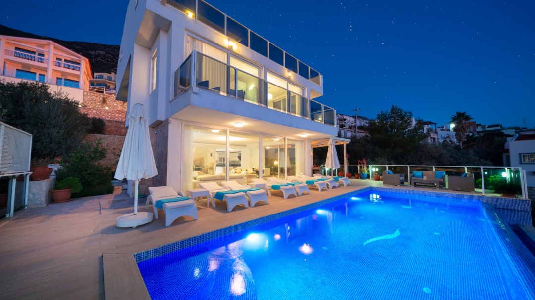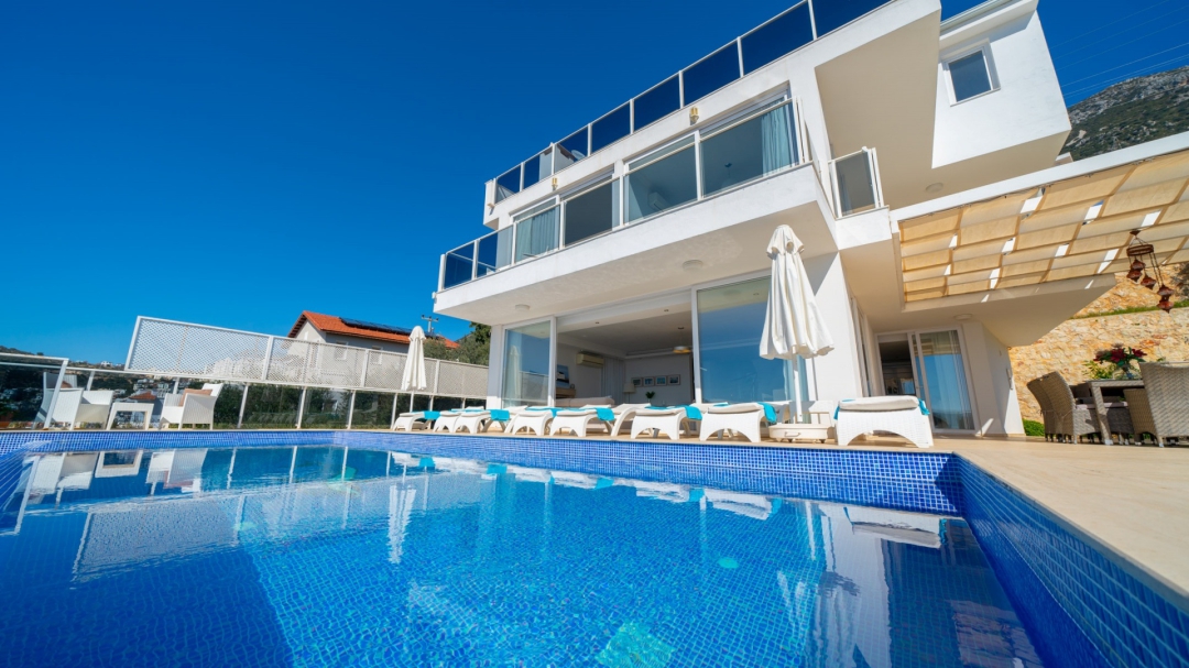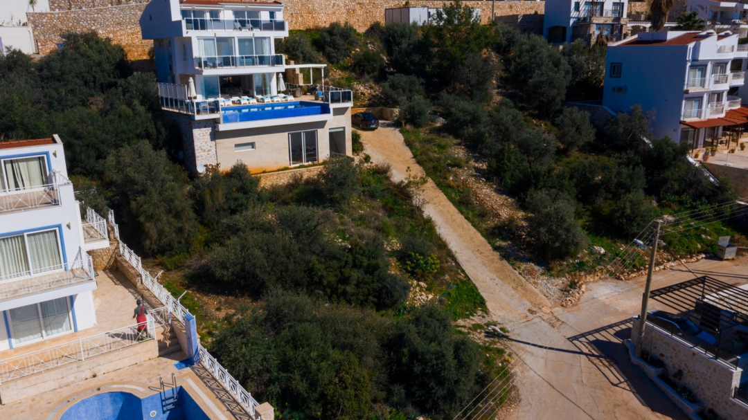 Villa'ya Bağlantılı yolunun son 50 metresi dik bir yokuş mevcuttur. Villanın bodrum katında masa tenisi, oturma grubu, TV, oyun konsolu, langırt ve koşu bandı gibi ekipmanlar bulunmaktadır. Villa da Açık otopark mevcuttur. Beyaz renkli villa, merkezi bir açıdan Kalkan Koyu'na bakmaktadır. Gün boyunca güneş ışığı havuz terasını aydınlatır. Zemin kat; Havuz terası, oturma odası ve açık mutfaktan oluşmaktadır. Villa yamaçta yer almaktadır. Yamaç konumunun sunduğu deniz ve Kalkan manzarası villanın hemen her noktasından görülebilmektedir.