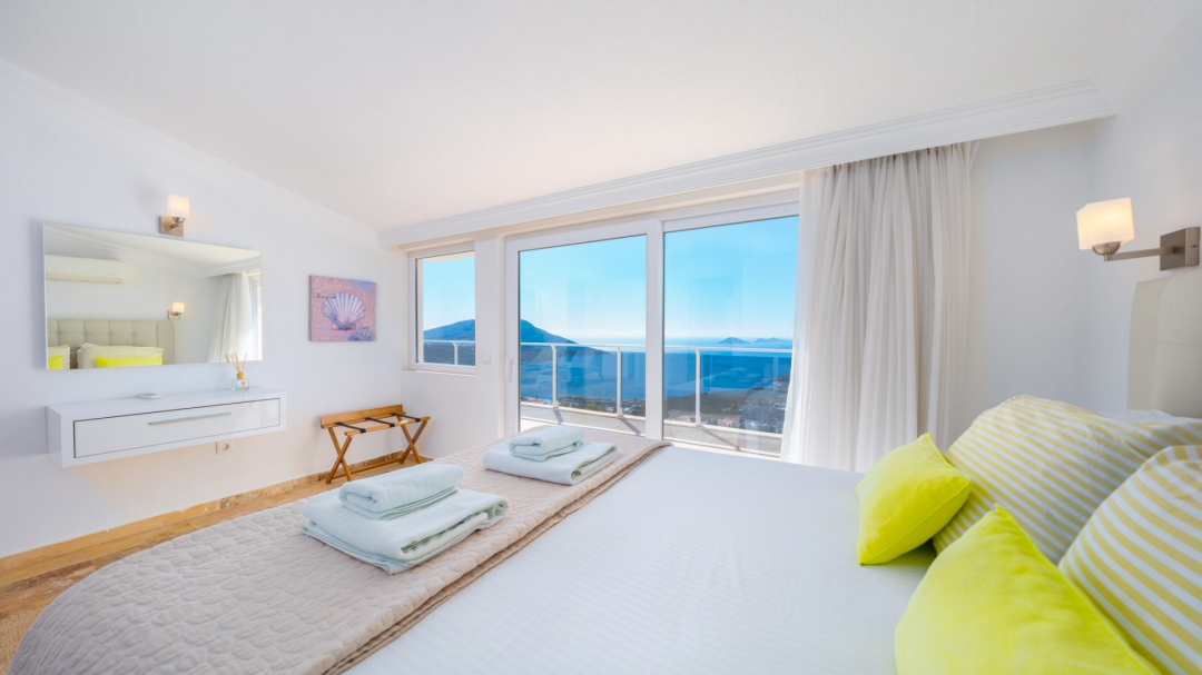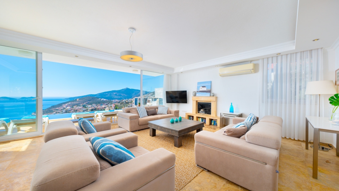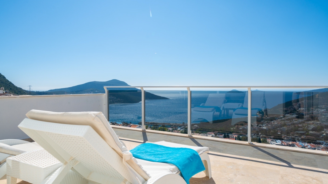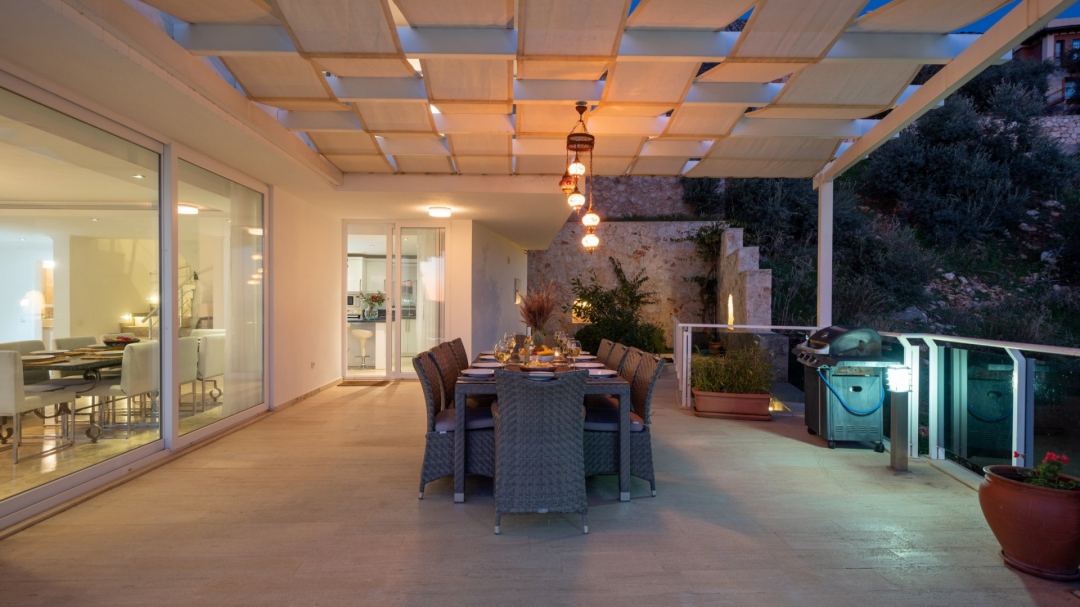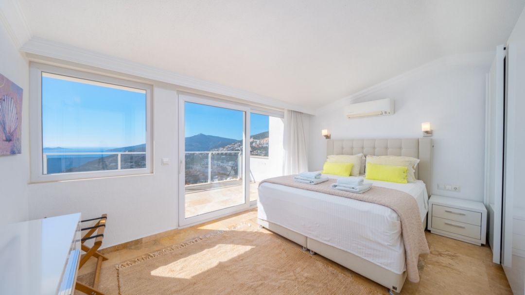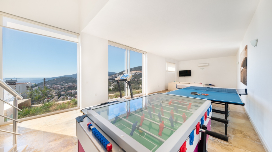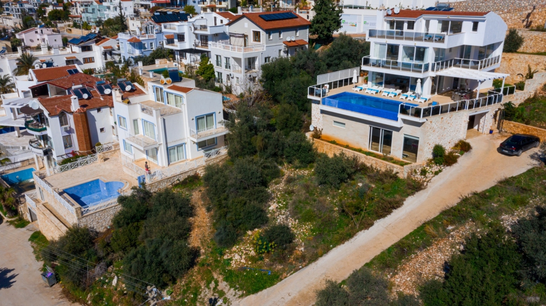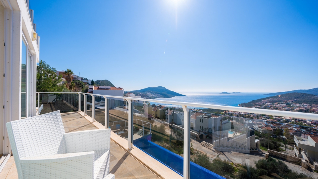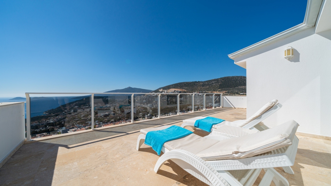Villa'ya Bağlantılı yolunun son 50 metresi dik bir yokuş mevcuttur. Villanın bodrum katında masa tenisi, oturma grubu, TV, oyun konsolu, langırt ve koşu bandı gibi ekipmanlar bulunmaktadır. Villa da Açık otopark mevcuttur. Beyaz renkli villa, merkezi bir açıdan Kalkan Koyu'na bakmaktadır. Gün boyunca güneş ışığı havuz terasını aydınlatır. Zemin kat; Havuz terası, oturma odası ve açık mutfaktan oluşmaktadır. Villa yamaçta yer almaktadır. Yamaç konumunun sunduğu deniz ve Kalkan manzarası villanın hemen her noktasından görülebilmektedir.