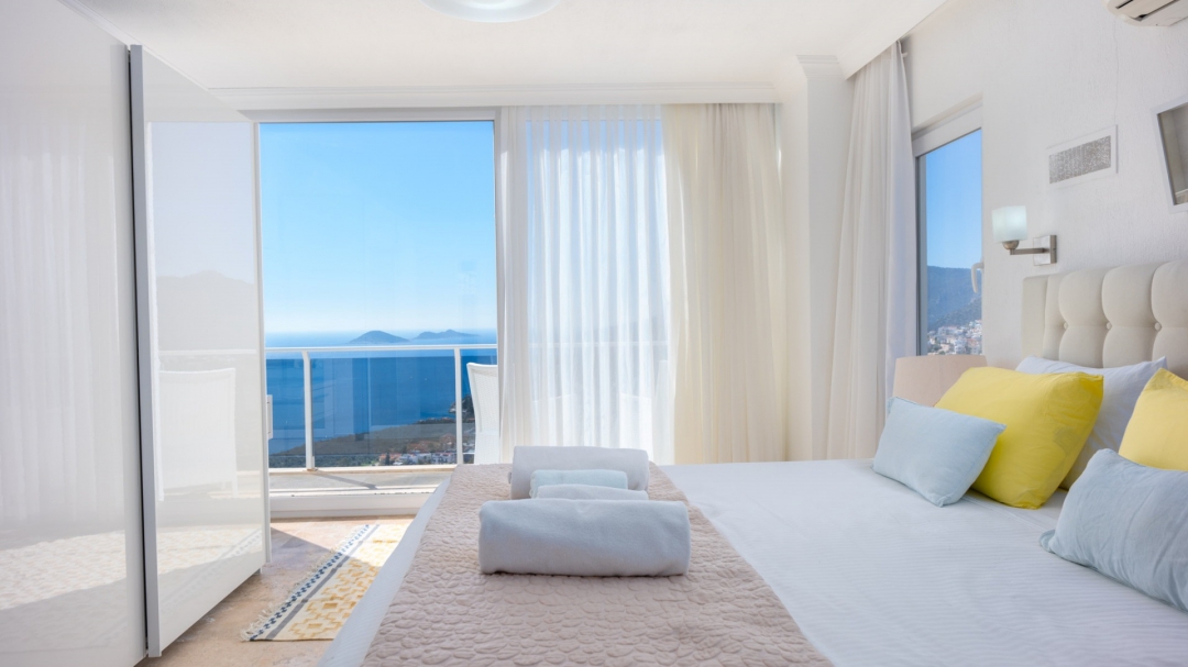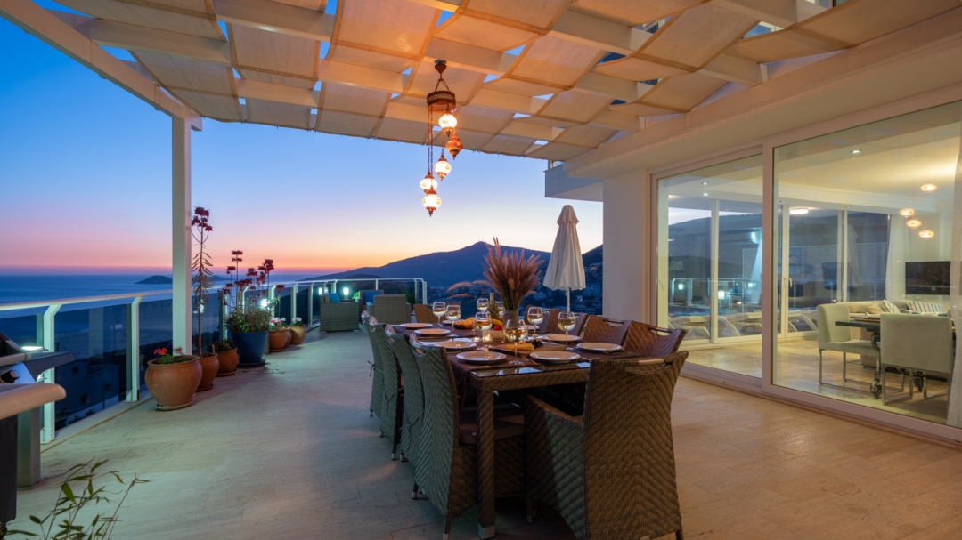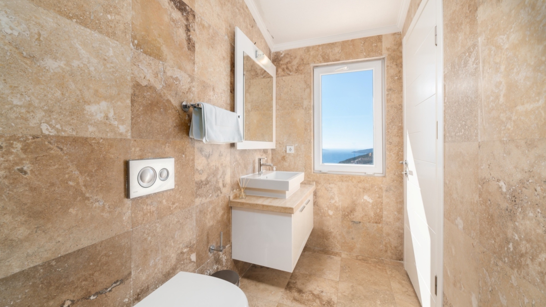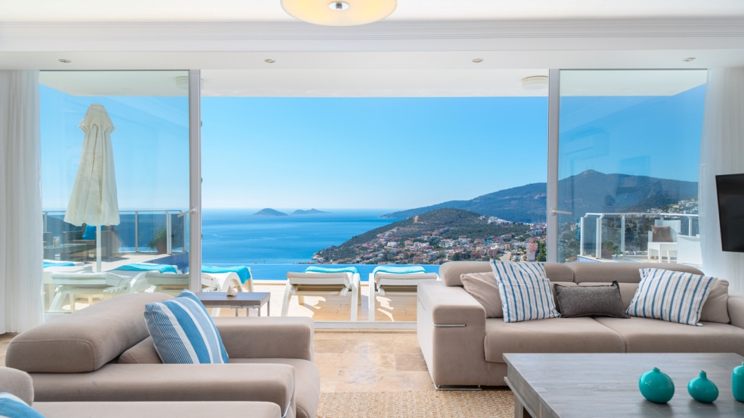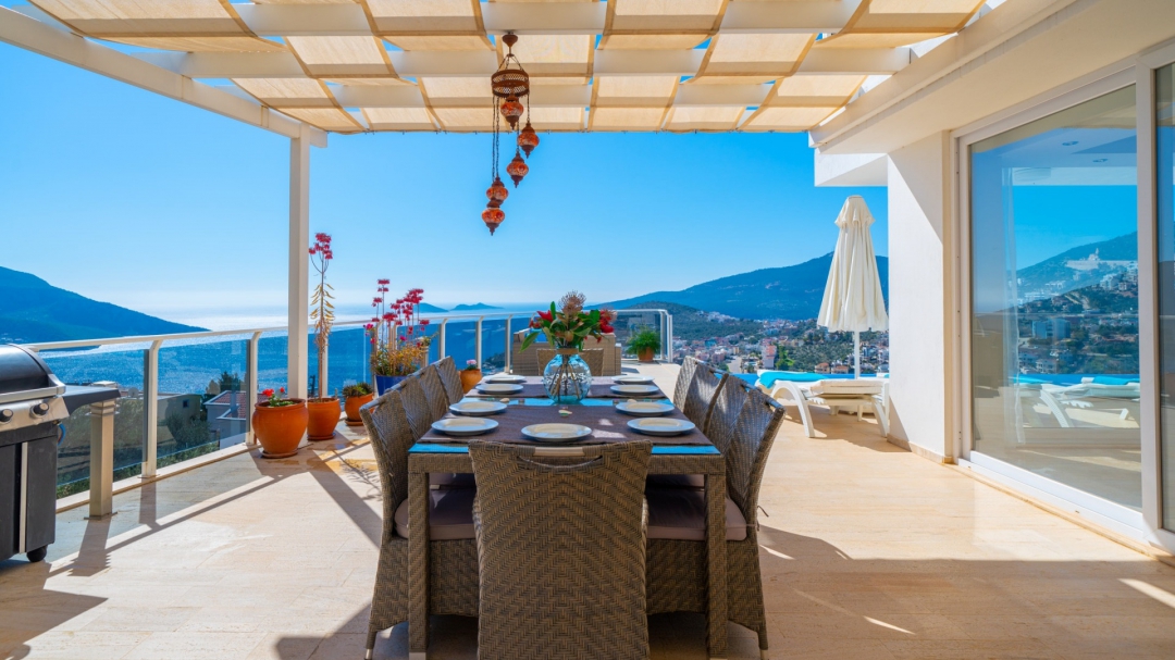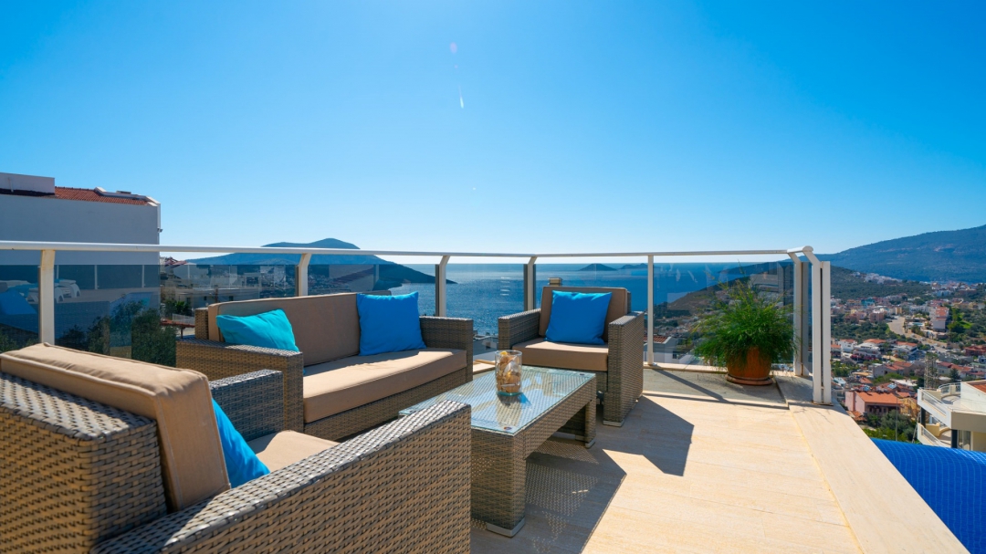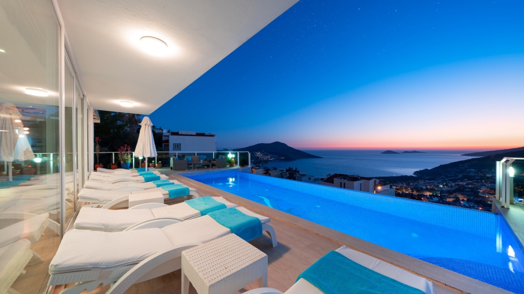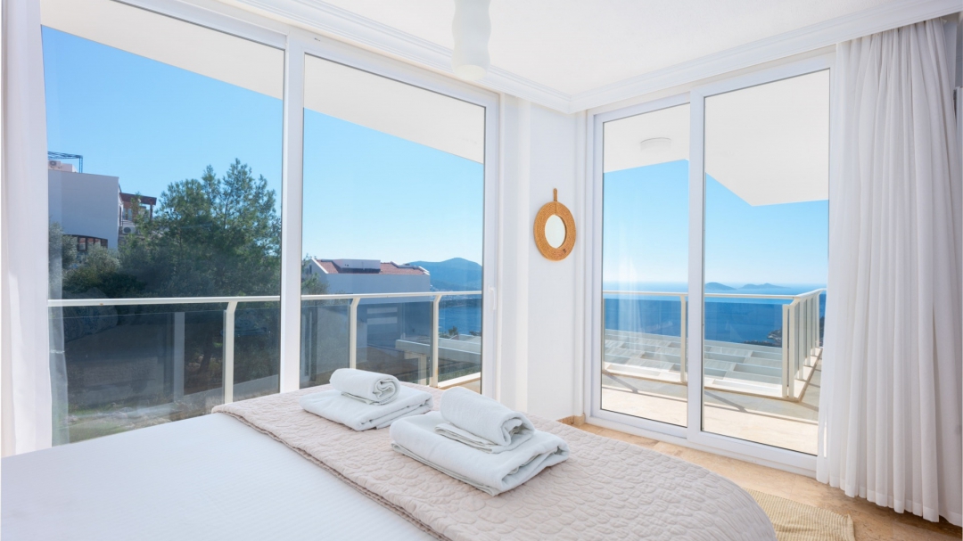 Villa'ya Bağlantılı yolunun son 50 metresi dik bir yokuş mevcuttur. Villanın bodrum katında masa tenisi, oturma grubu, TV, oyun konsolu, langırt ve koşu bandı gibi ekipmanlar bulunmaktadır. Villa da Açık otopark mevcuttur. Beyaz renkli villa, merkezi bir açıdan Kalkan Koyu'na bakmaktadır. Gün boyunca güneş ışığı havuz terasını aydınlatır. Zemin kat; Havuz terası, oturma odası ve açık mutfaktan oluşmaktadır. Villa yamaçta yer almaktadır. Yamaç konumunun sunduğu deniz ve Kalkan manzarası villanın hemen her noktasından görülebilmektedir.