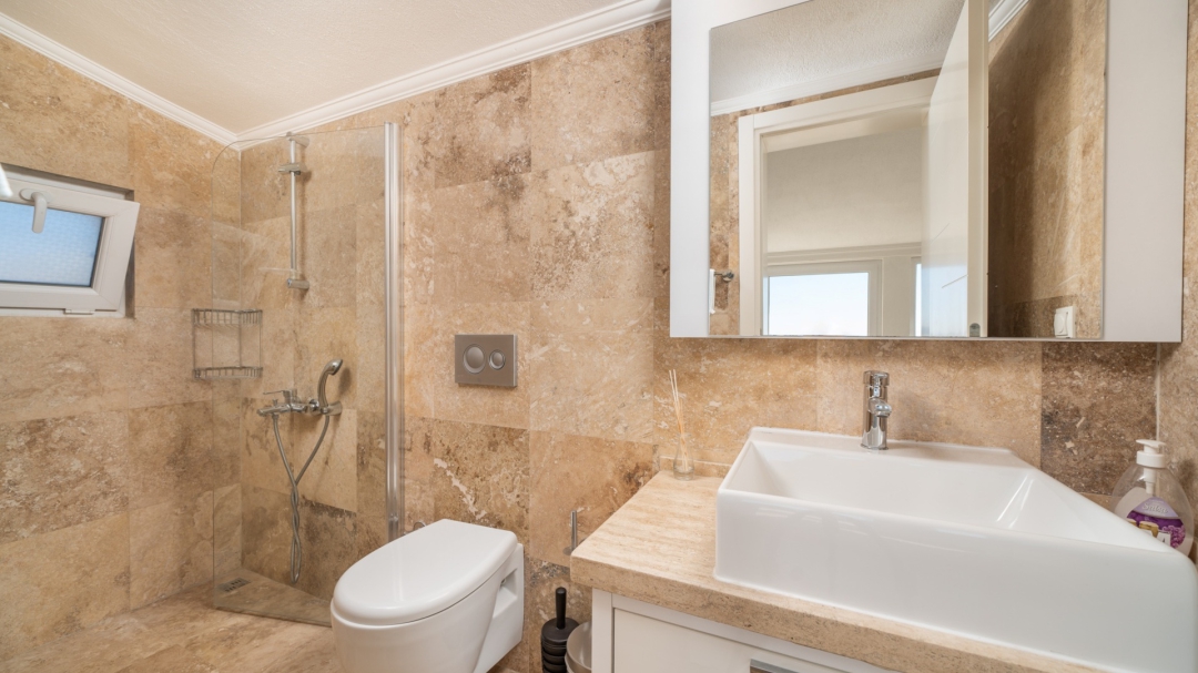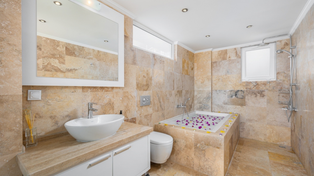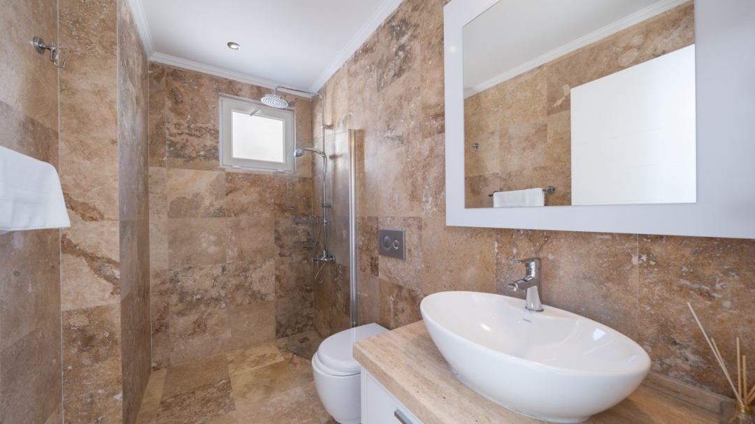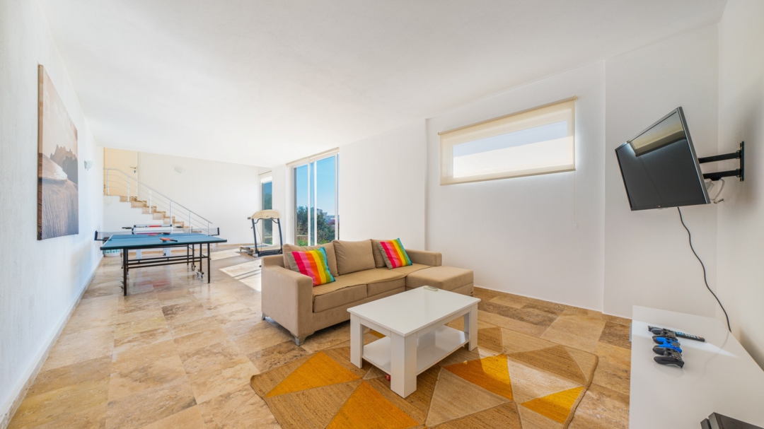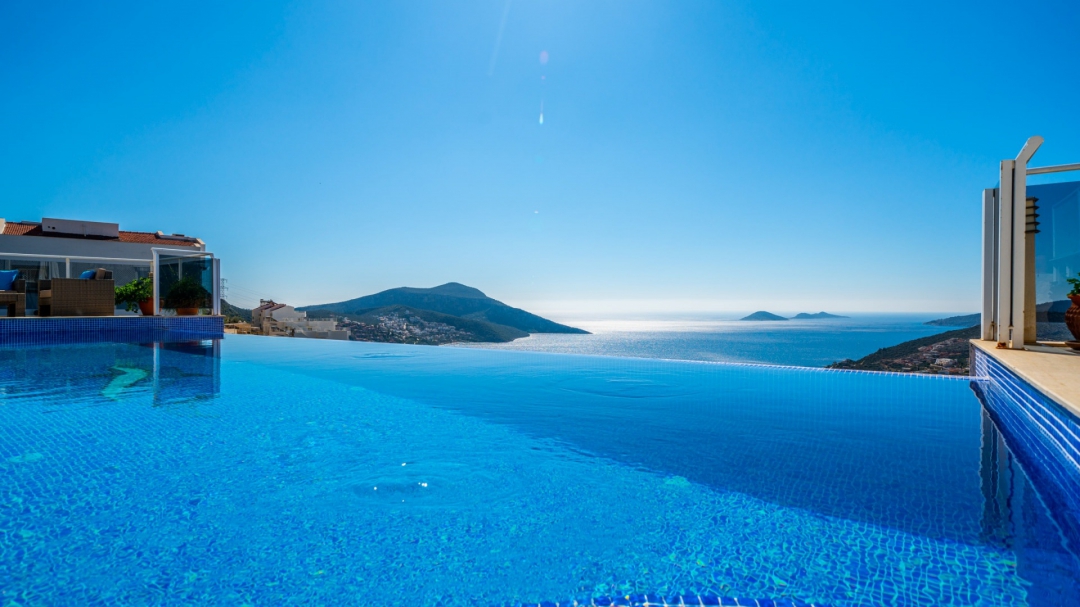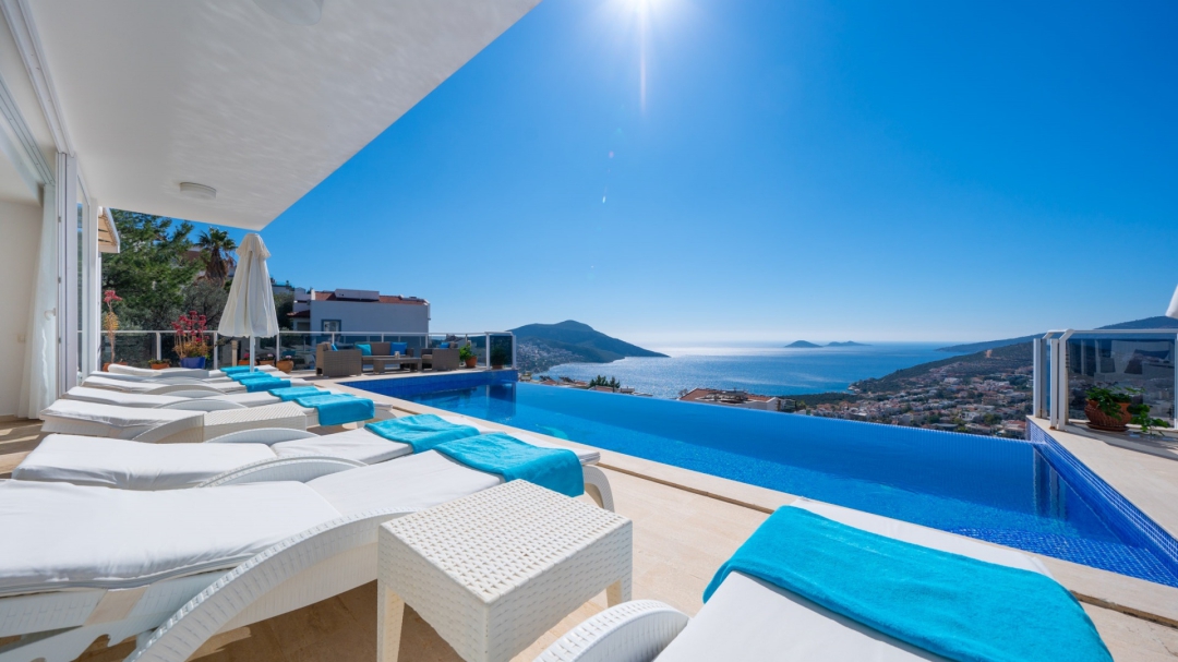 Villanın sonsuzluk havuzuna; Şezlonglar, dış mekan duşu, şemsiyeler, oturma grubu, barbekü, yemek masası ve gölgeli alan eşlik etmektedir. Salon ve mutfaktan havuz terasına çıkış bulunmaktadır. Lounge alanı vakit geçirmek için çok güzel bir bölüm. Zemin kattaki kapalı alan uygun şekilde planlanmıştır. Donanımlı bir mutfak ve bu kata hizmet veren ortak kullanım tuvaleti bu katı tamamlayan diğer kısımlardır.
