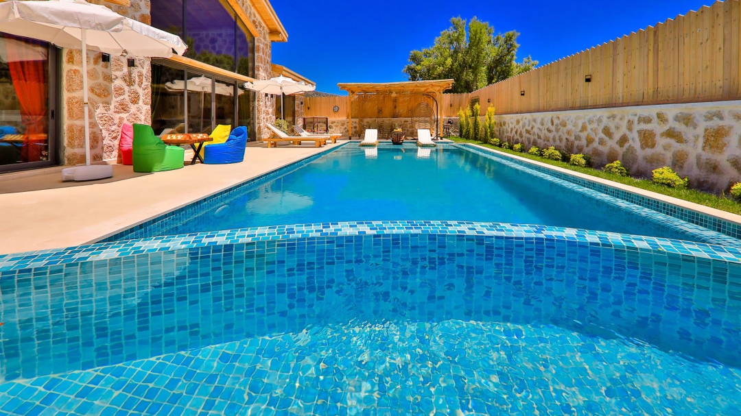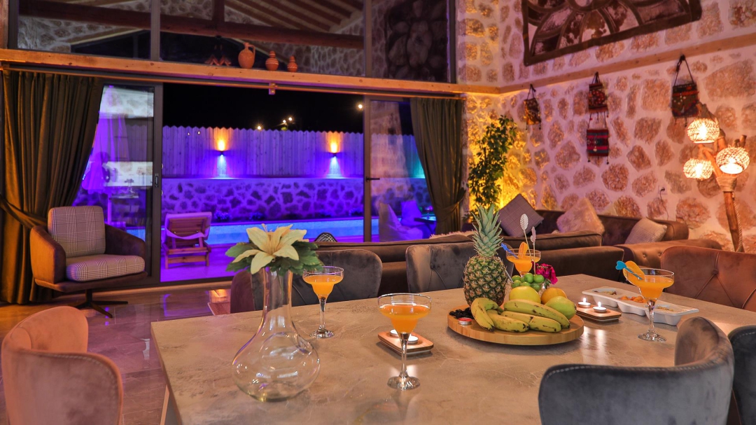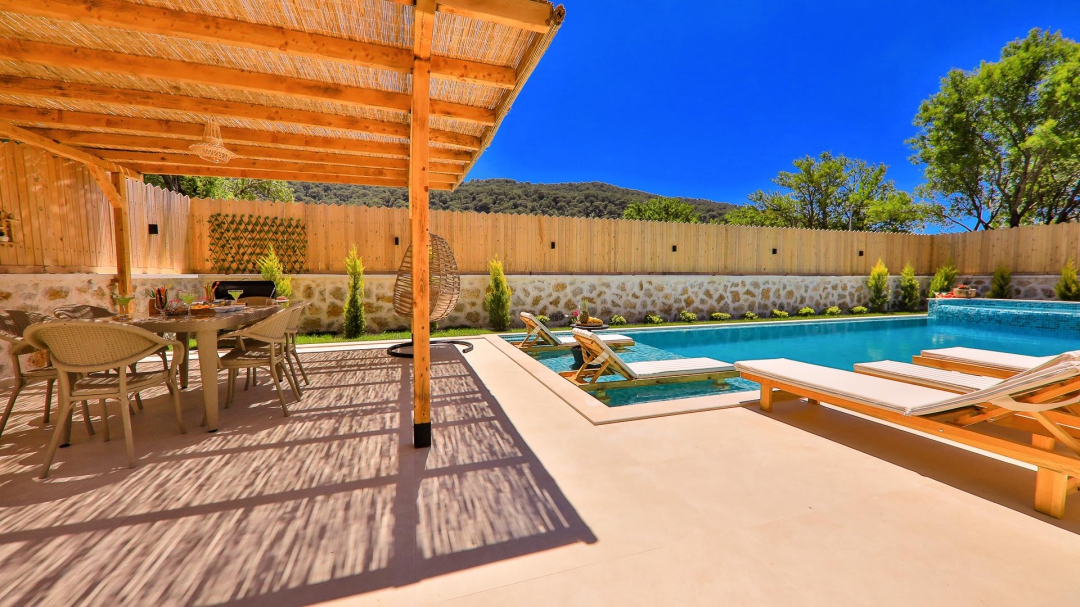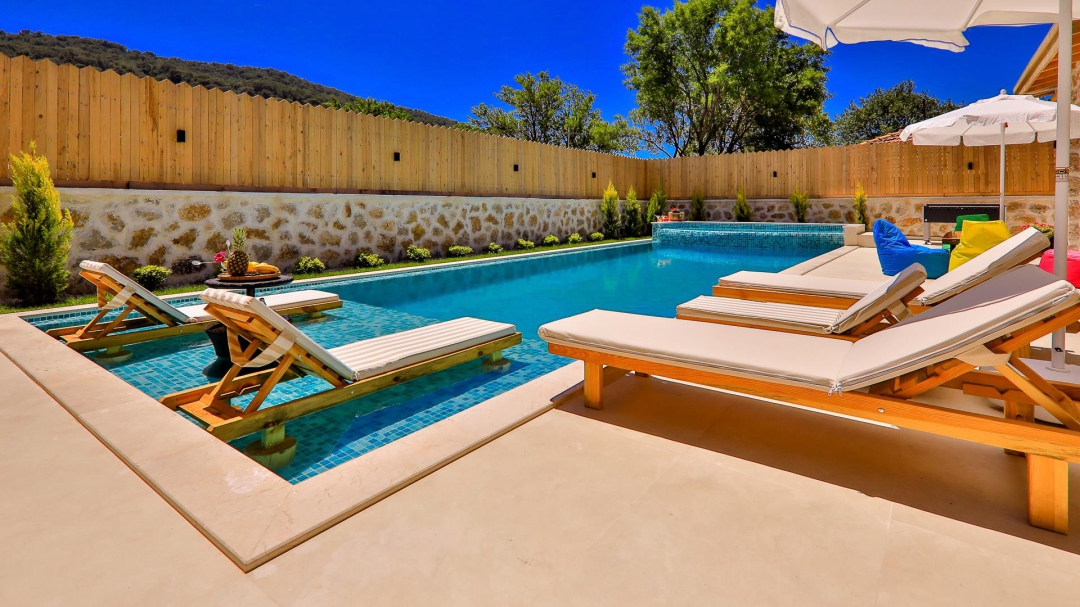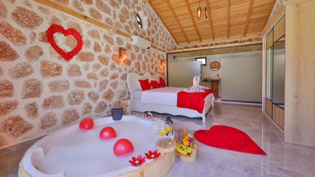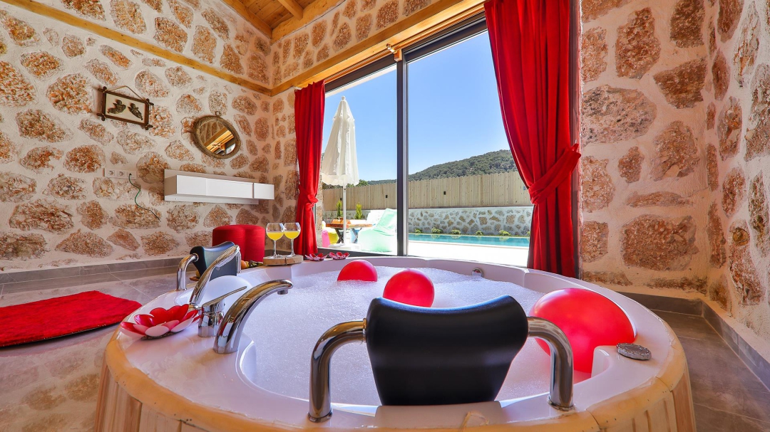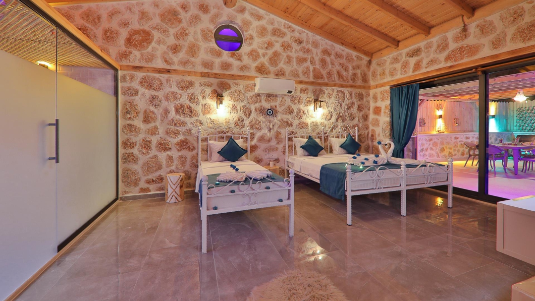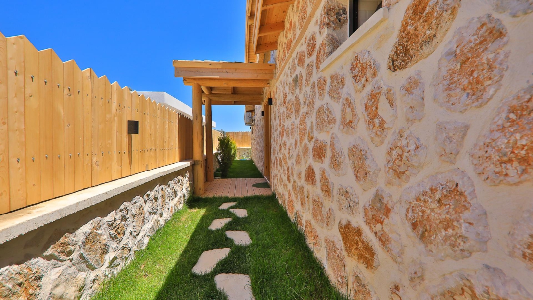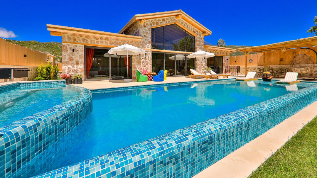 Ana yatak odasında bir adet çift kişilik yatak, diğer odasında bir çift kişilik bir adet tek kişilik yatak bulunan villa 5 kişiye kadar konaklama kapasitesi sunar. Hoş bir peyzaj tarafından sarılan havuz terası oldukça keyiflidir. Havuzun yanında bir de havuz jakuzisi yer alır. Aynı zamanda çocuk havuzu olarak kullanmak için uygundur. Bolca zaman geçireceğiniz bu alanın yabancı gözlerden mahremiyeti sağlanmıştır. Yapının dışı gibi içi de ferahtır. Salonda ferah bir yüksek tavan detayı bulunur. İnşasında kullanılan taş ve ahşap gibi doğal malzemeler yapıyı bir şehir evi havasından dışarı sürükler. İliklerinize kadar hoş anılar biriktireceğiniz yapı balayı çiftleri ve çekirdek ailelere yetecek kapasiteyi sağlar.