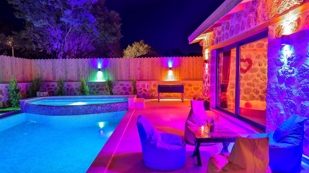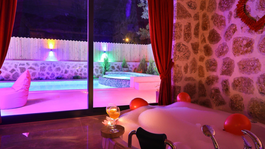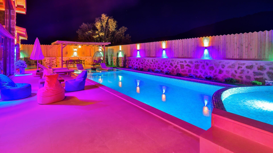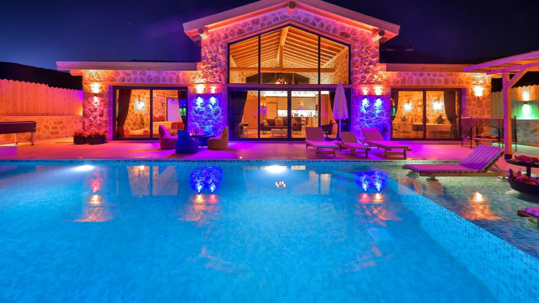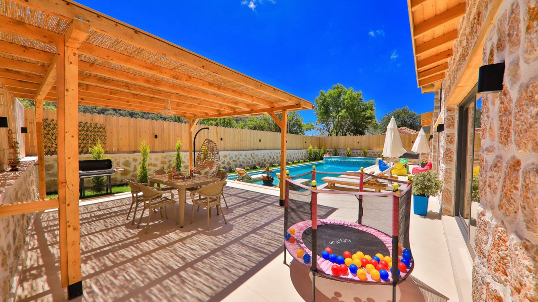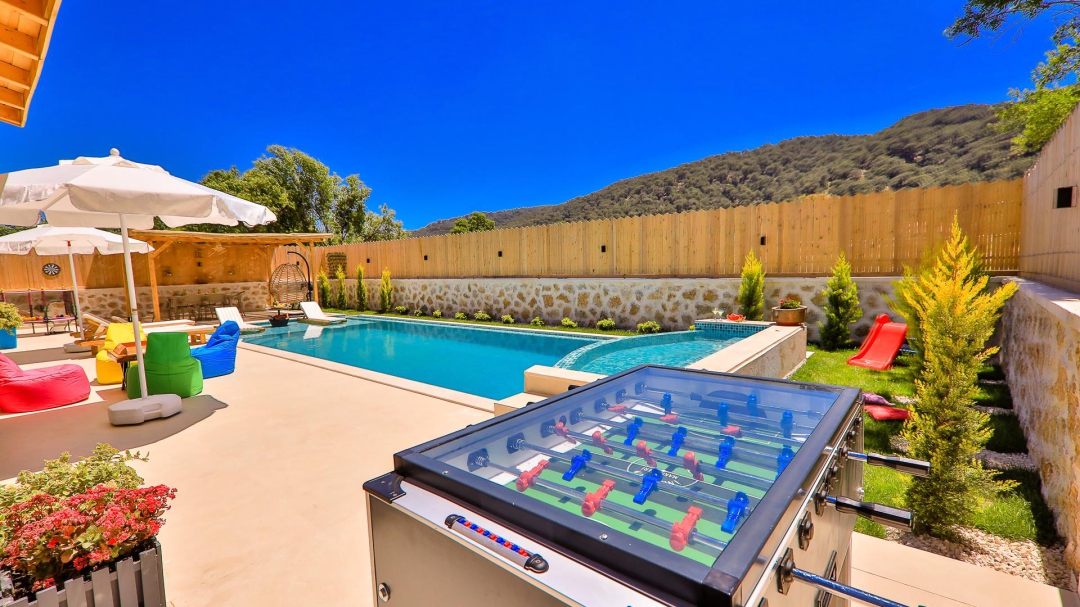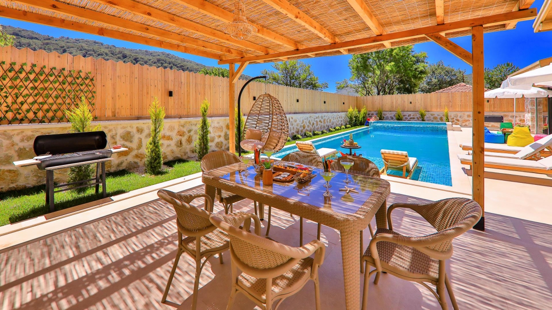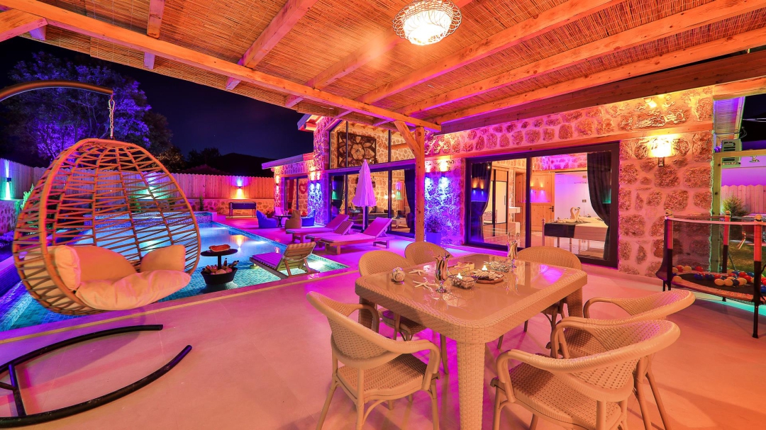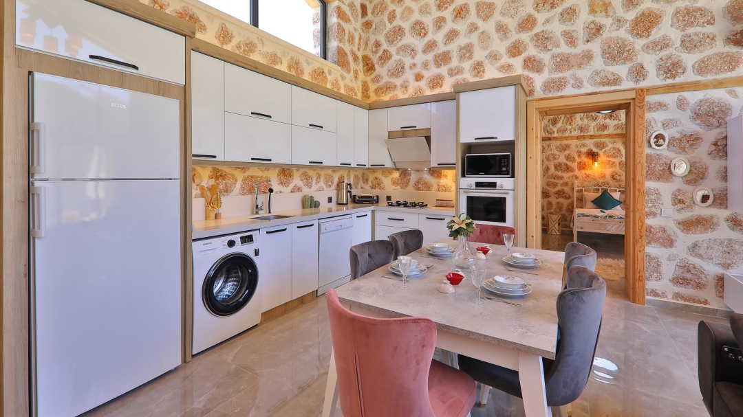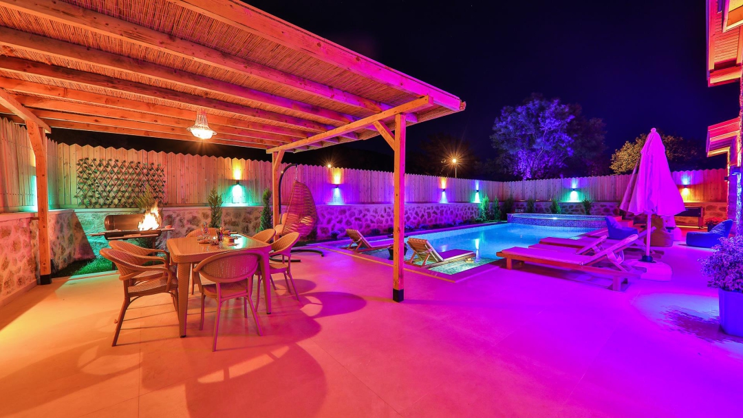 Ana yatak odasında bir adet çift kişilik yatak, diğer odasında bir çift kişilik bir adet tek kişilik yatak bulunan villa 5 kişiye kadar konaklama kapasitesi sunar. Hoş bir peyzaj tarafından sarılan havuz terası oldukça keyiflidir. Havuzun yanında bir de havuz jakuzisi yer alır. Aynı zamanda çocuk havuzu olarak kullanmak için uygundur. Bolca zaman geçireceğiniz bu alanın yabancı gözlerden mahremiyeti sağlanmıştır. Yapının dışı gibi içi de ferahtır. Salonda ferah bir yüksek tavan detayı bulunur. İnşasında kullanılan taş ve ahşap gibi doğal malzemeler yapıyı bir şehir evi havasından dışarı sürükler. İliklerinize kadar hoş anılar biriktireceğiniz yapı balayı çiftleri ve çekirdek ailelere yetecek kapasiteyi sağlar.