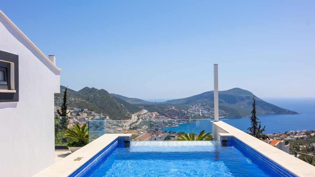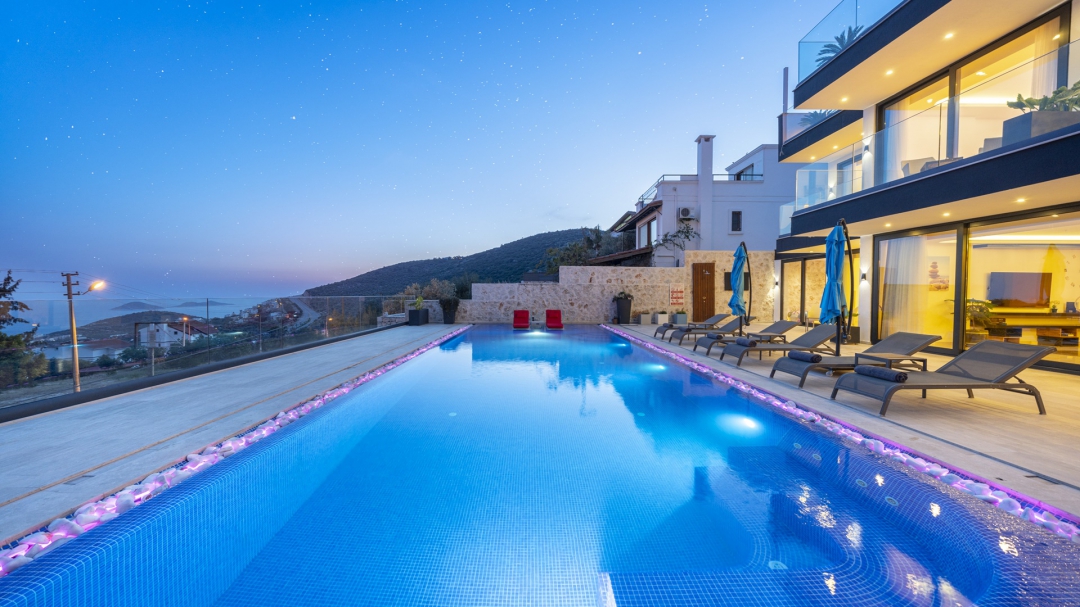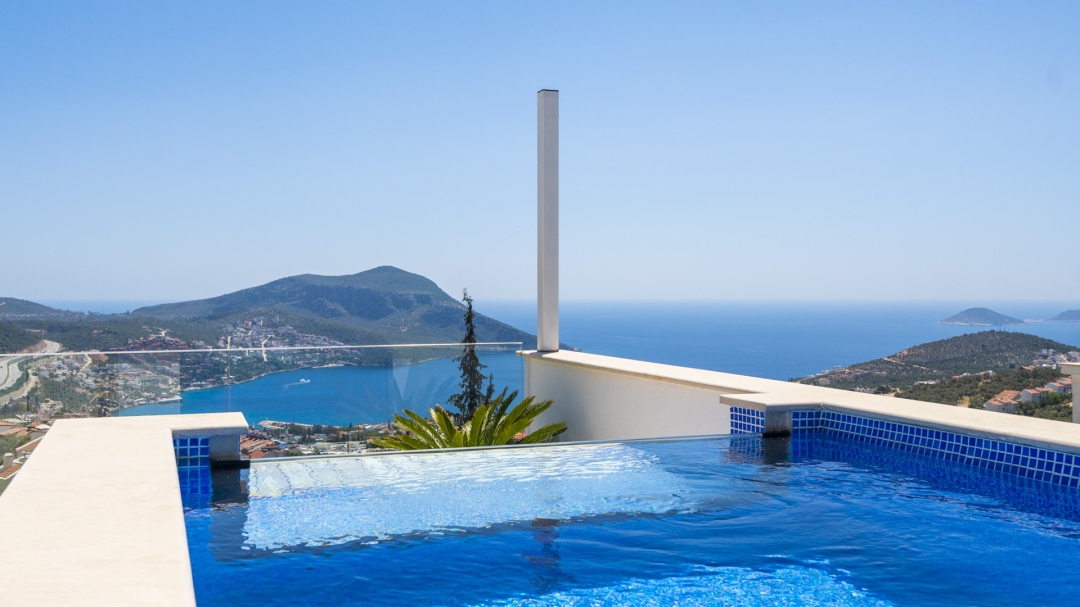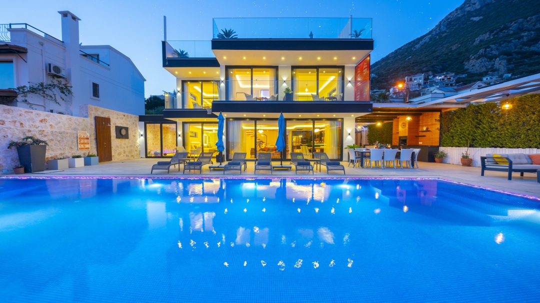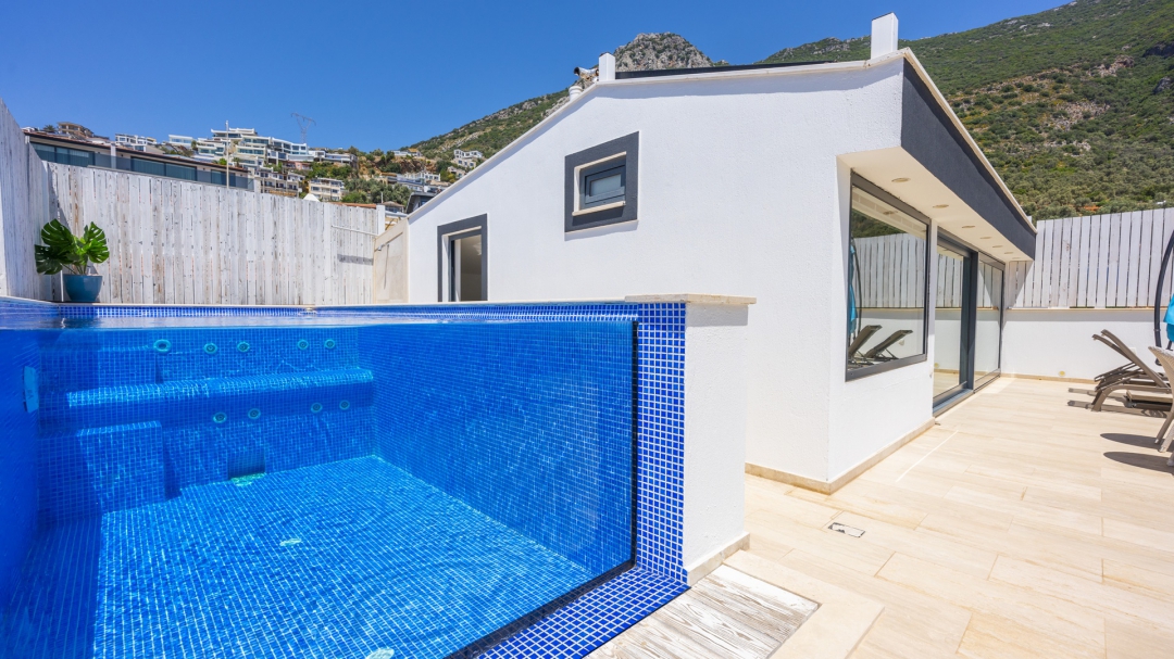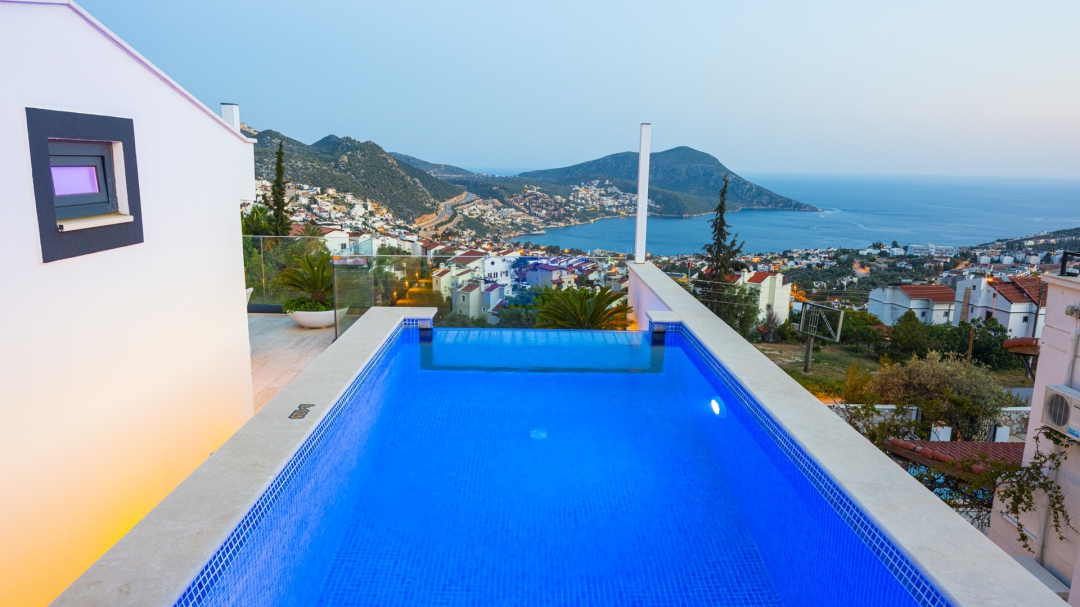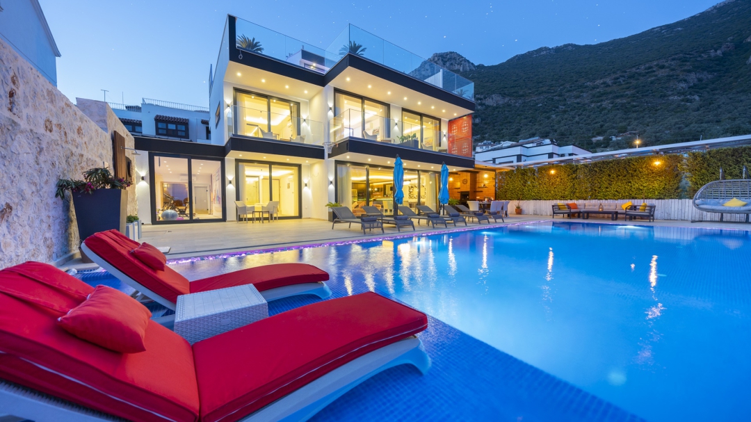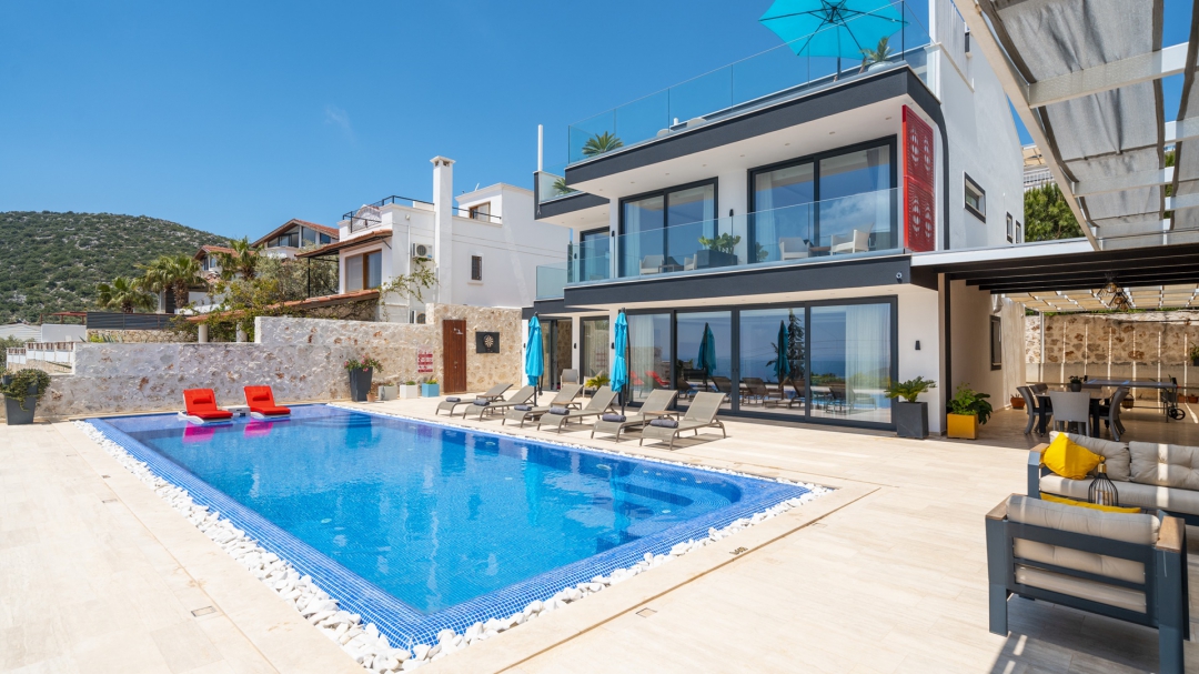 Eğer tatilinizde de lüksü seviyorsanız, bu seçeneğimiz size göre. Kalkan merkeze yakın bir lokasyonda yer alan bu villa, 10 kişilik konaklama kapasitesine sahip, donanım açısından oldukça zengin bir tercihtir. Deniz manzarasının yanında sauna, tük hamamı, çatı katında, serin geçen dönemler için ısıtmalı ve deniz manzaralı küçük bir havuz, sunduğu donanımlar arasında yer alır. Tatilde bile spor tutkusundan vazgeçemeyenler için fitness alanı vardır. Tüm yatak odaları en-suittir. Kalkan ve deniz manzarası sunan jakuzisi de, misafirlerine sunduğu bir başka opsiyondur. Anayoldan sadece 10 metre mesafedeki girişi, bu villa için ulaşımı da kolaylaştırır. Her detayı ile tamamen misafirlerinin lüksü ve rahatı düşünülerek dizayn edilmiştir. Kızıltaş bölgesinde yer alır.  Ana yol üzerindedir. Oda düzeni; zemin katta 1 adet, 1. katta 3 adet ve çatı katında 1 adet olmak üzere 5 oda şeklindedir.