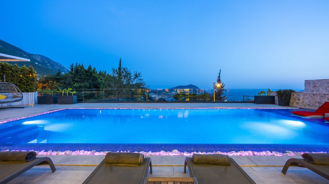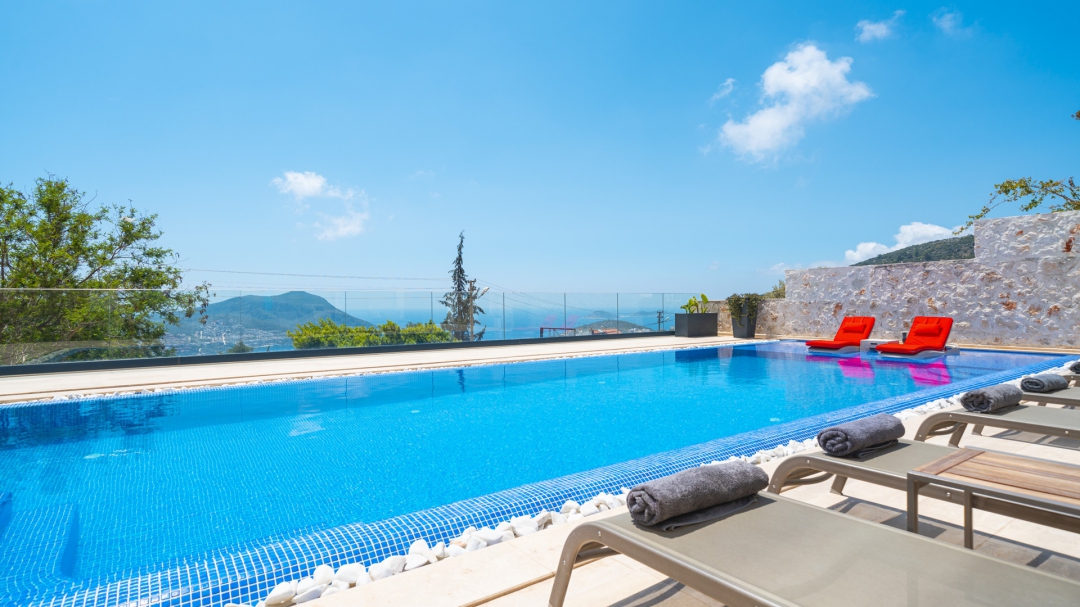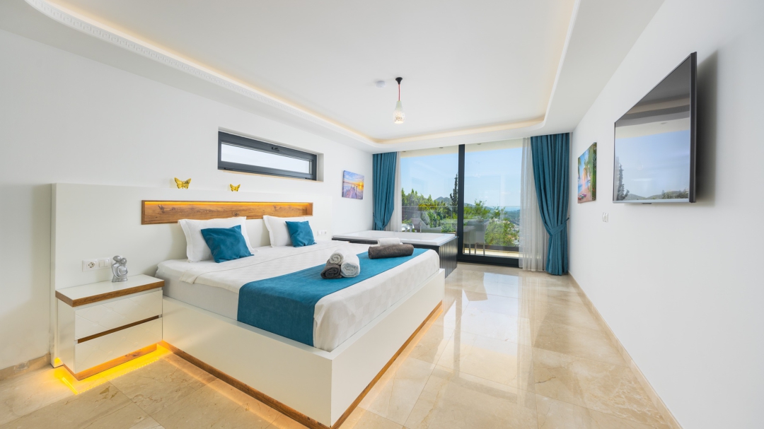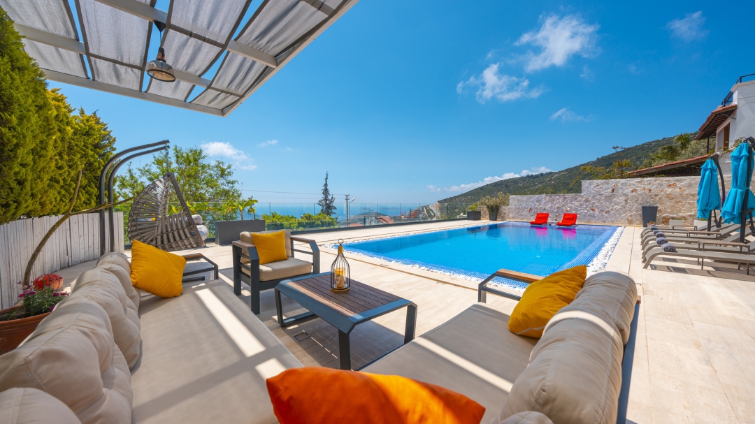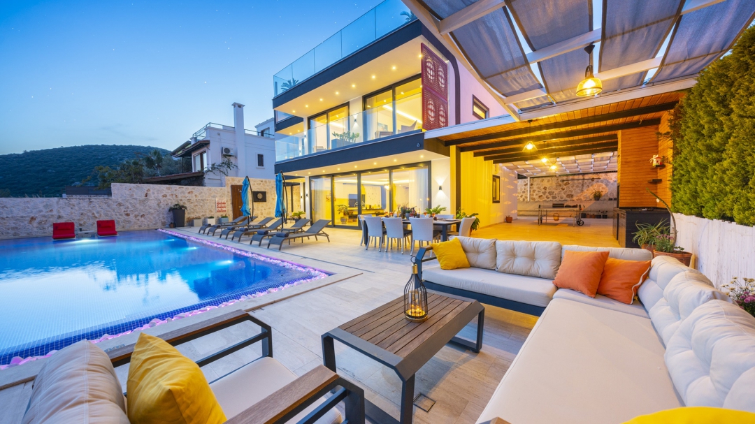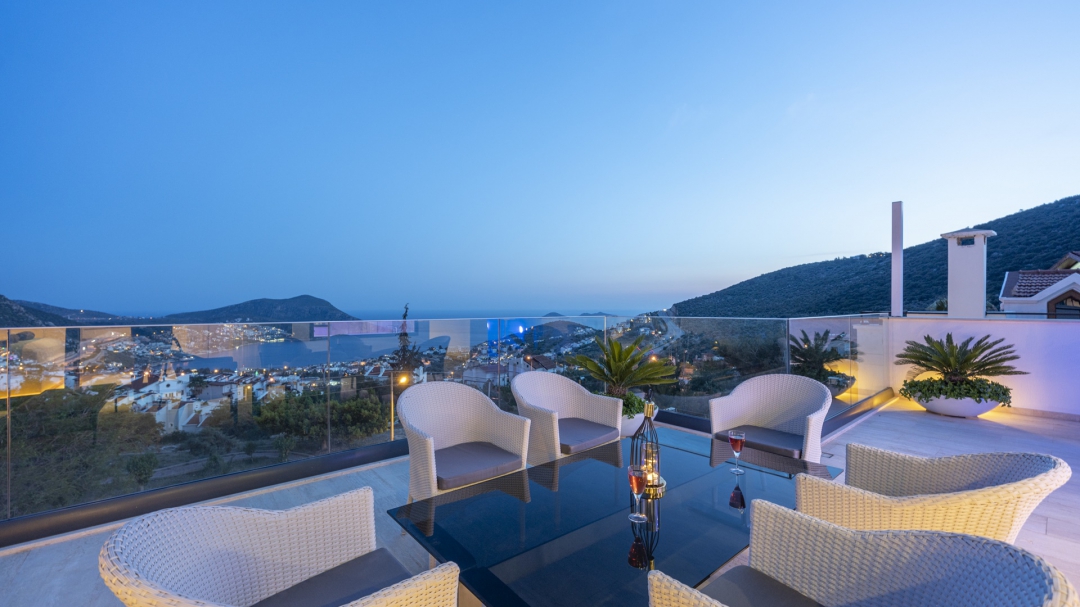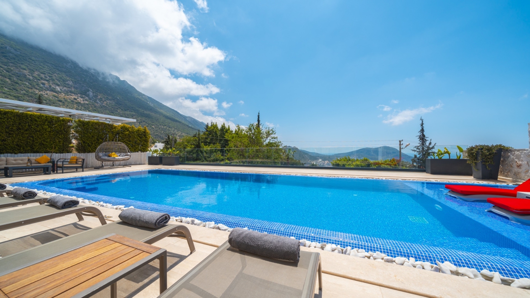Eğer tatilinizde de lüksü seviyorsanız, bu seçeneğimiz size göre. Kalkan merkeze yakın bir lokasyonda yer alan bu villa, 10 kişilik konaklama kapasitesine sahip, donanım açısından oldukça zengin bir tercihtir. Deniz manzarasının yanında sauna, tük hamamı, çatı katında, serin geçen dönemler için ısıtmalı ve deniz manzaralı küçük bir havuz, sunduğu donanımlar arasında yer alır. Tatilde bile spor tutkusundan vazgeçemeyenler için fitness alanı vardır. Tüm yatak odaları en-suittir. Kalkan ve deniz manzarası sunan jakuzisi de, misafirlerine sunduğu bir başka opsiyondur. Anayoldan sadece 10 metre mesafedeki girişi, bu villa için ulaşımı da kolaylaştırır. Her detayı ile tamamen misafirlerinin lüksü ve rahatı düşünülerek dizayn edilmiştir. Kızıltaş bölgesinde yer alır.  Ana yol üzerindedir. Oda düzeni; zemin katta 1 adet, 1. katta 3 adet ve çatı katında 1 adet olmak üzere 5 oda şeklindedir.