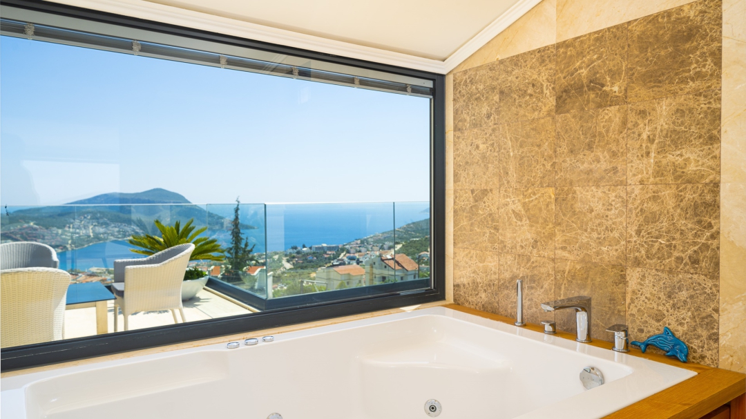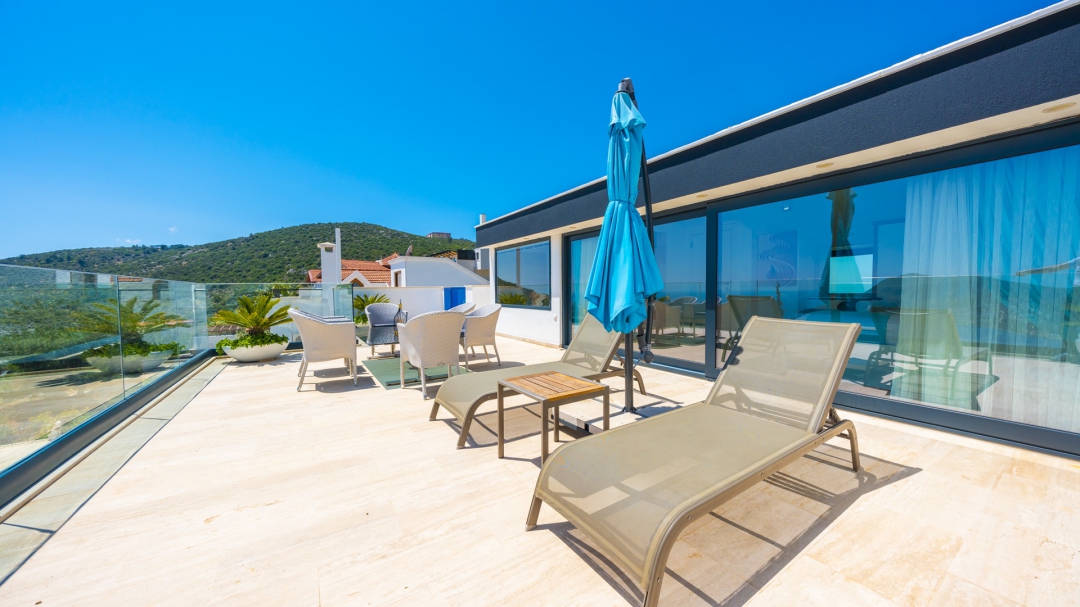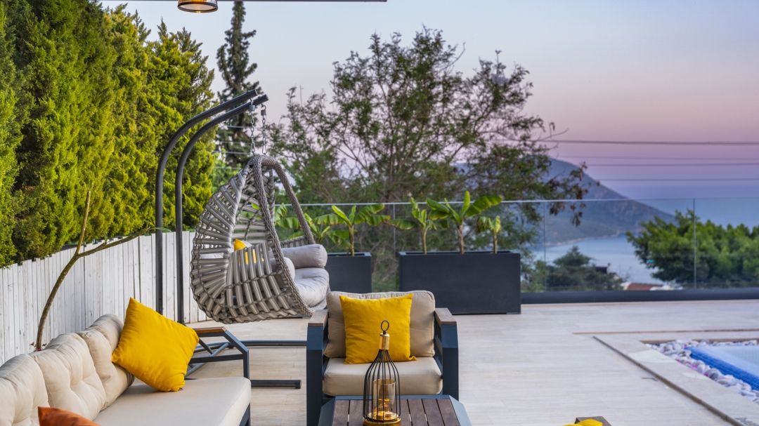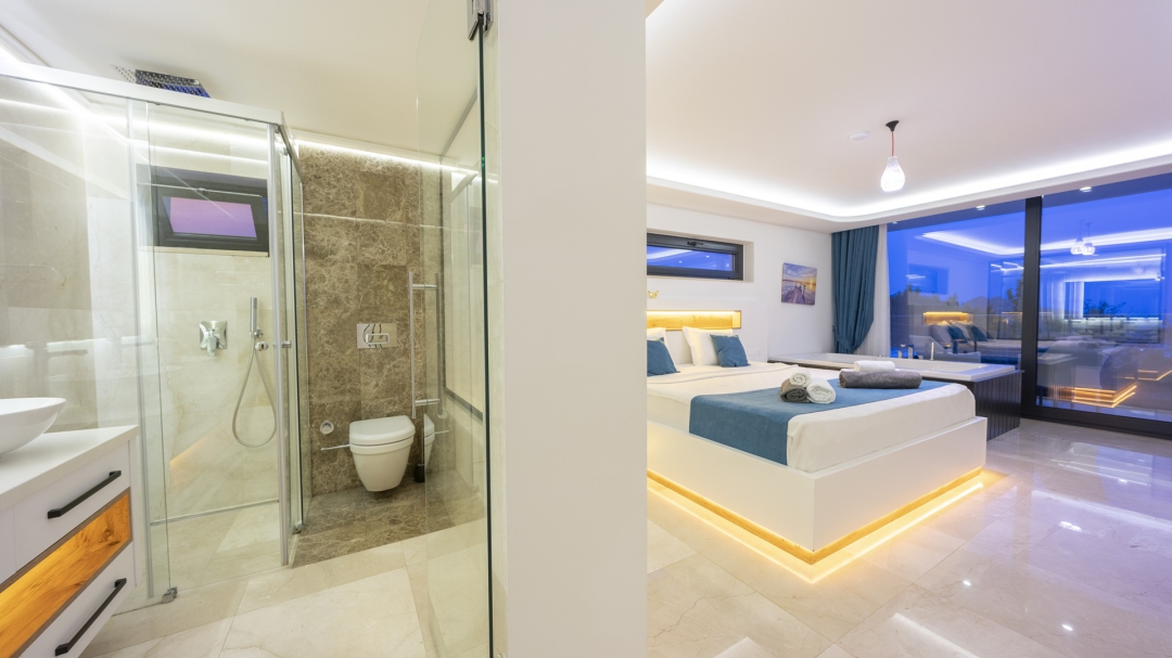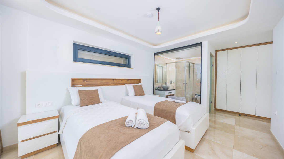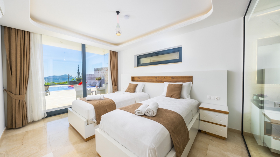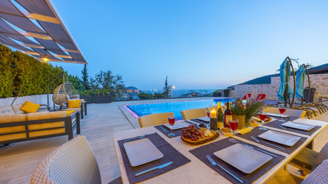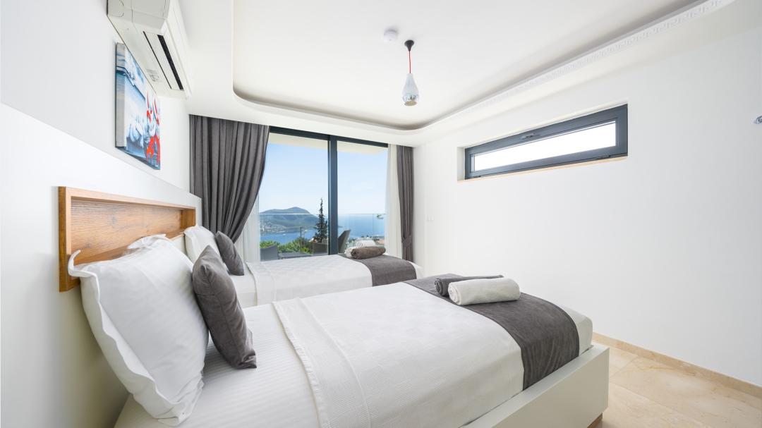 Eğer tatilinizde de lüksü seviyorsanız, bu seçeneğimiz size göre. Kalkan merkeze yakın bir lokasyonda yer alan bu villa, 10 kişilik konaklama kapasitesine sahip, donanım açısından oldukça zengin bir tercihtir. Deniz manzarasının yanında sauna, tük hamamı, çatı katında, serin geçen dönemler için ısıtmalı ve deniz manzaralı küçük bir havuz, sunduğu donanımlar arasında yer alır. Tatilde bile spor tutkusundan vazgeçemeyenler için fitness alanı vardır. Tüm yatak odaları en-suittir. Kalkan ve deniz manzarası sunan jakuzisi de, misafirlerine sunduğu bir başka opsiyondur. Anayoldan sadece 10 metre mesafedeki girişi, bu villa için ulaşımı da kolaylaştırır. Her detayı ile tamamen misafirlerinin lüksü ve rahatı düşünülerek dizayn edilmiştir. Kızıltaş bölgesinde yer alır.  Ana yol üzerindedir. Oda düzeni; zemin katta 1 adet, 1. katta 3 adet ve çatı katında 1 adet olmak üzere 5 oda şeklindedir.