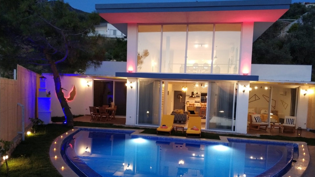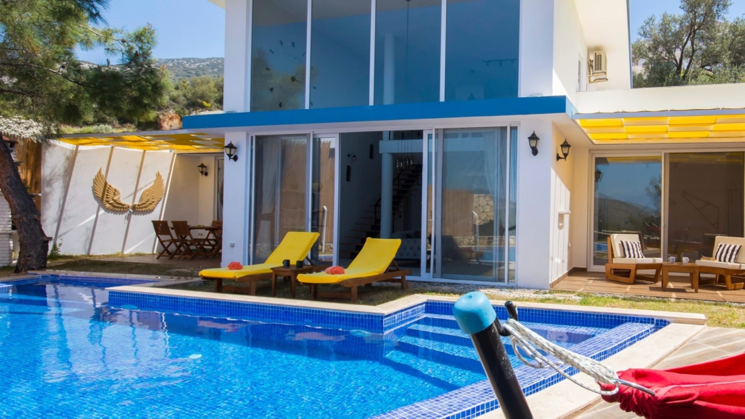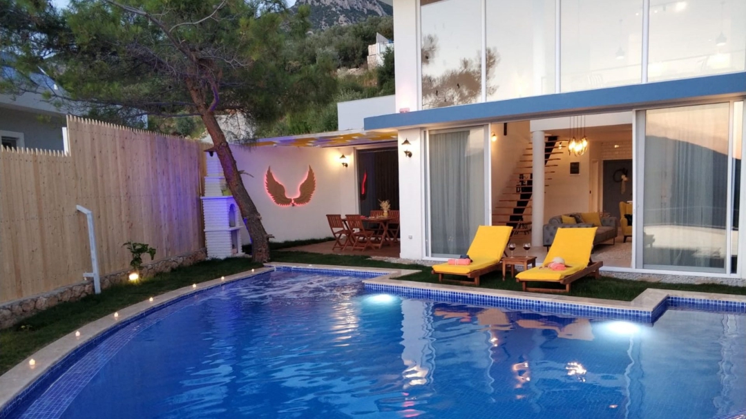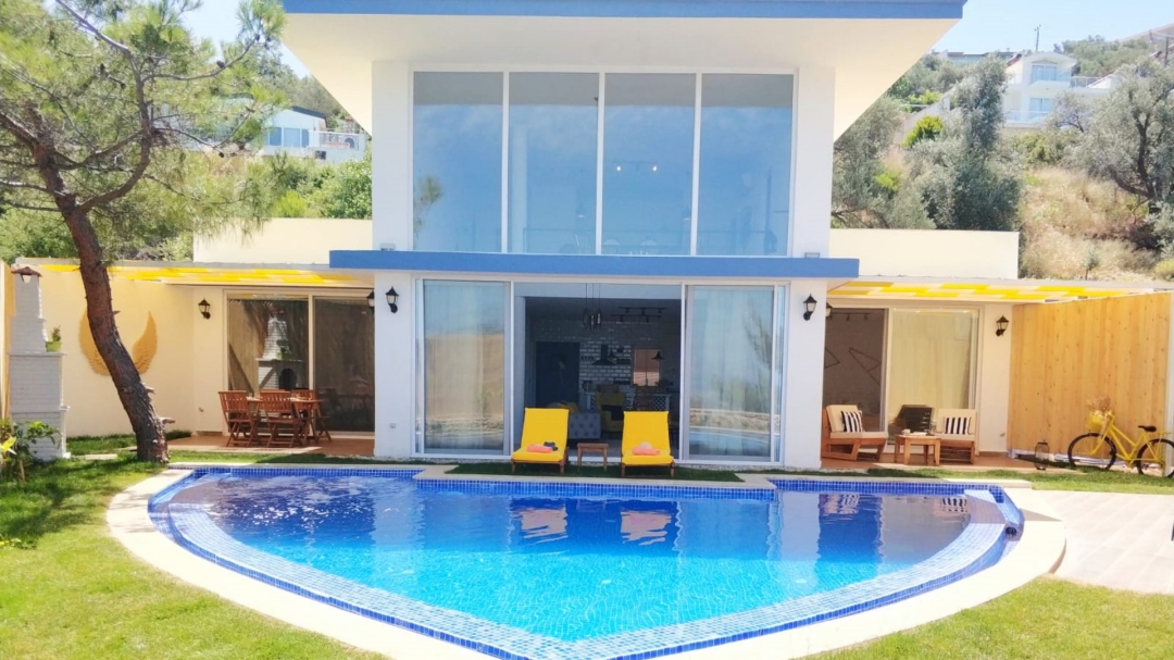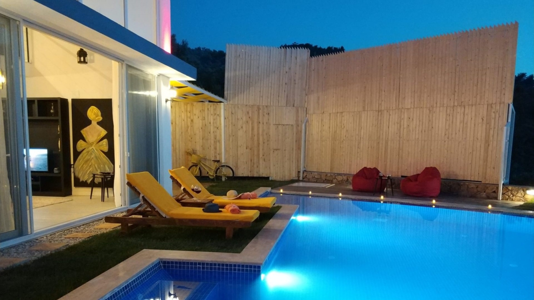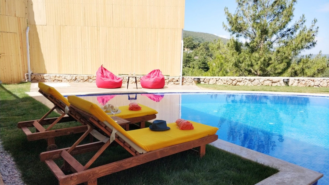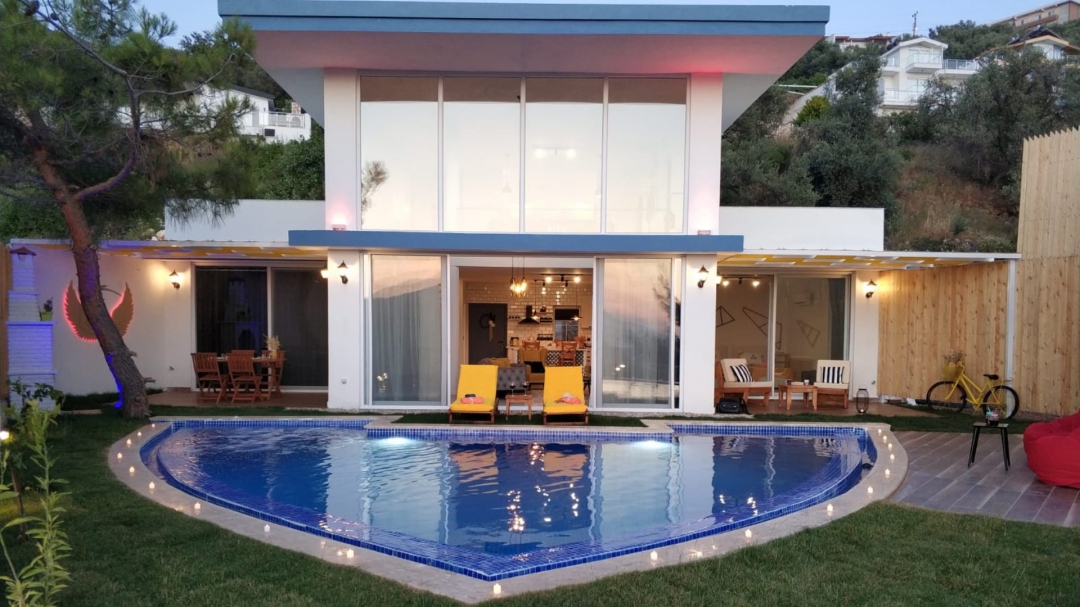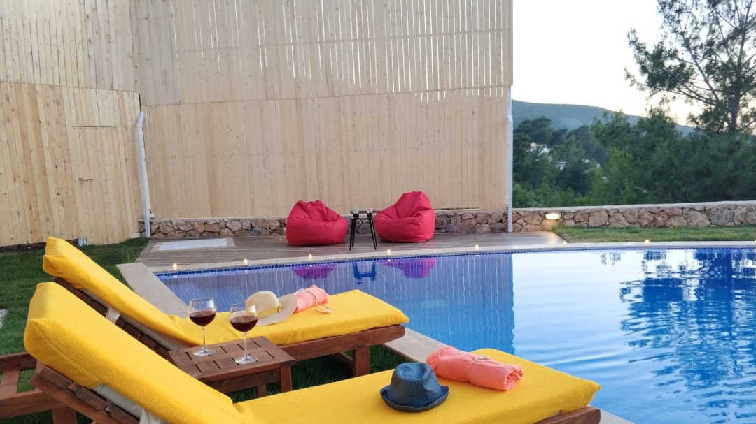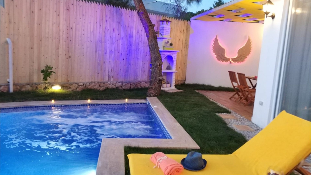 Havuz alanı korunaklı yapının,  Balayı konseptindedir. Asma kat detayı yapıya ferah bir hava katar. 2 yatak odalı yapı 4 kişilik konaklama kapasitesine sahiptir.