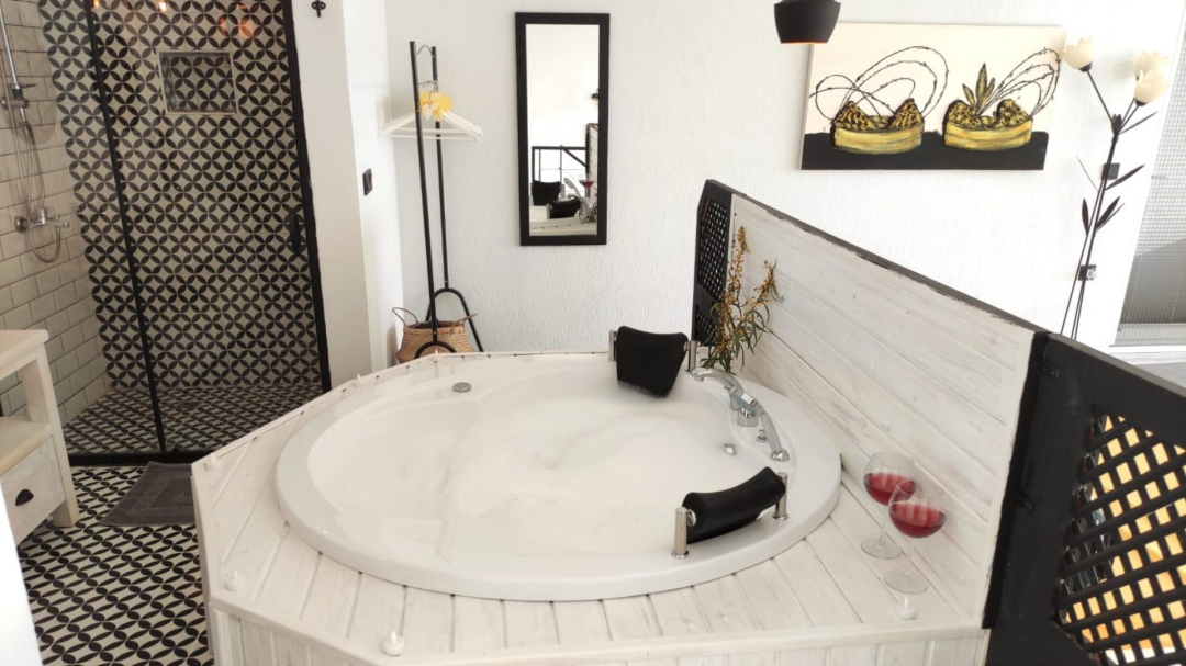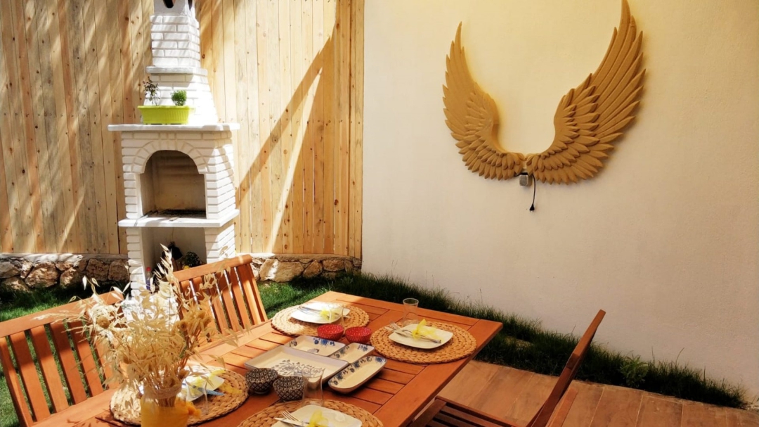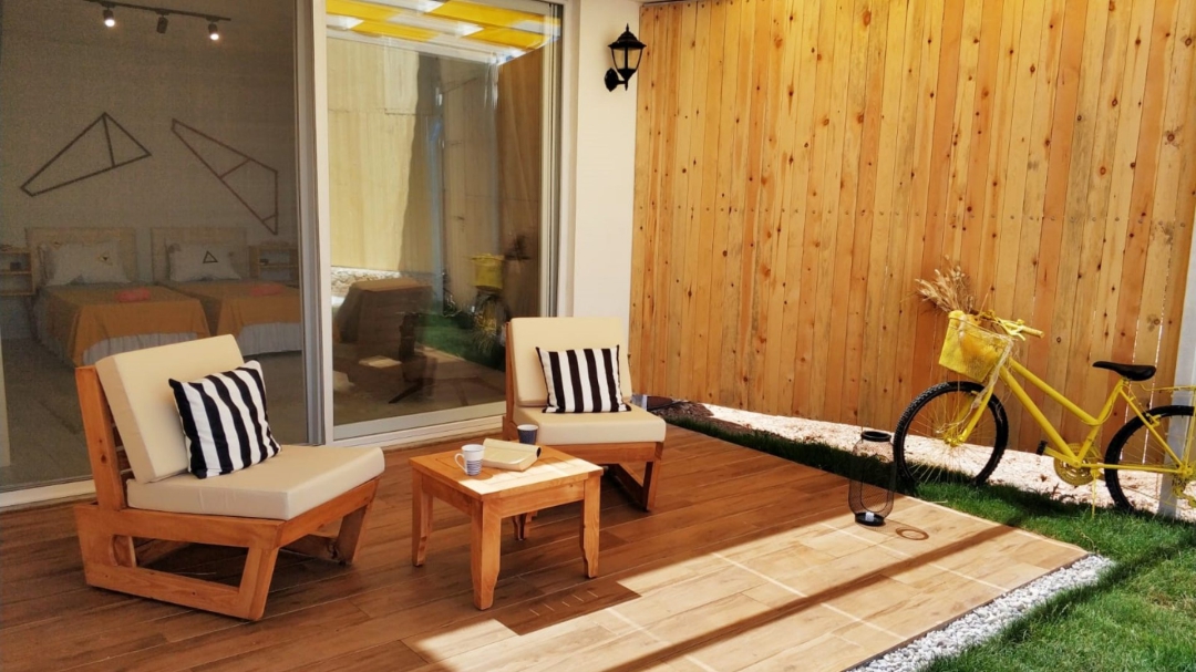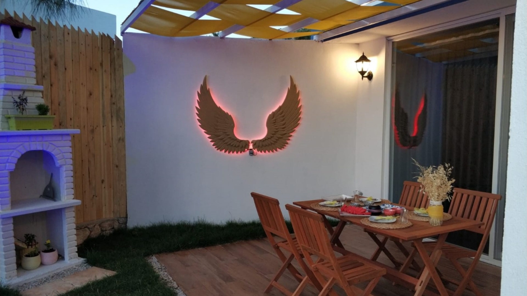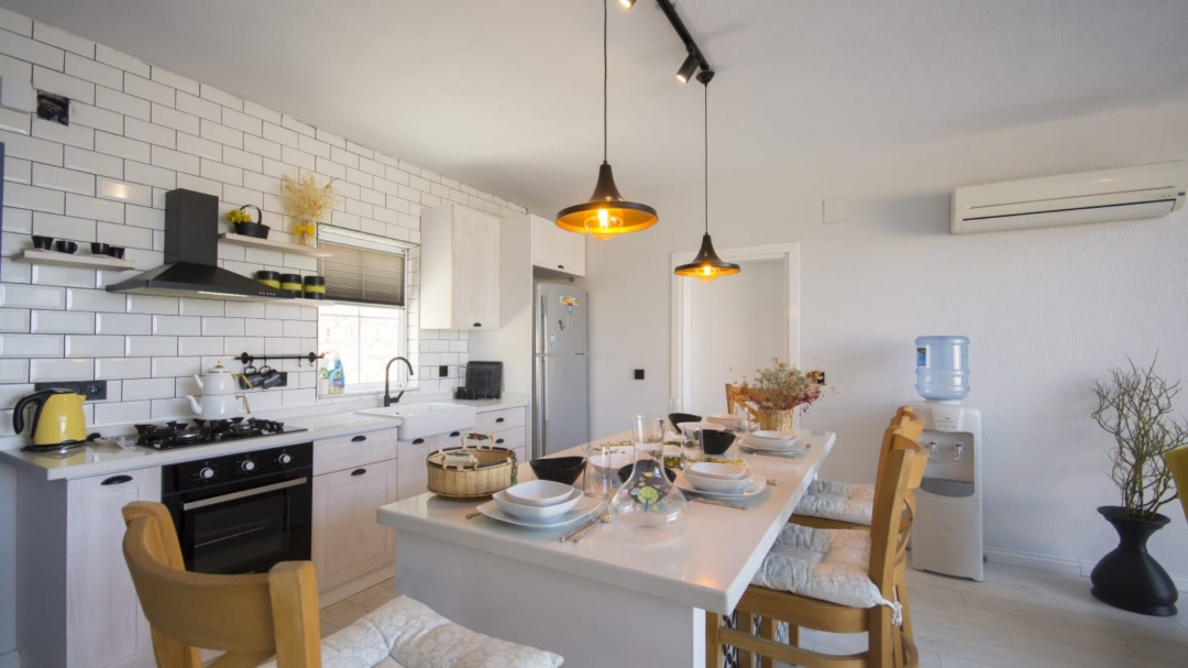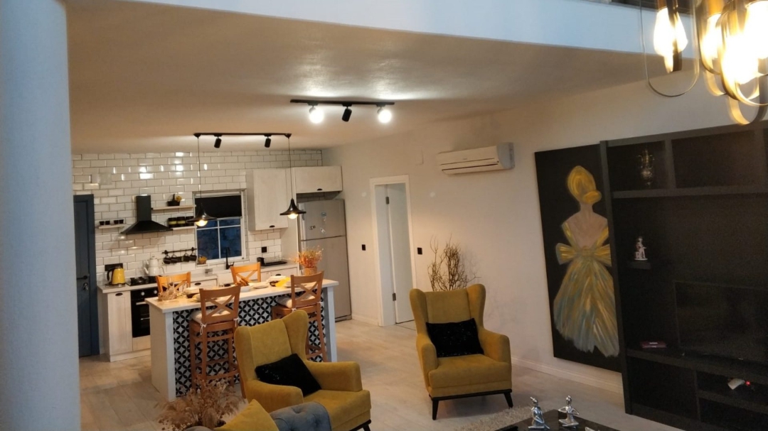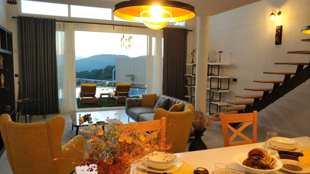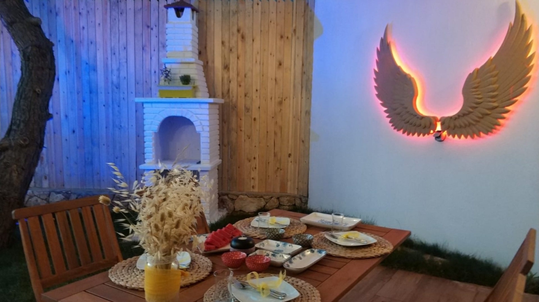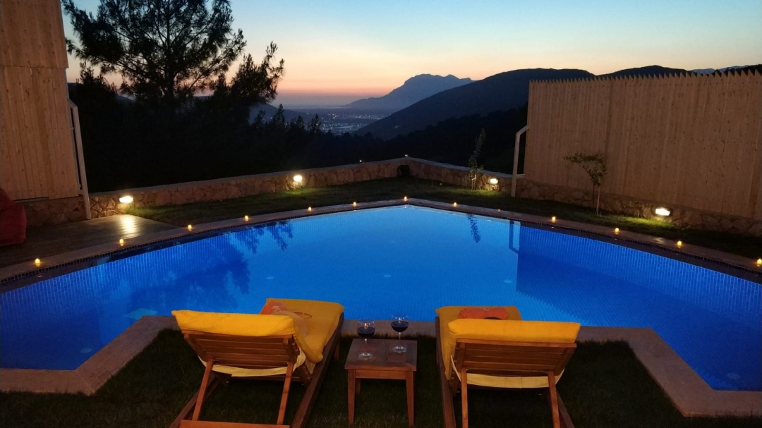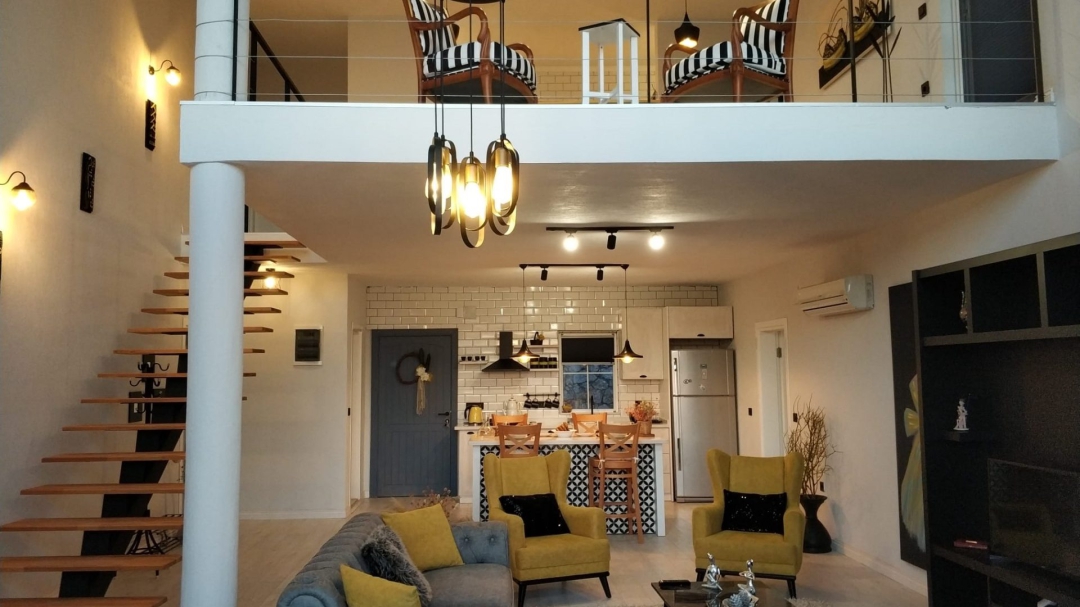 Havuz alanı korunaklı yapının,  Balayı konseptindedir. Asma kat detayı yapıya ferah bir hava katar. 2 yatak odalı yapı 4 kişilik konaklama kapasitesine sahiptir.