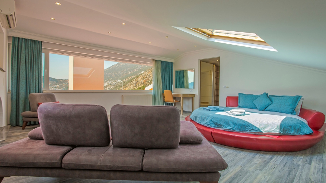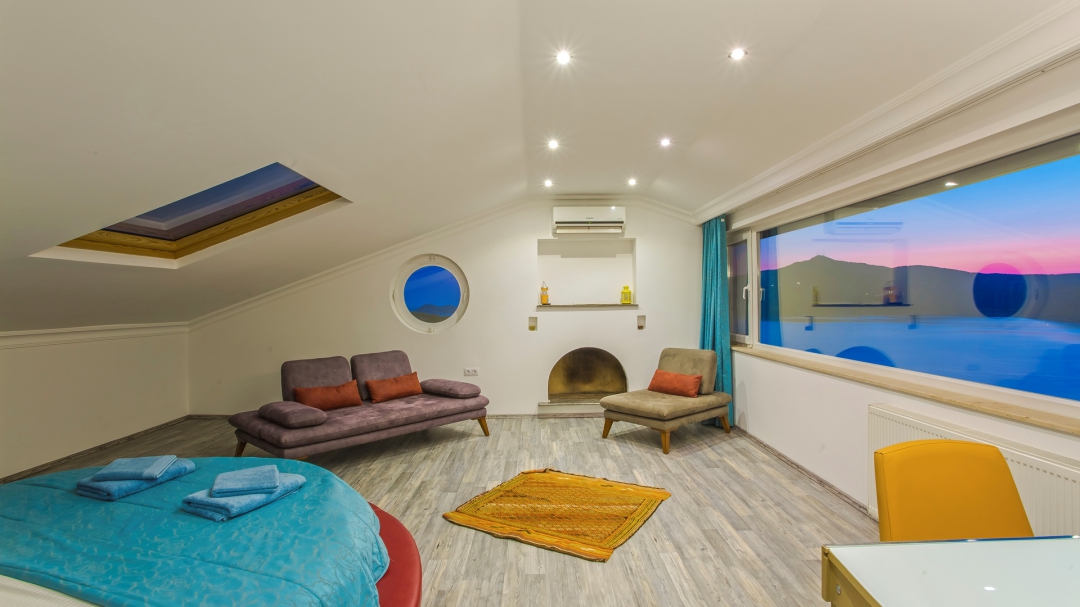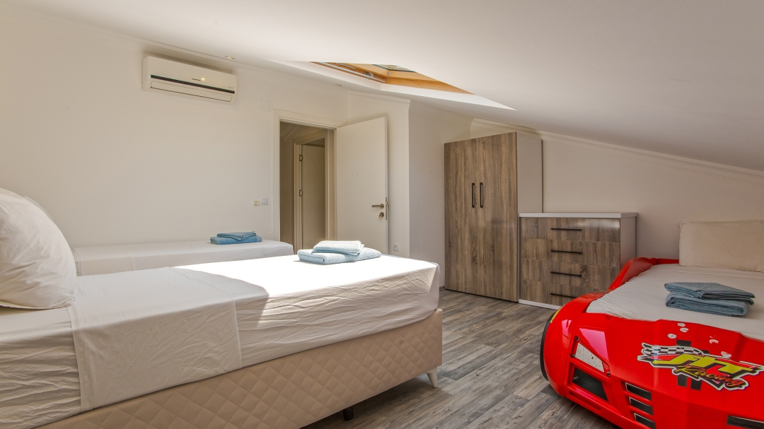 Çatı katında biri genç odası olmak üzere iki yatak odası bulunmaktadır. Genç odasında iki adet tek kişilik yatak ve bir çocuk yatağı bulunmaktadır. Son oda villanın ebeveyn yatak odasıdır. Bu en-suite odada yuvarlak çift kişilik yatak, koltuk, makyaj masası, şömine, gardırop bulunmaktadır.