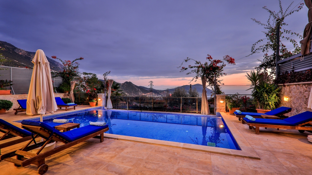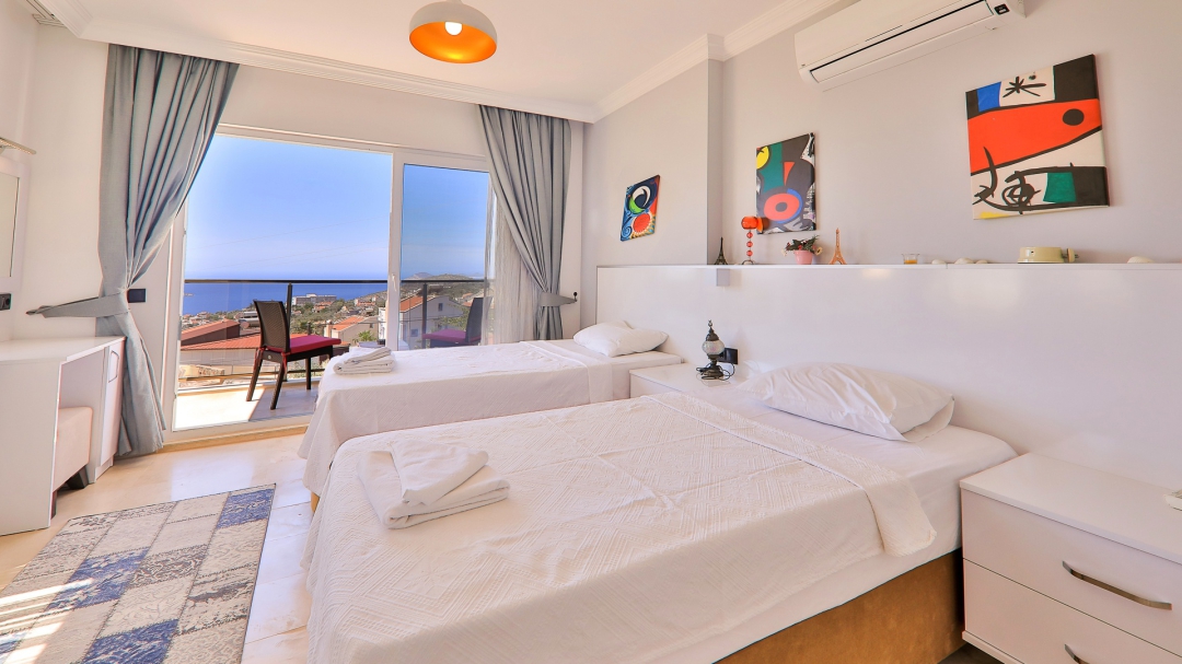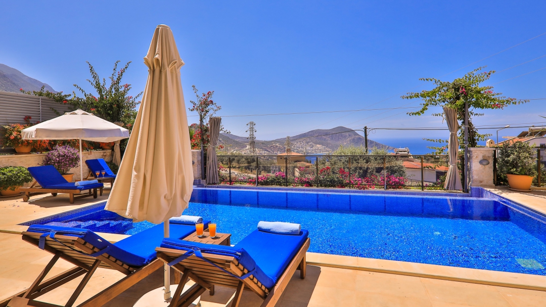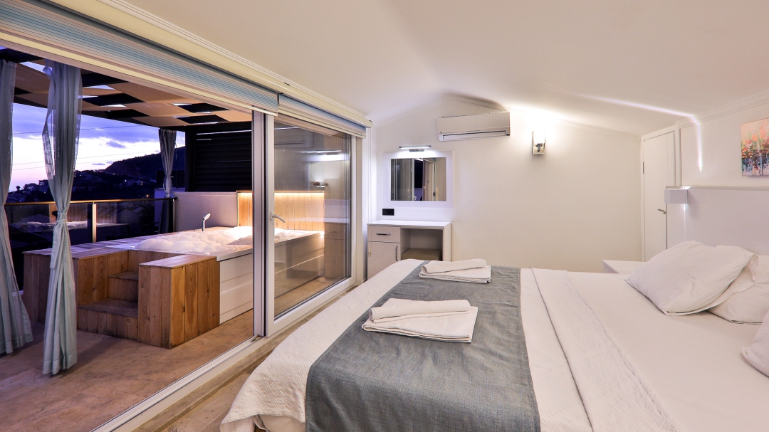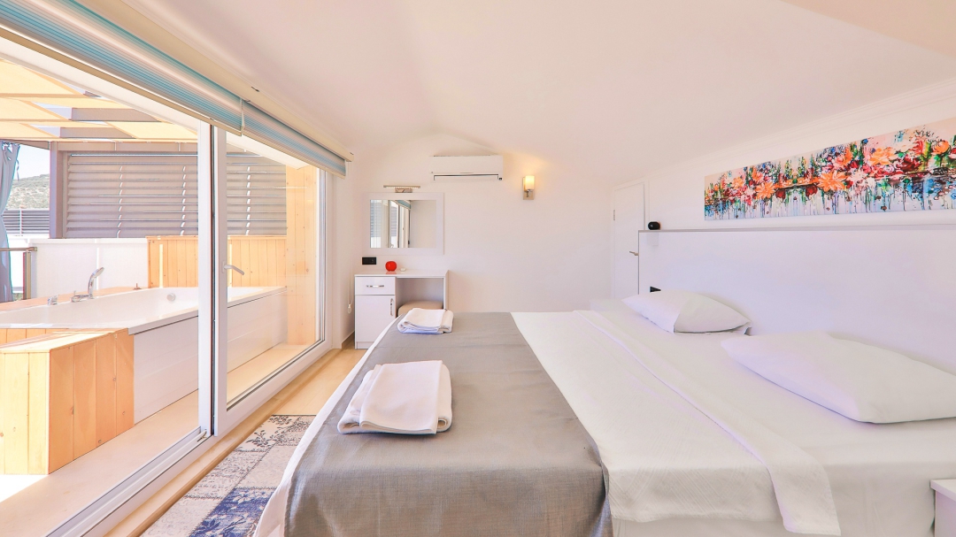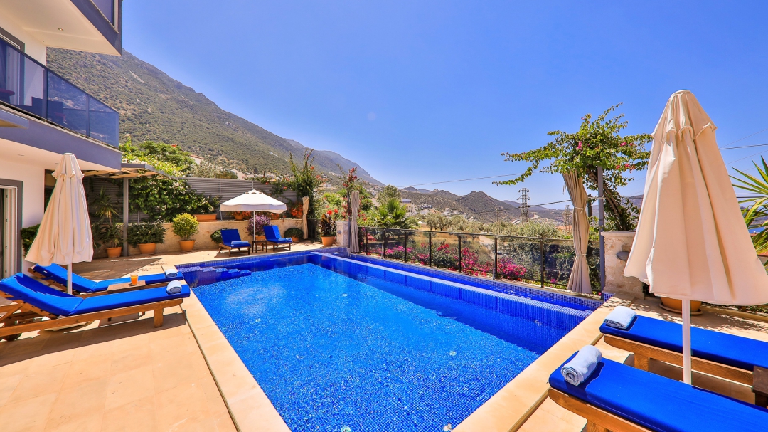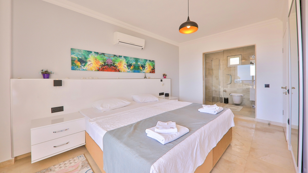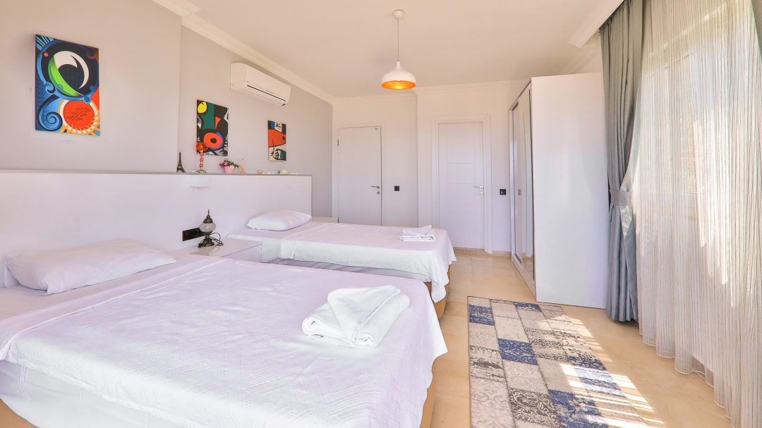 3 adet en suit odasının ikisinde çift kişilik yatak bulunan villa, Kalkan merkeze araç ile 3-5 dakikalık sürüş mesafesi uzaklıktadır. Havuz alanı yabancı gözlerden izole hale getirilmiştir. Aynı zamanda çocuklar için çocuk havuzu vardır.