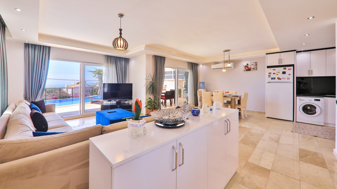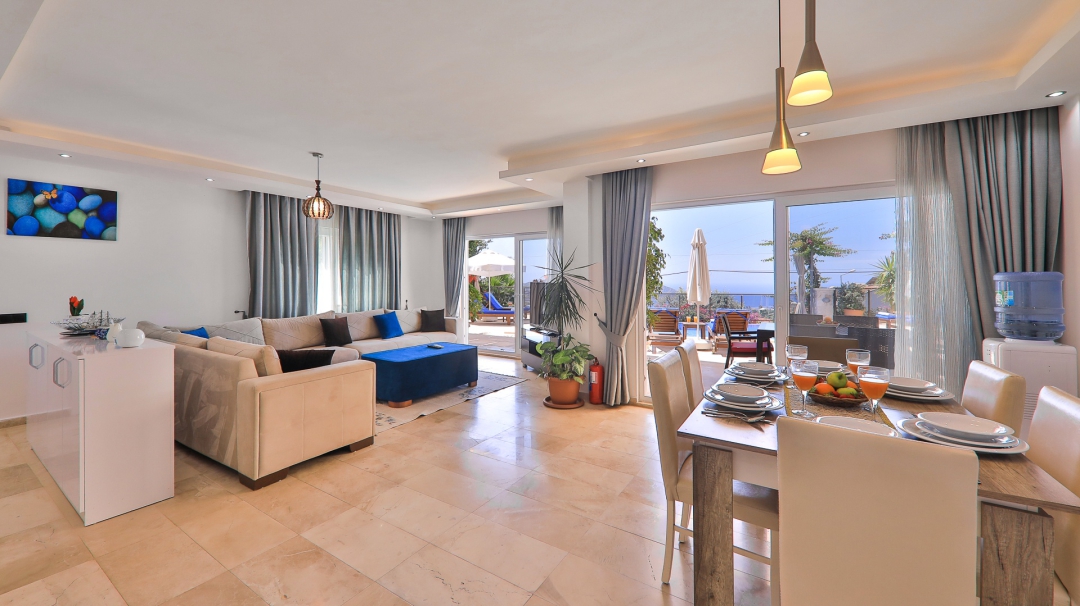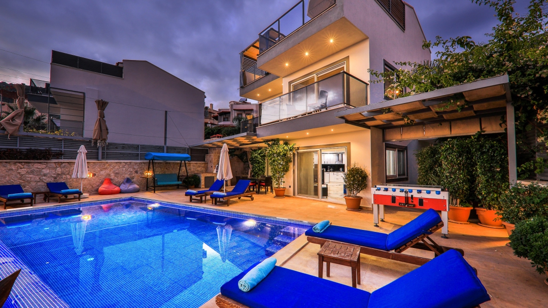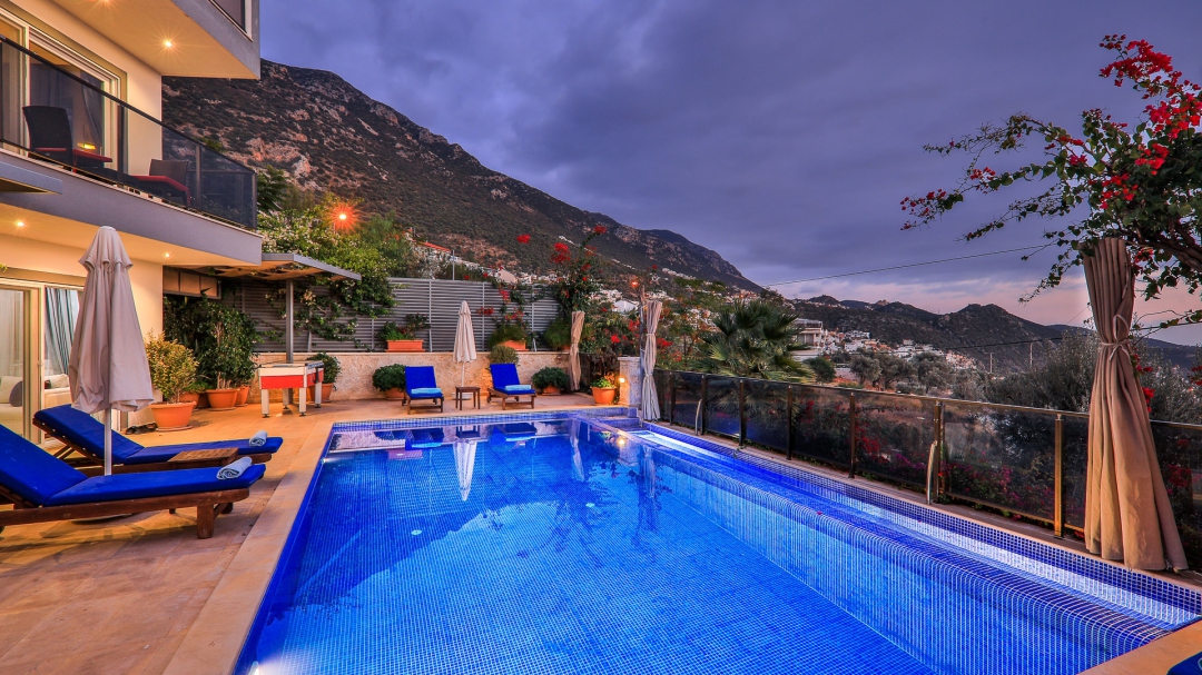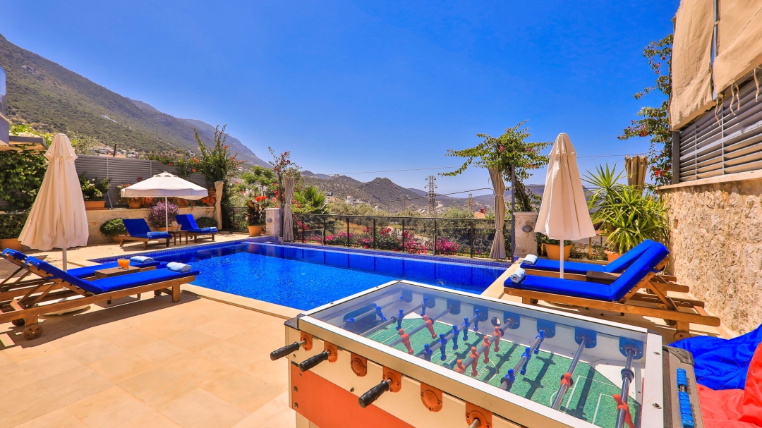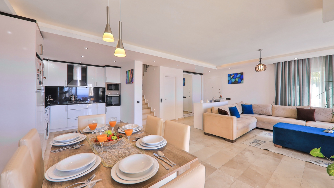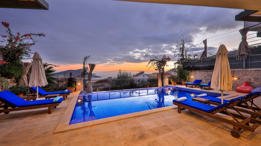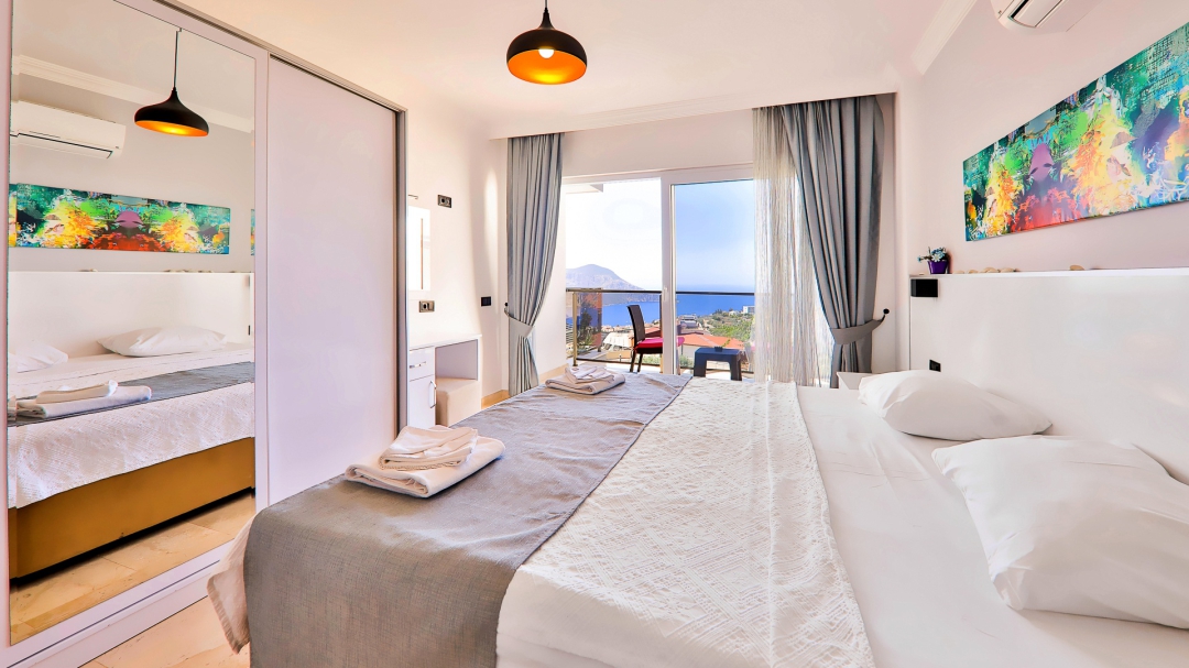 3 adet en suit odasının ikisinde çift kişilik yatak bulunan villa, Kalkan merkeze araç ile 3-5 dakikalık sürüş mesafesi uzaklıktadır. Havuz alanı yabancı gözlerden izole hale getirilmiştir. Aynı zamanda çocuklar için çocuk havuzu vardır.