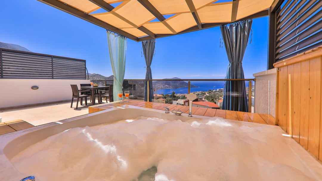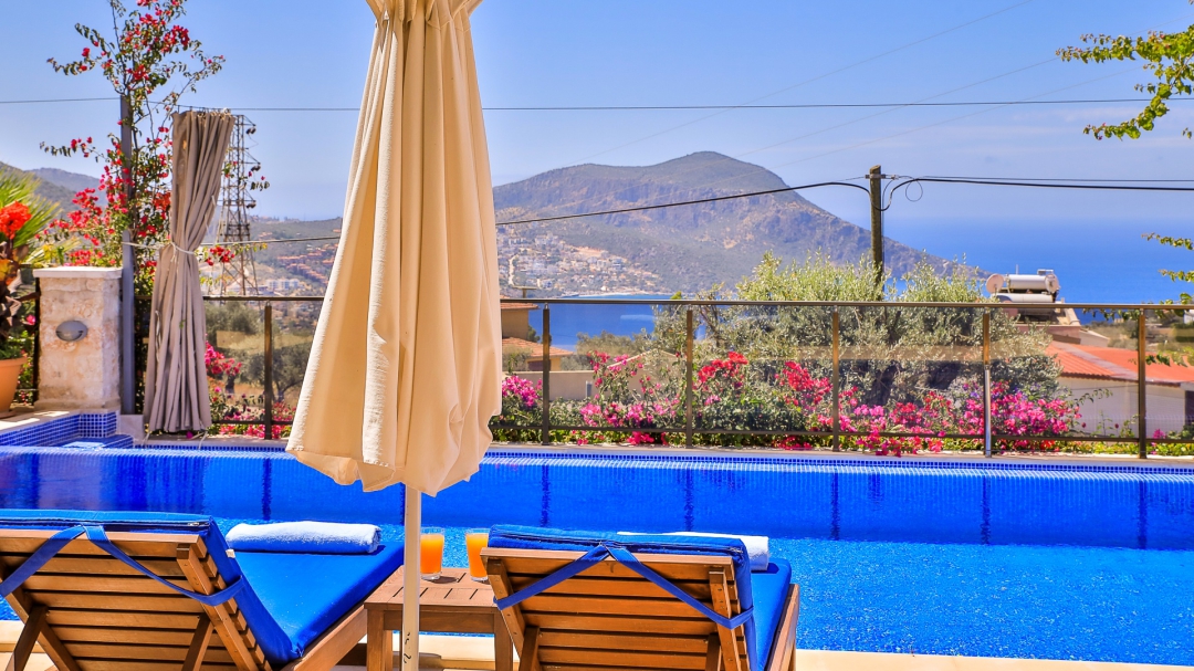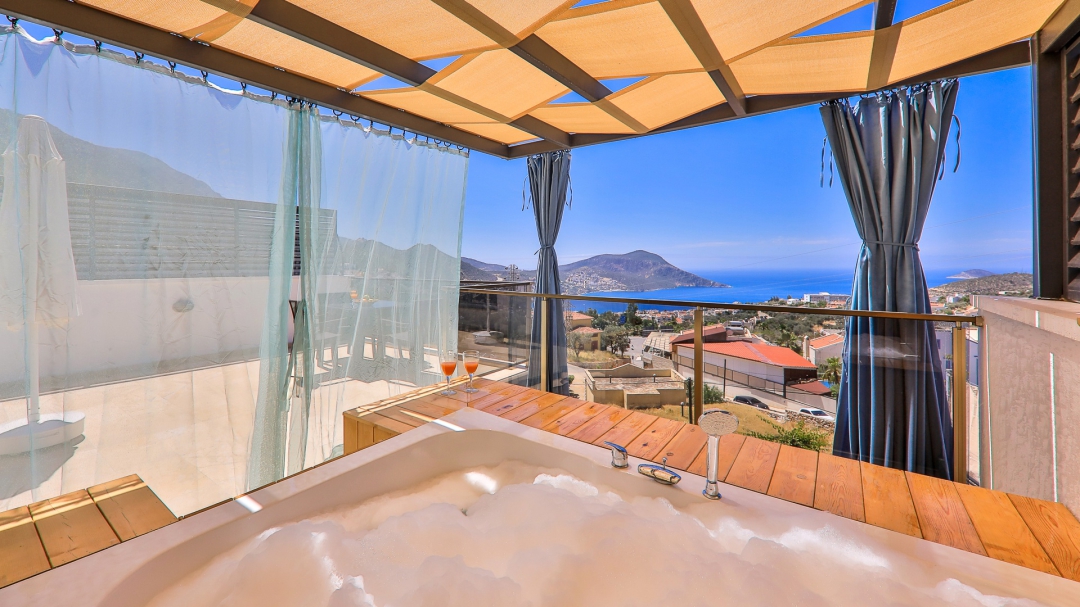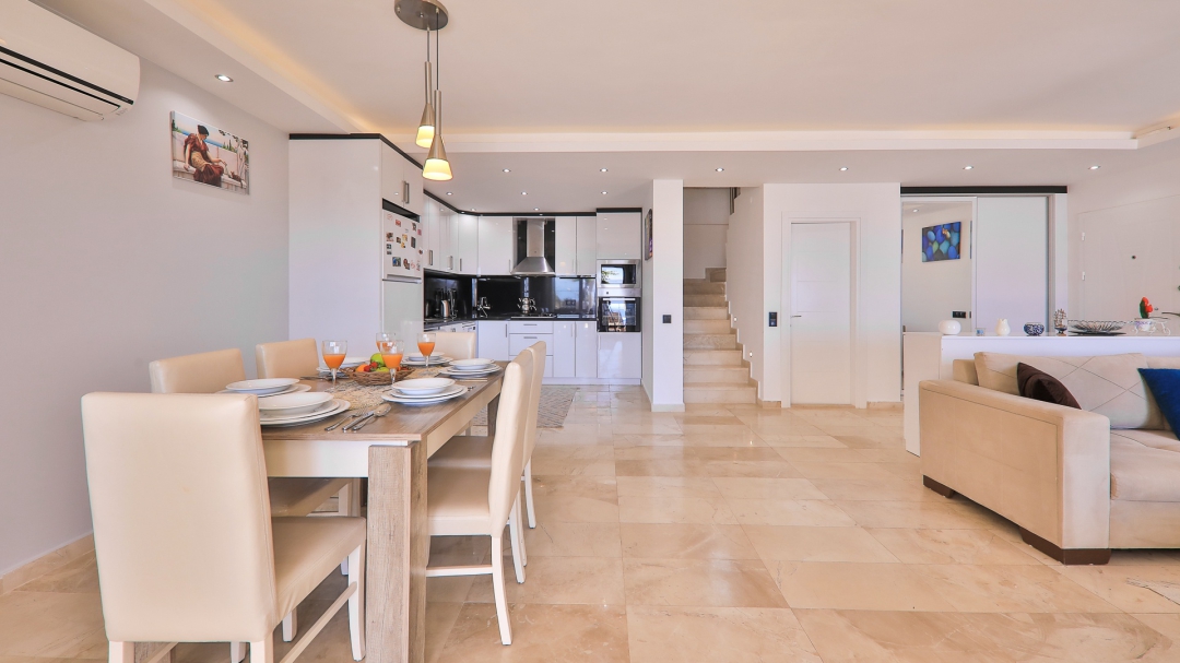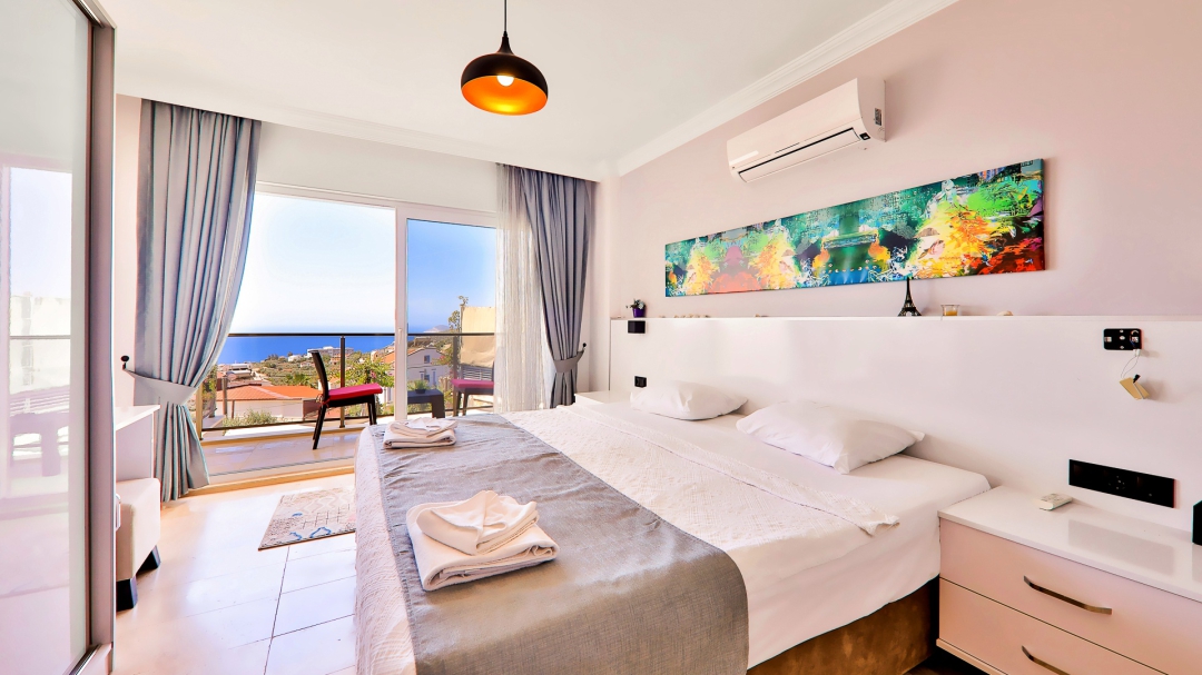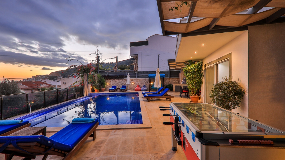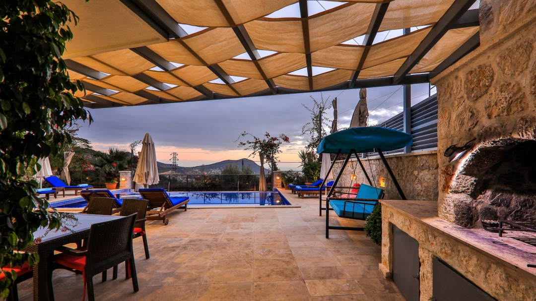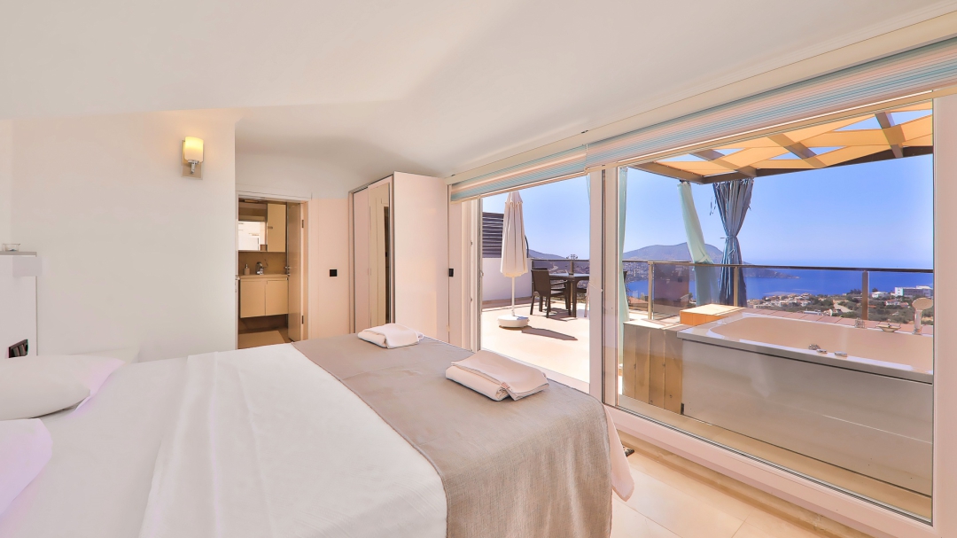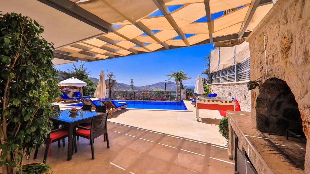 3 adet en suit odasının ikisinde çift kişilik yatak bulunan villa, Kalkan merkeze araç ile 3-5 dakikalık sürüş mesafesi uzaklıktadır. Havuz alanı yabancı gözlerden izole hale getirilmiştir. Aynı zamanda çocuklar için çocuk havuzu vardır.