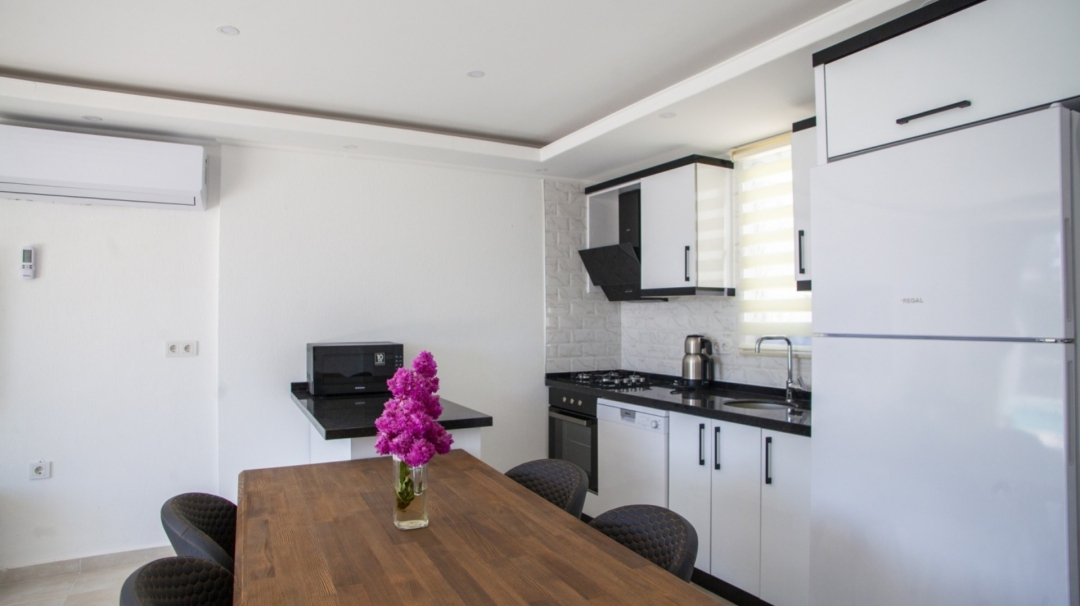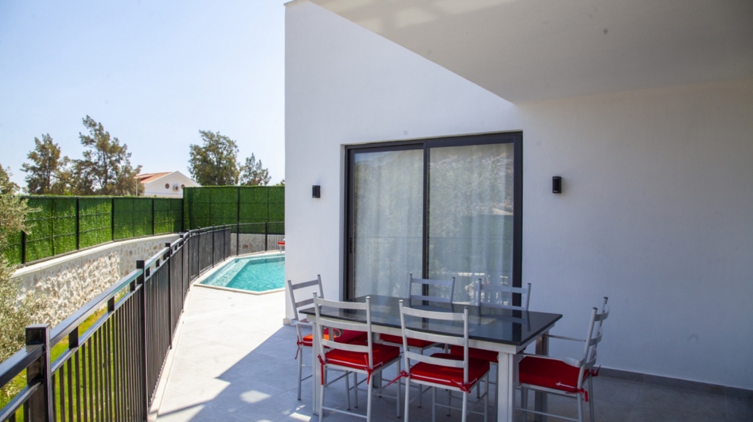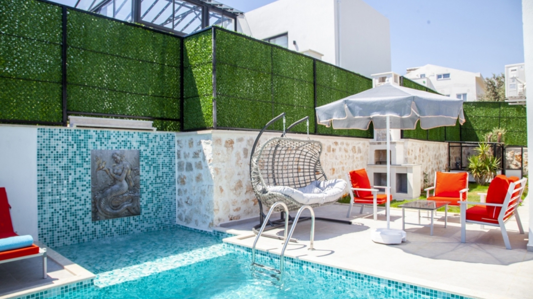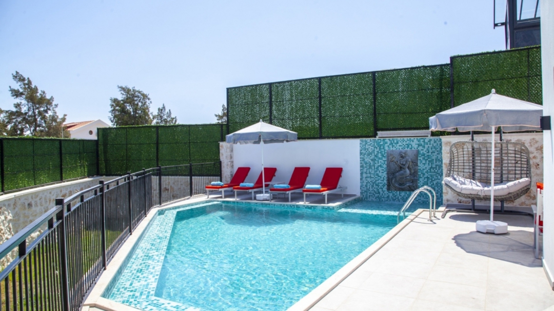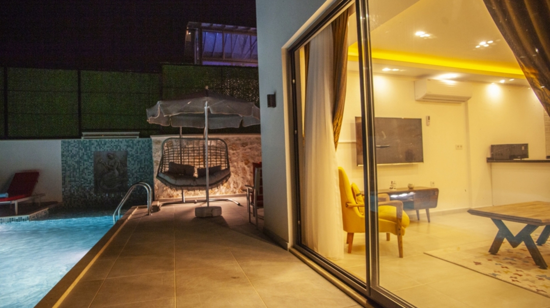 Villa, Kalkan merkezde yer alır. 4'lü grup villadan birisidir. Zemin katında havuz terası, çatı katında ise ısıtmalı havuzu yer alır. 1 kasımdan 1 ekime havuz ısıtma ücreti kiralama ücretine dahildir. 2 odalı yapı beklentilerinizi karşılayacak şekilde ve rahat bir tatil deneyimi sunmak amaçlı dizayn edilmiştir.