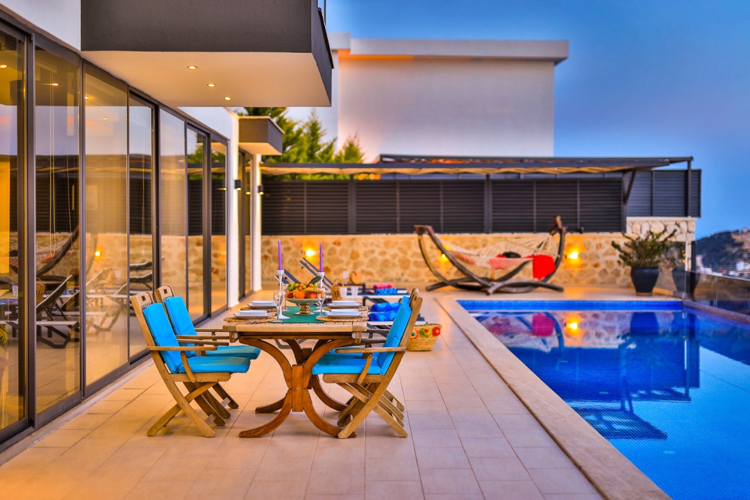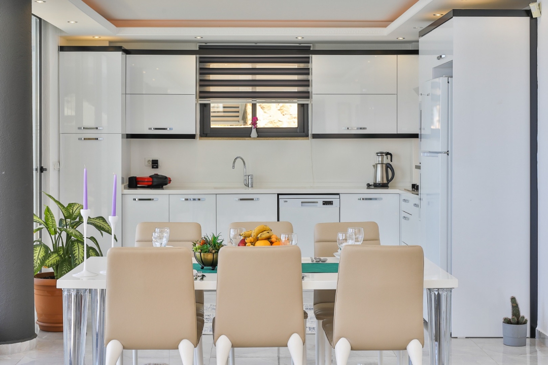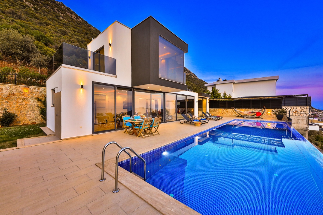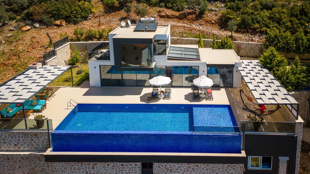 Modern mimarisi ile ön plana çıkan villamızın oturma odasında uzaktan kumandalı açılır kapanır perdeli bir tavan penceresi bulunmakta, akşamları bu perdeyi açarak her daim yıldızları da oturduğunuz yerden görebilirsiniz. Havuz terasında ya da içerideki yemek odasında yemeklerinizi yerken yine muhteşem bir Akdeniz manzarası sizlere eşlik edecektir. Bu katta iki tek kişilik yataktan oluşan banyolu genç yatak odası bulunmakta olup, bu odadan direkt havuz terasına çıkış vardır. Merdivenler ile ulaşılan ikinci katta ise çift kişilik yatağın bulunduğu ebeveyn yatak odası mevcuttur. Yine muhteşem manzaralı bu odada, geniş ebat bir jakuzi, banyo wc ve balkon bulunmaktadır. Komple cam olarak dizayn edilen seyir camlarından manzarayı kesintisiz olarak görebilir, sabah kalktığınızda bu manzaraya karşı uyanabilirsiniz.Villa içinde ihtiyacınız olan tüm mobilya mutfak araç gereçleri ütü saç kurutma makinesine kadra mevcuttur.