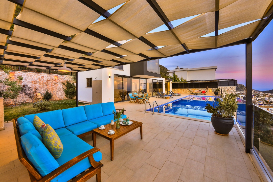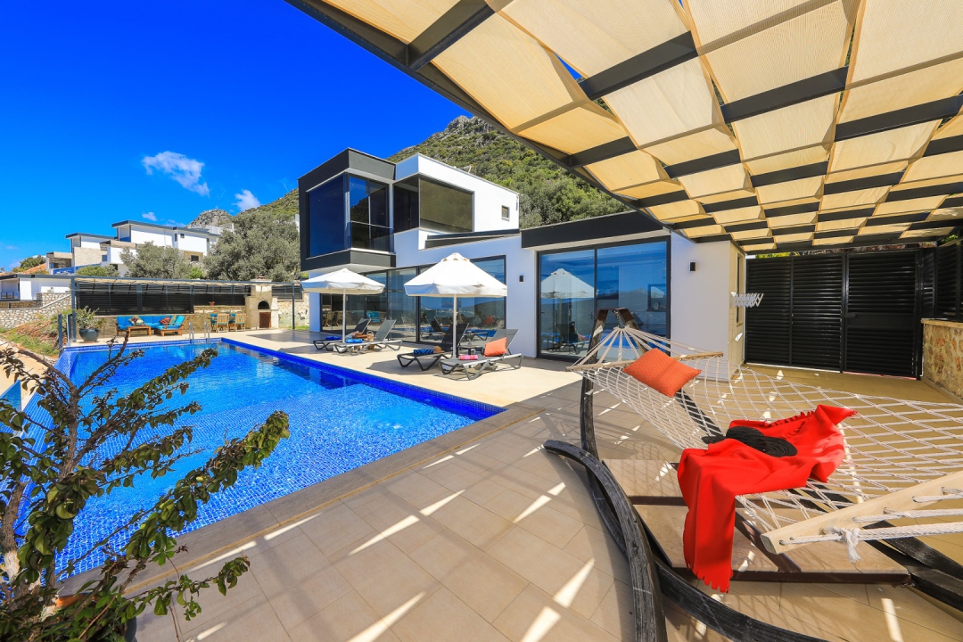 Kalkan, Kördere mevkiinde bulunan bu lüks kiralık tatil villası, 2 süit (banyolu) yatak odası ile 4 kişilik kapasiteye sahiptir. Toros dağlarının eteklerinde yüksek bir konuma sahip olan villa muhteşem bir panoramik manzaraya sahip olup villanın her yerinden bu manzarayı görebilirsiniz.