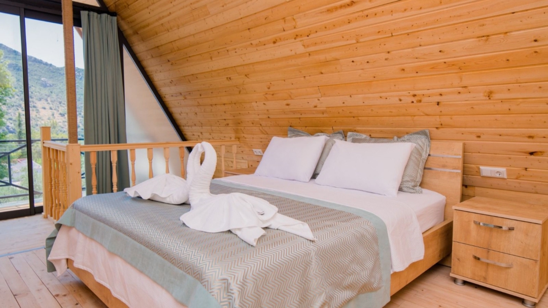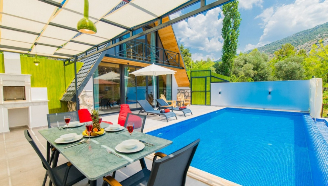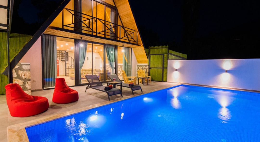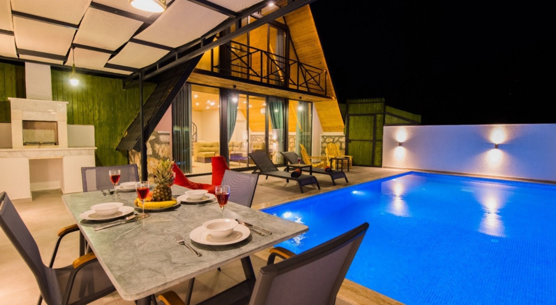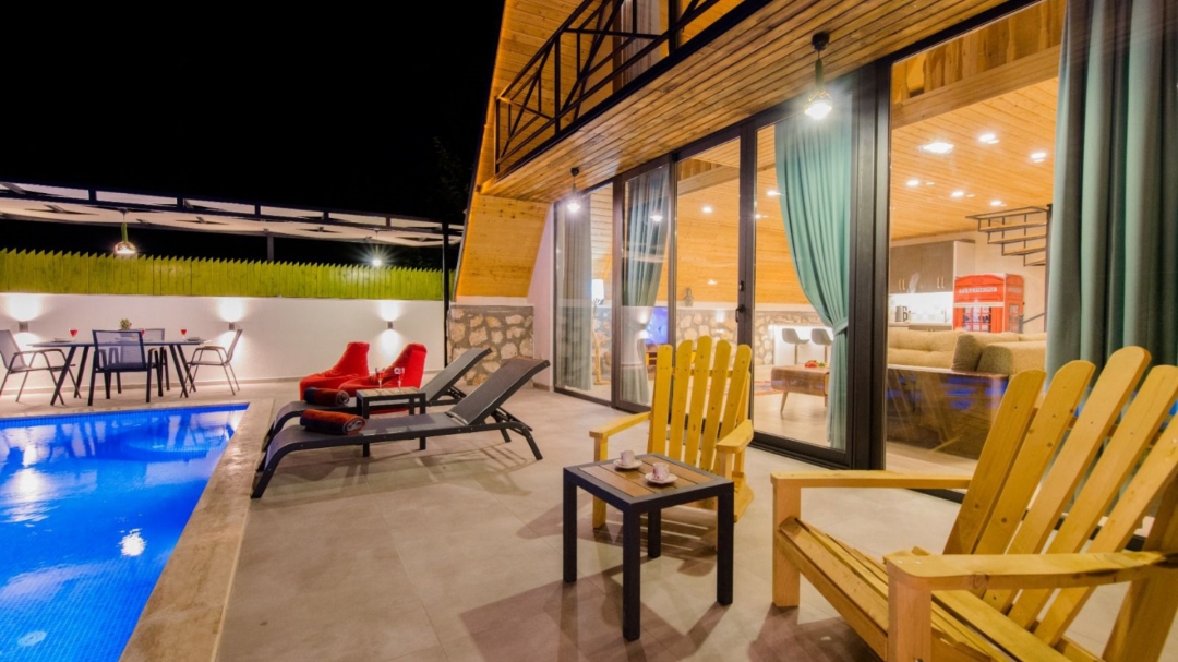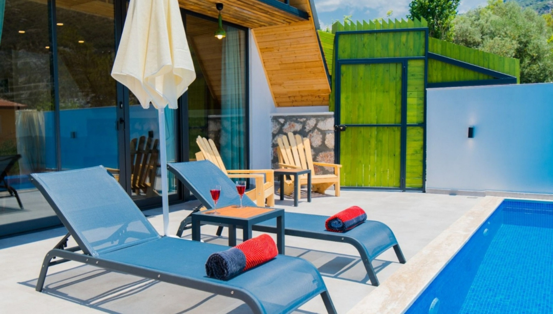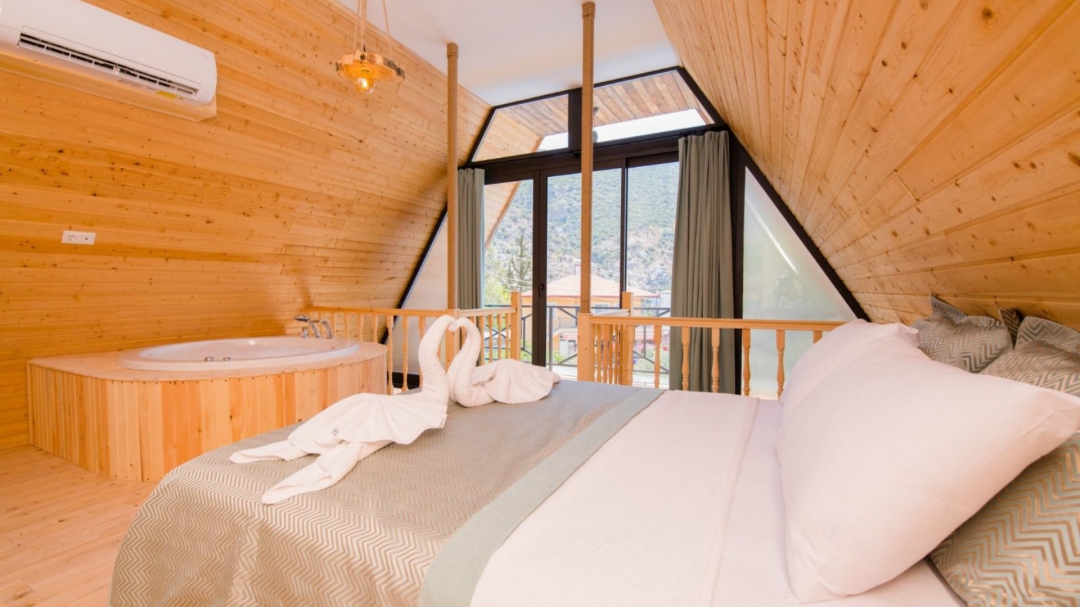 Ahşap bungalov tarzındaki yapı tek yatak odalıdır. İslamlar köy yolu üzerinde yer alır. Havuz alanı korunaklıdır. İki kişilik seçenek balayı konseptindedir. Kalkan merkeze yaklaşık 5 kilometre uzaklıktadır. Doğa içinde yer alır. Zemin kat; salon, mutfak ve havuz terasından oluşur. Yatak odası asma kat şeklindedir. Yatak odasında jakuzi de mevcuttur.