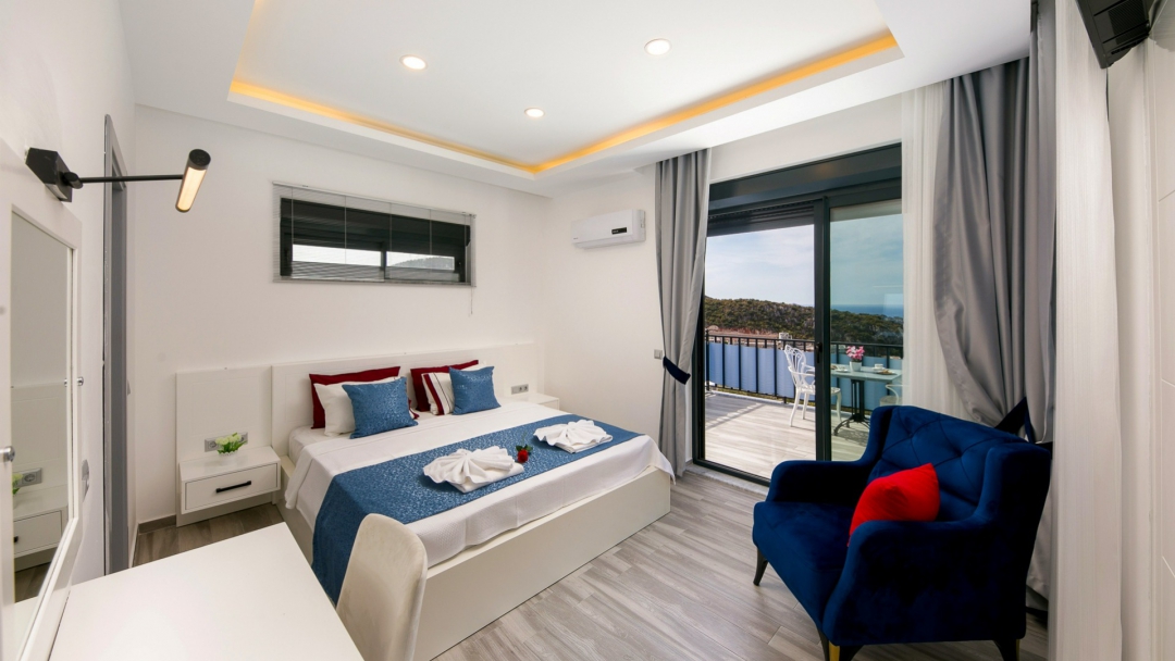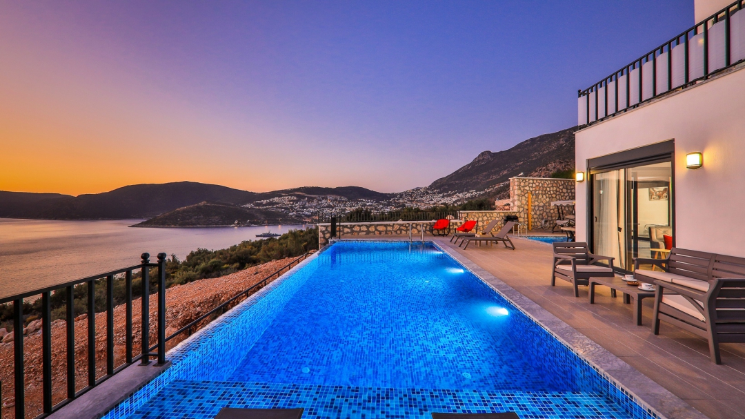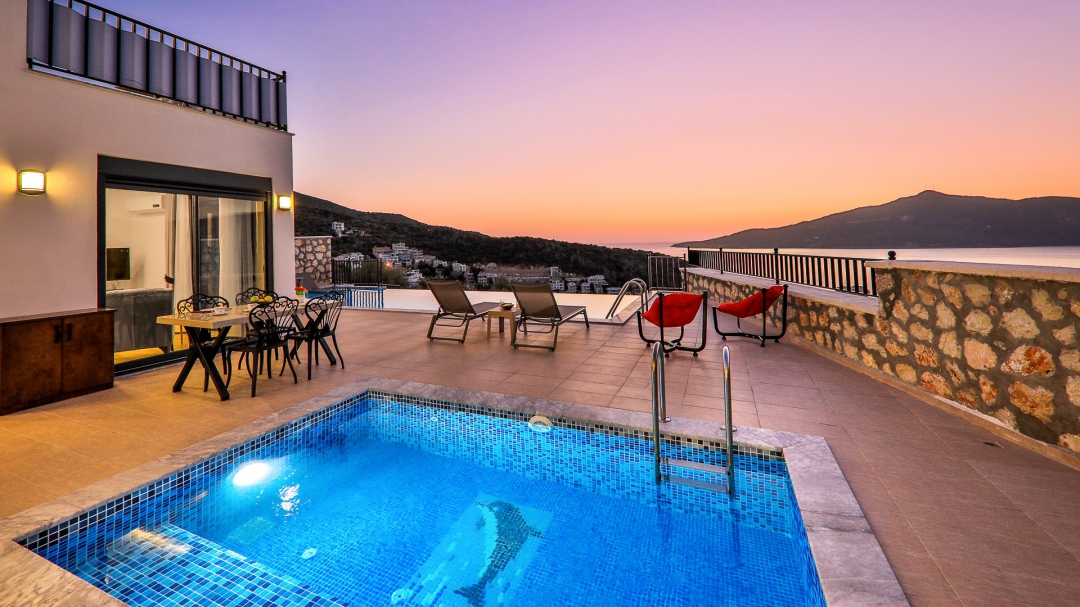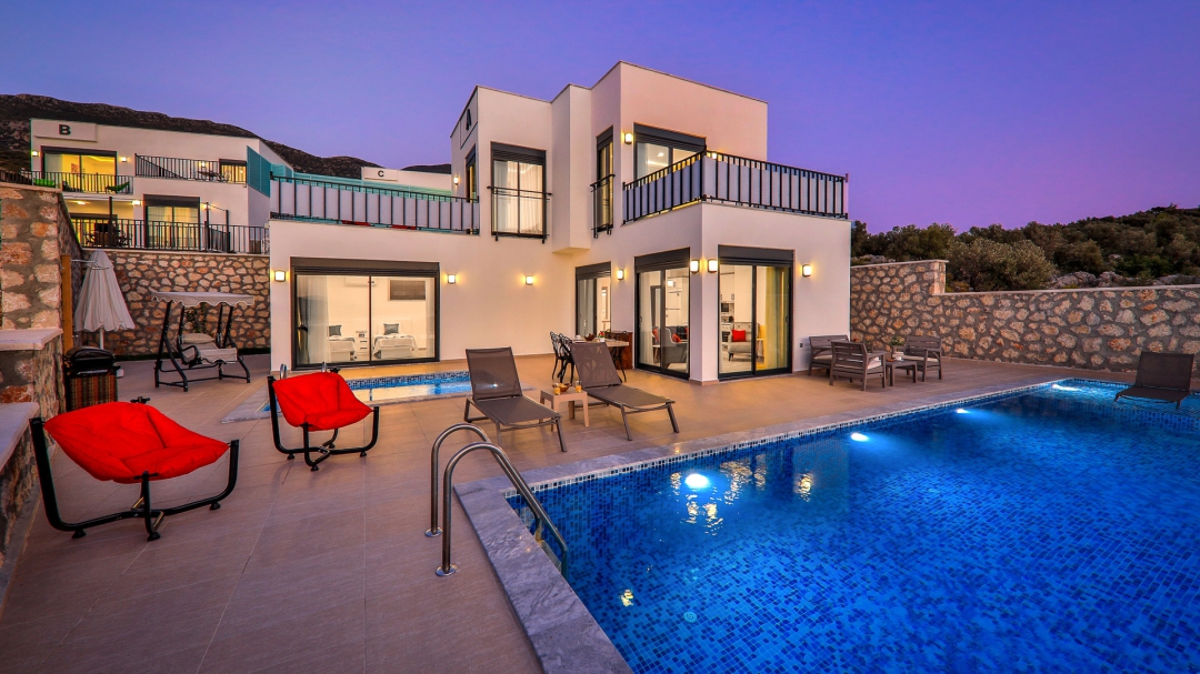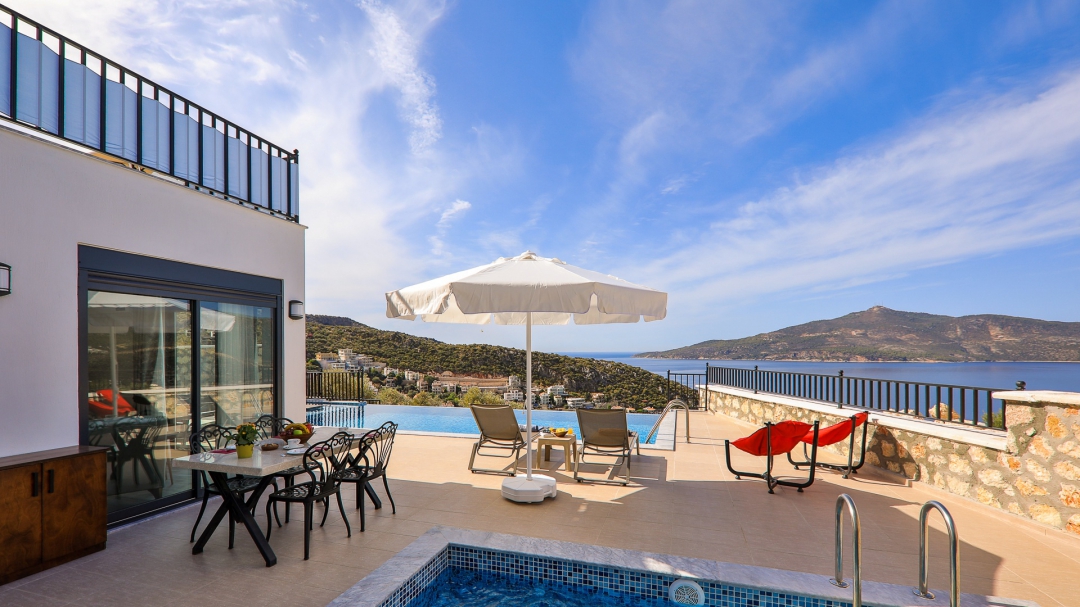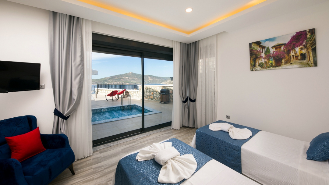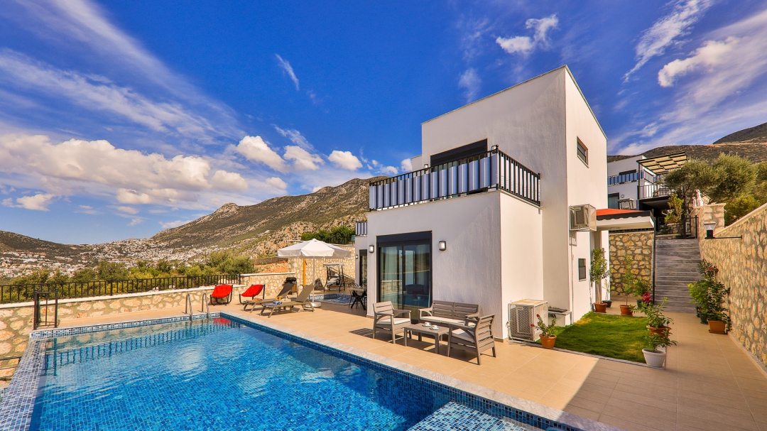Villa, balayı çiftleri ve çekirdek aileler için uygundur. Deniz manzaralı ve ıstmalı havuzludur. Kalkan yakınında, Kışla bölgesinde yer alır. Ana yatak odası jakuzilidir. 4 kişiye kadar konaklama kapasitesine sahiptir. Isıtmalı olan küçük havuz 2.50 x 3.50 genişliğinde, 1.00 m derinliğindedir.