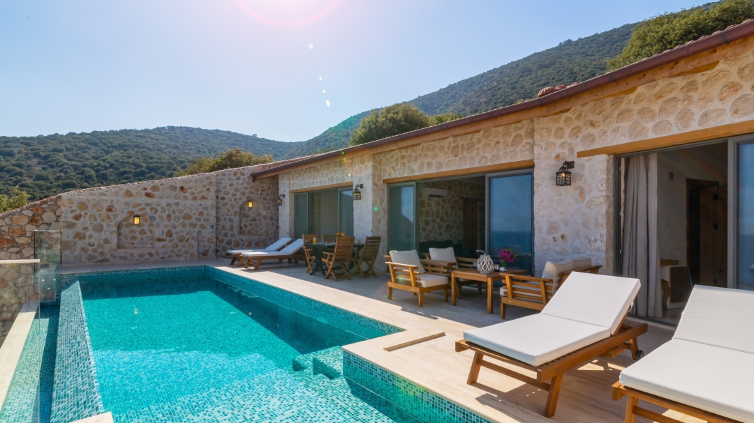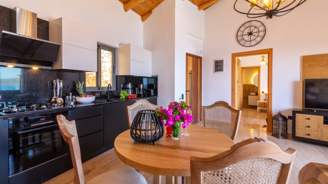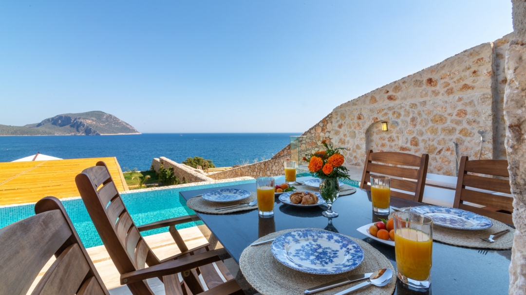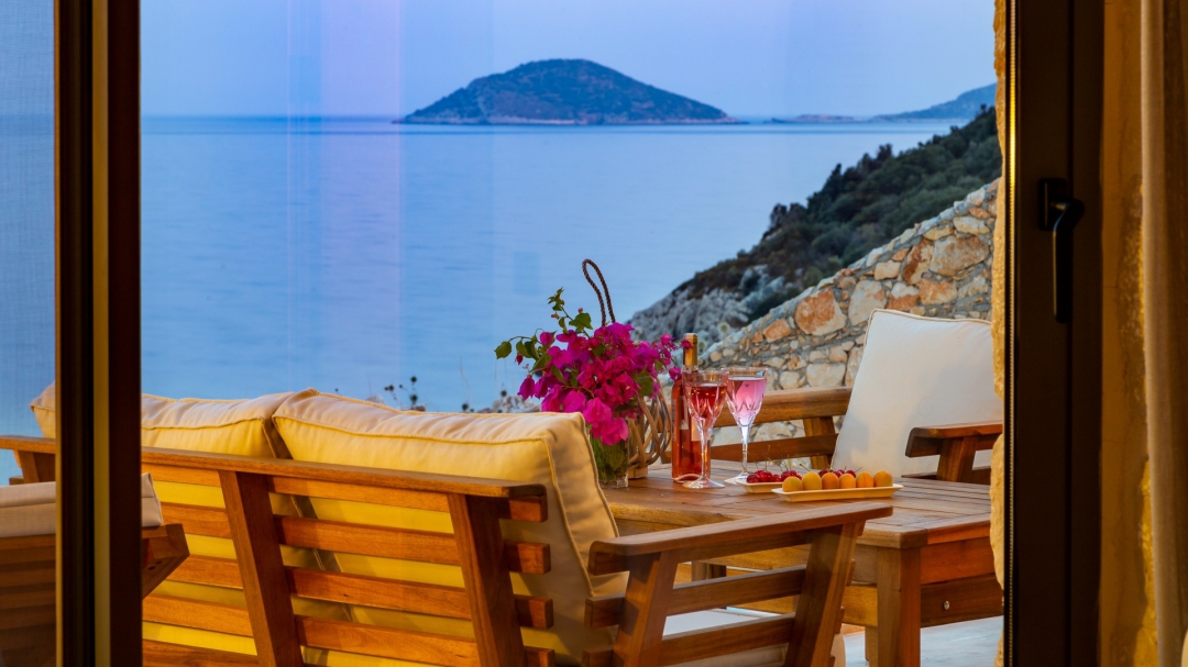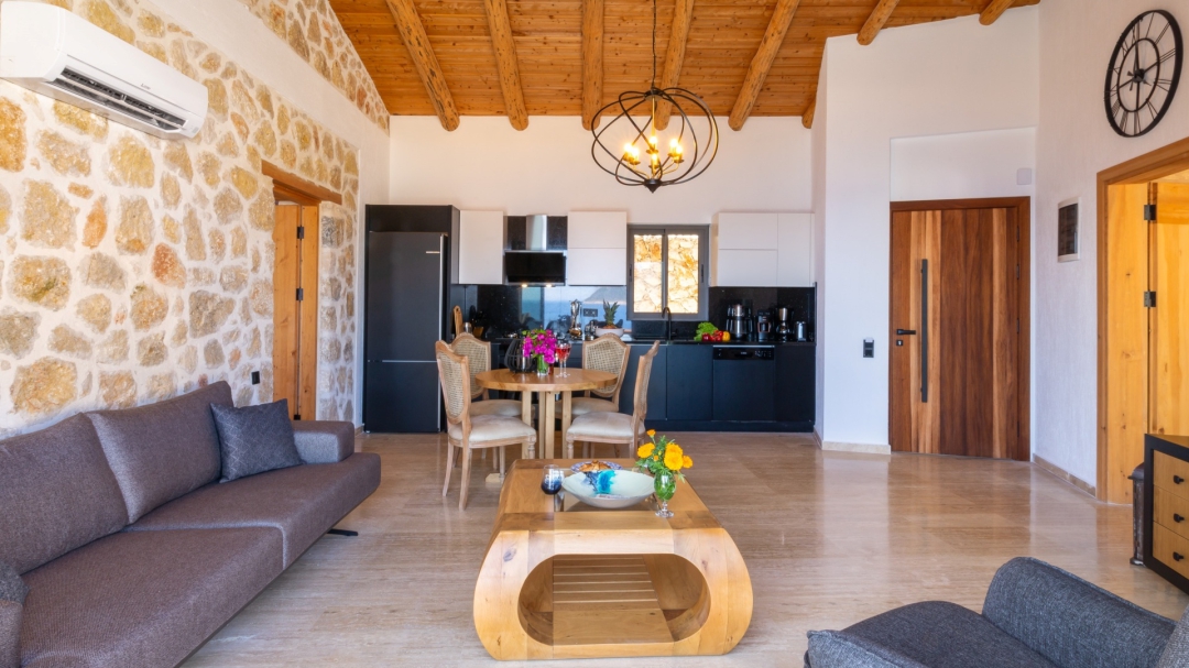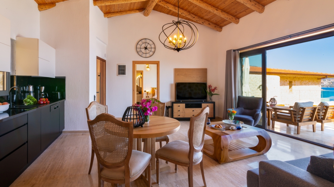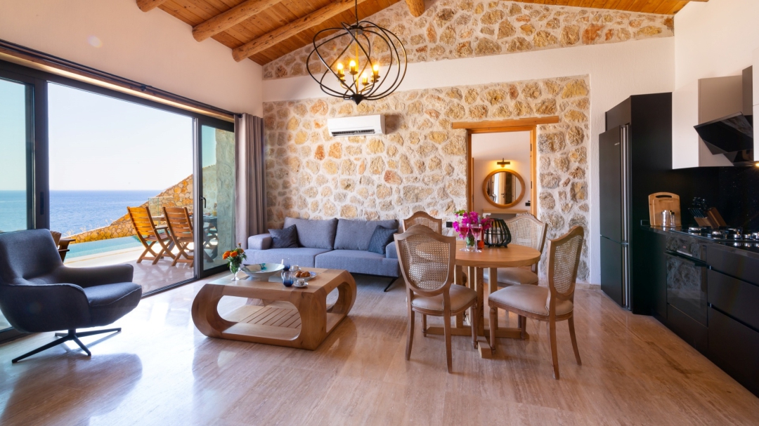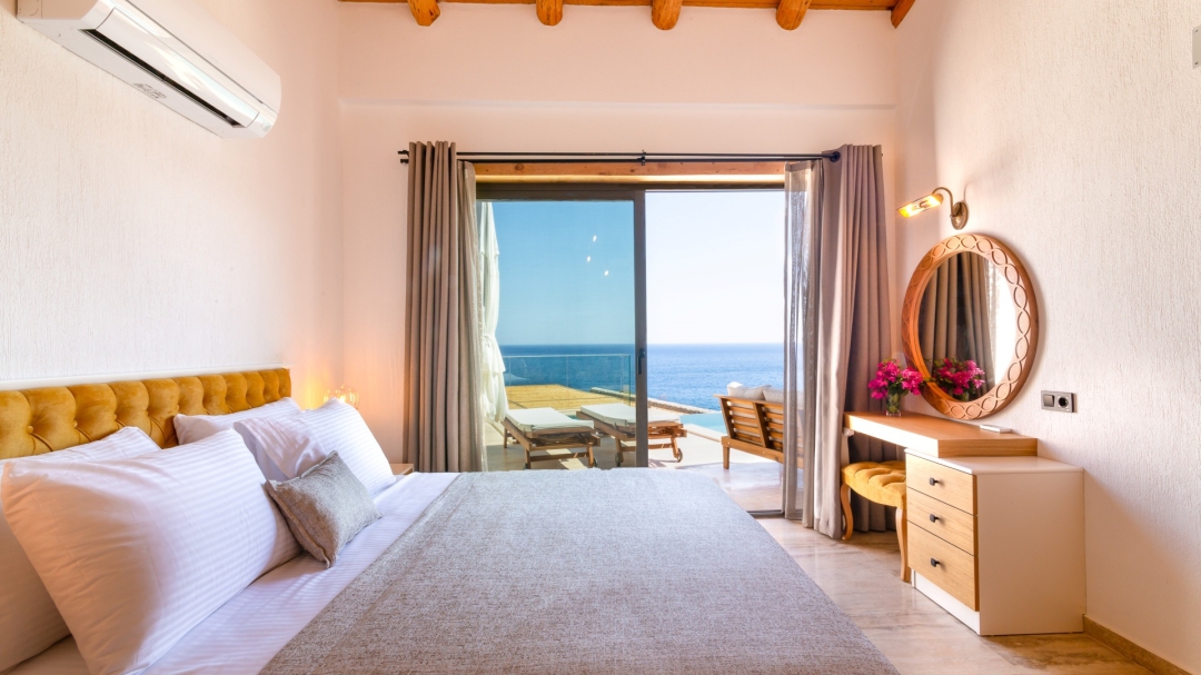 Özel plaj, deniz manzaralı 4 kişilik villa, Kalamar koyunda yer alan bir seçenek. Güneydoğuya bakacak şekilde konumlandırılmıştır. Denizin sesini  duyabileceğiniz villa oldukça sade ve zevkli döşenmiştir.