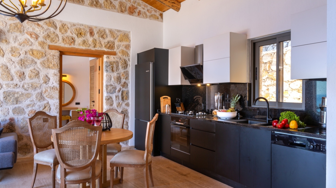 Salon ve mutfak ise göz yormayan zevkli mobilyalar ve renklerle dekore edilmiş. Mutfak için kullanılan koyu renk mekana hoş bir kontrast katmaktadır.