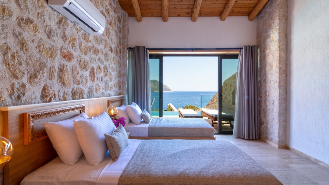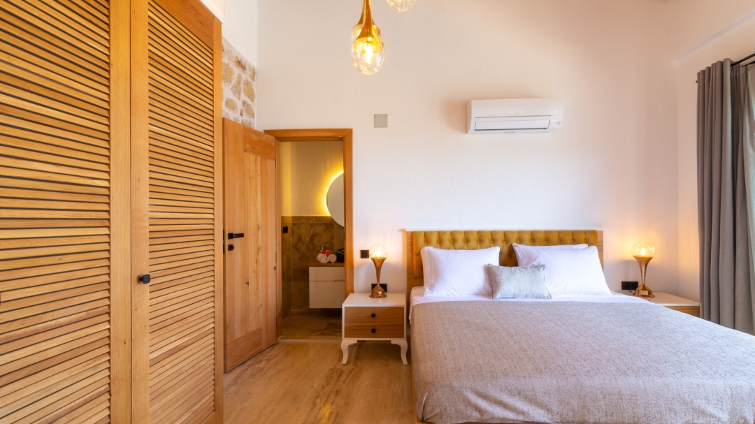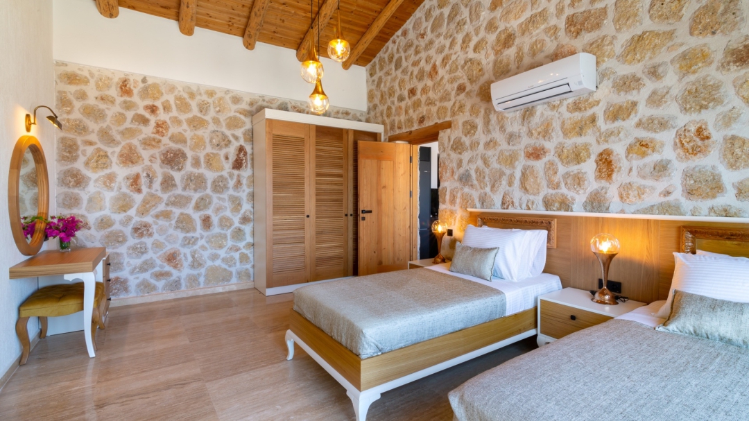 Tek kattan oluşan villada 2 yatak odası bulunmaktadır. Her iki ebeveyn banyolu odada da makyaj masası, elbise dolabı, komodin, havuz alanına çıkış bulunmaktadır. Birinde iki adet tek kişilik yatak, diğerinde çift kişilik yatak bulunmaktadır.