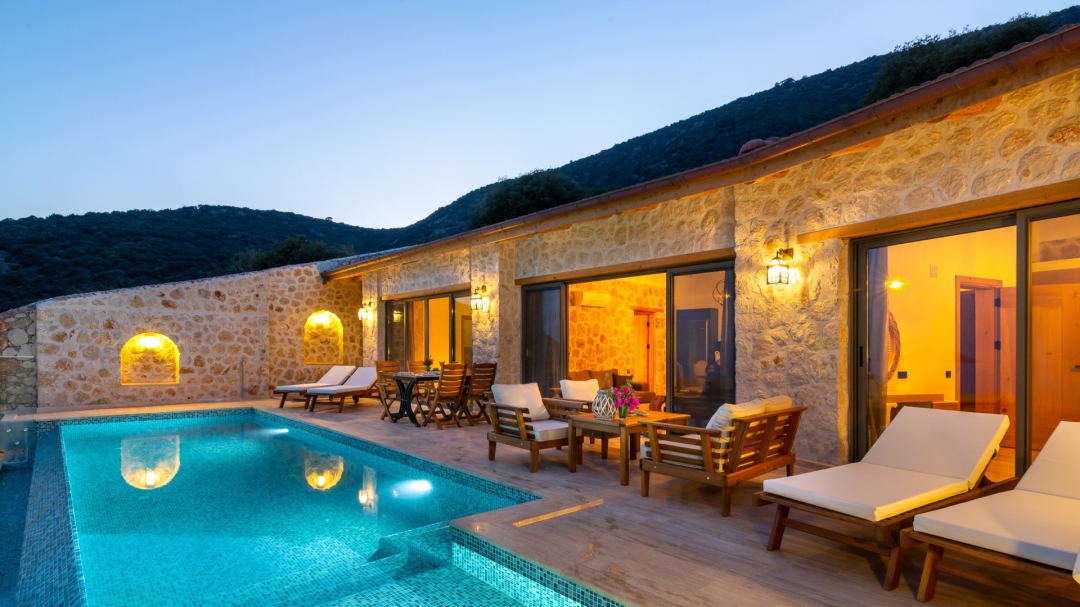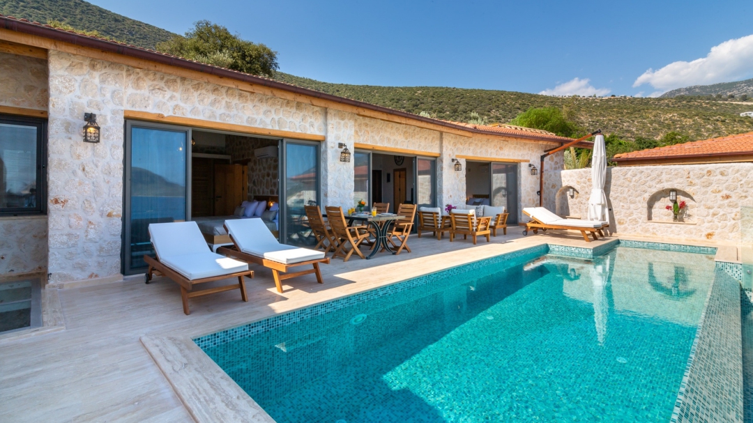 Havuz alanında oturma grubu, şezlong, yemek masası ve şemsiye gibi ekipmanlar bulunmaktadır.